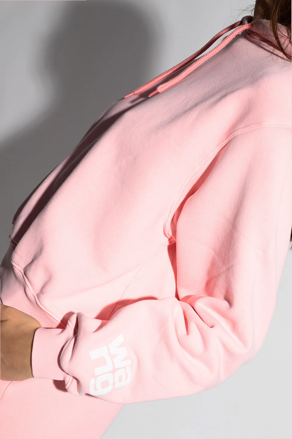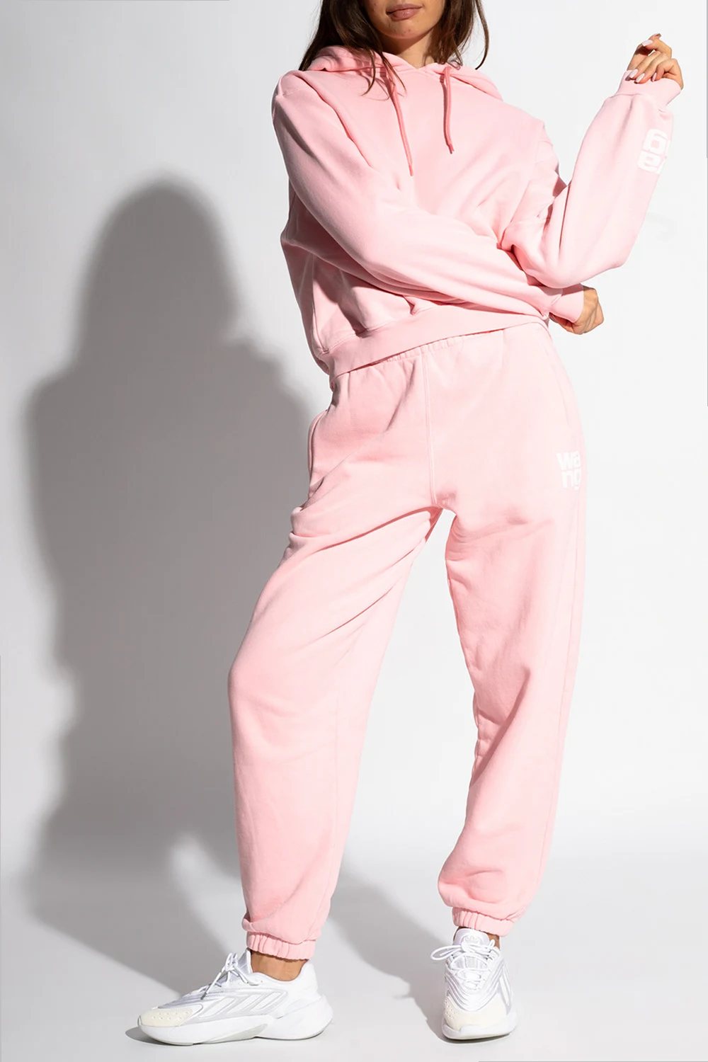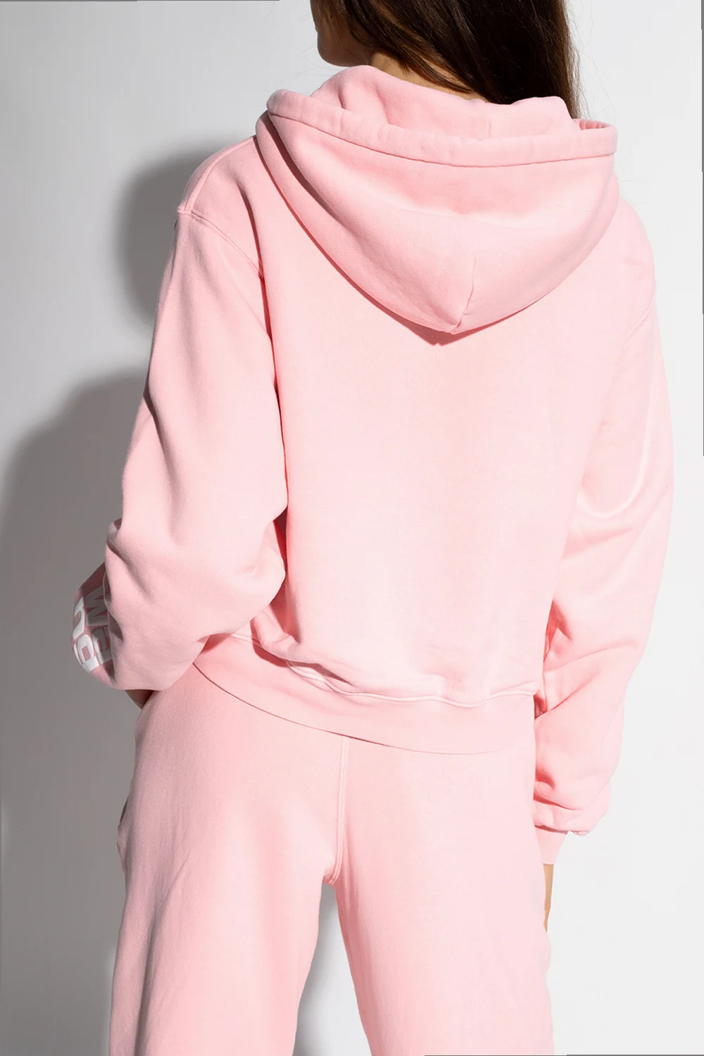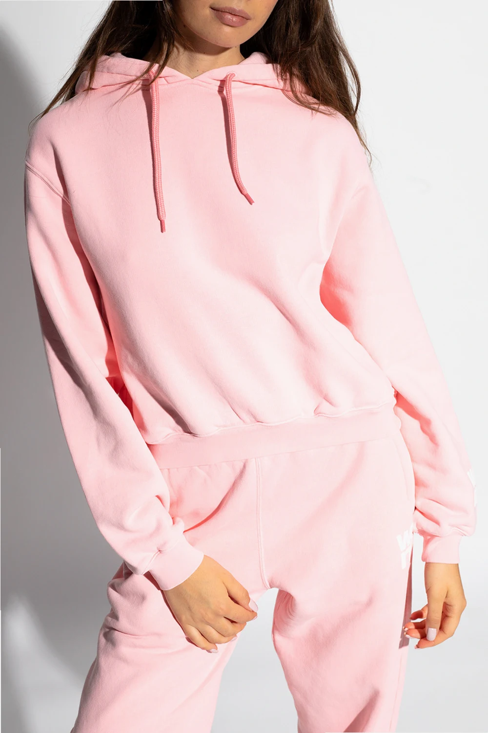 Light pink sweatshirt with a drawcord-adjustable hood from T by Alexander Wang. Crafted from cotton jersey, this hoodie showcases ribbed trims on the edges and a white tactile logo detail on the sleeve.