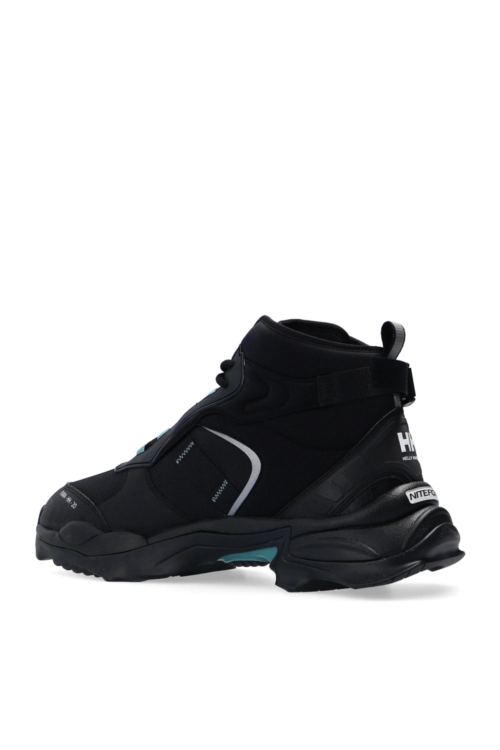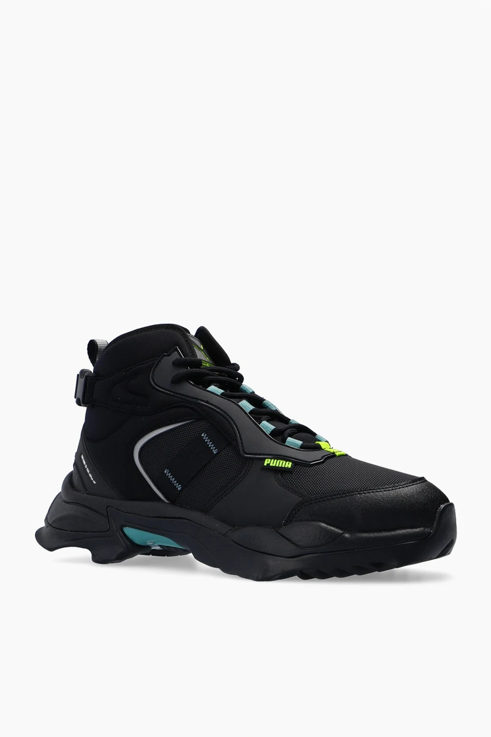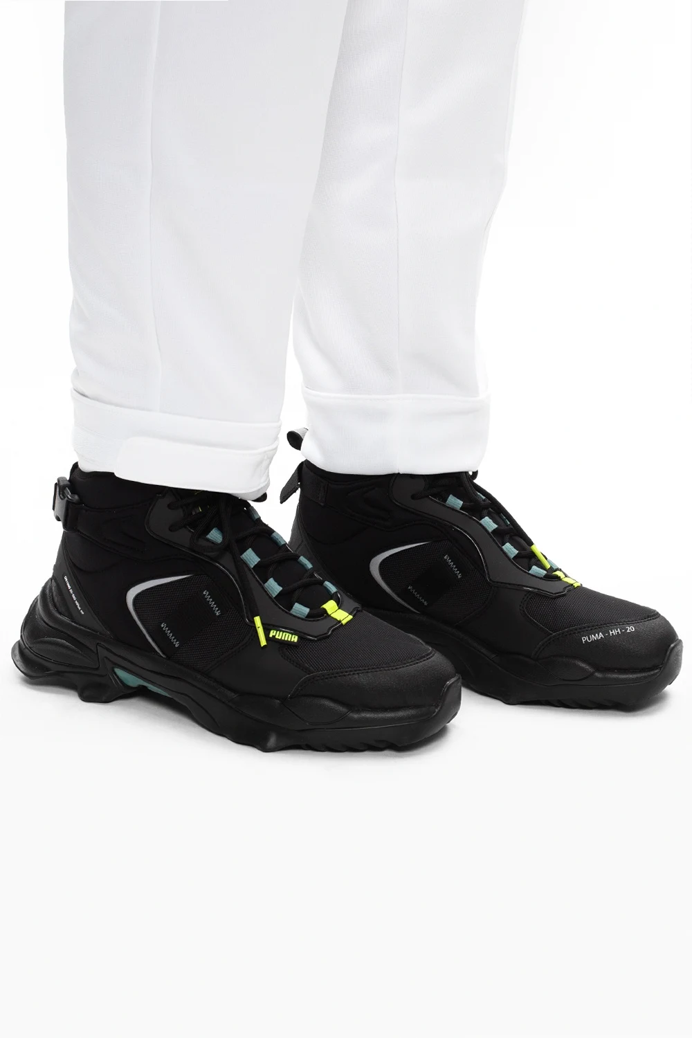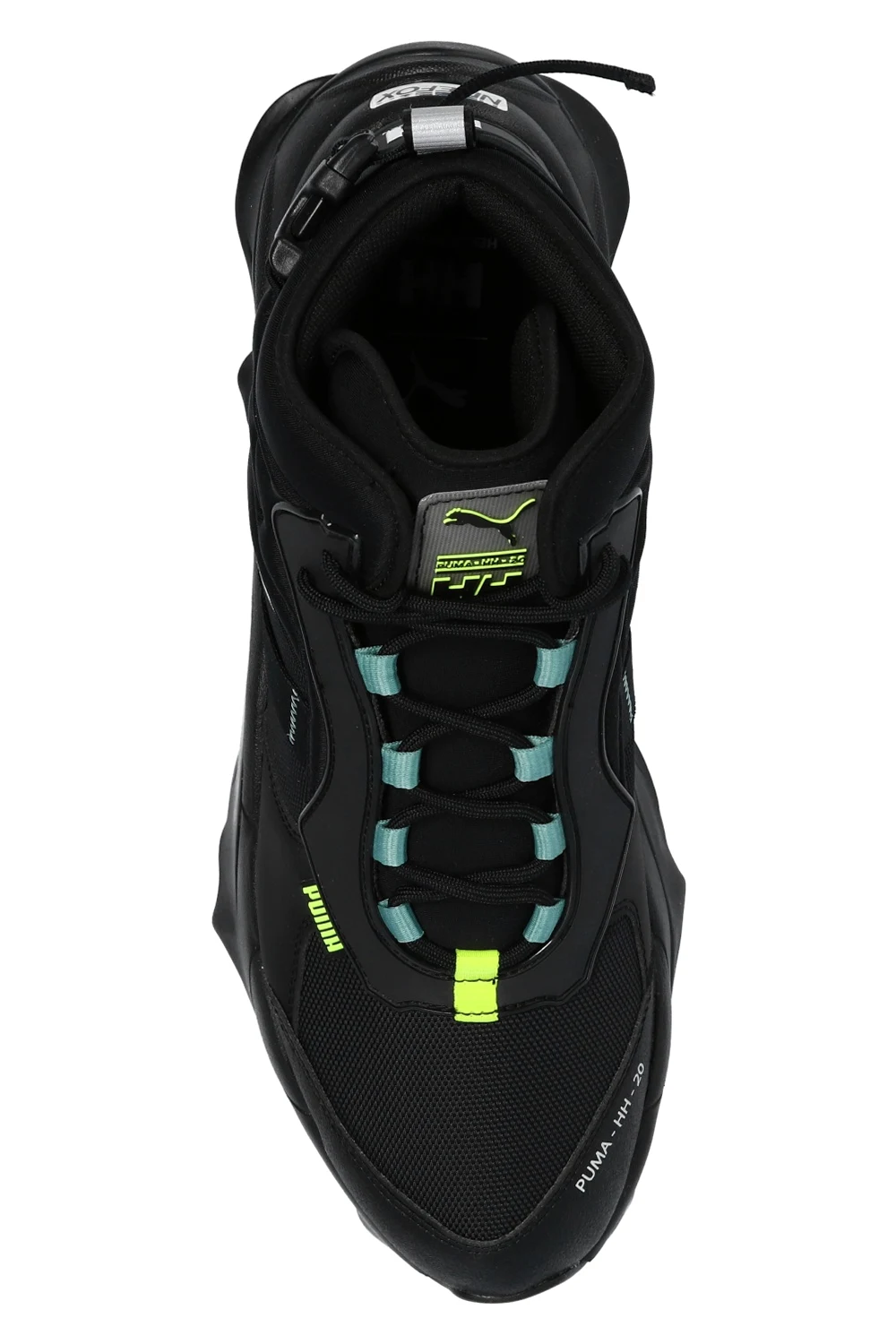Black ‘Nitefox’ sneakers from Puma x Helly Hansen. Sporting a tactile rubber logo detail on the tongue, this high-top pair features lace-up front, a buckle strap and a silver-tone reflective webbing pull tab on the heel and a black robust rubber sole at the base.
