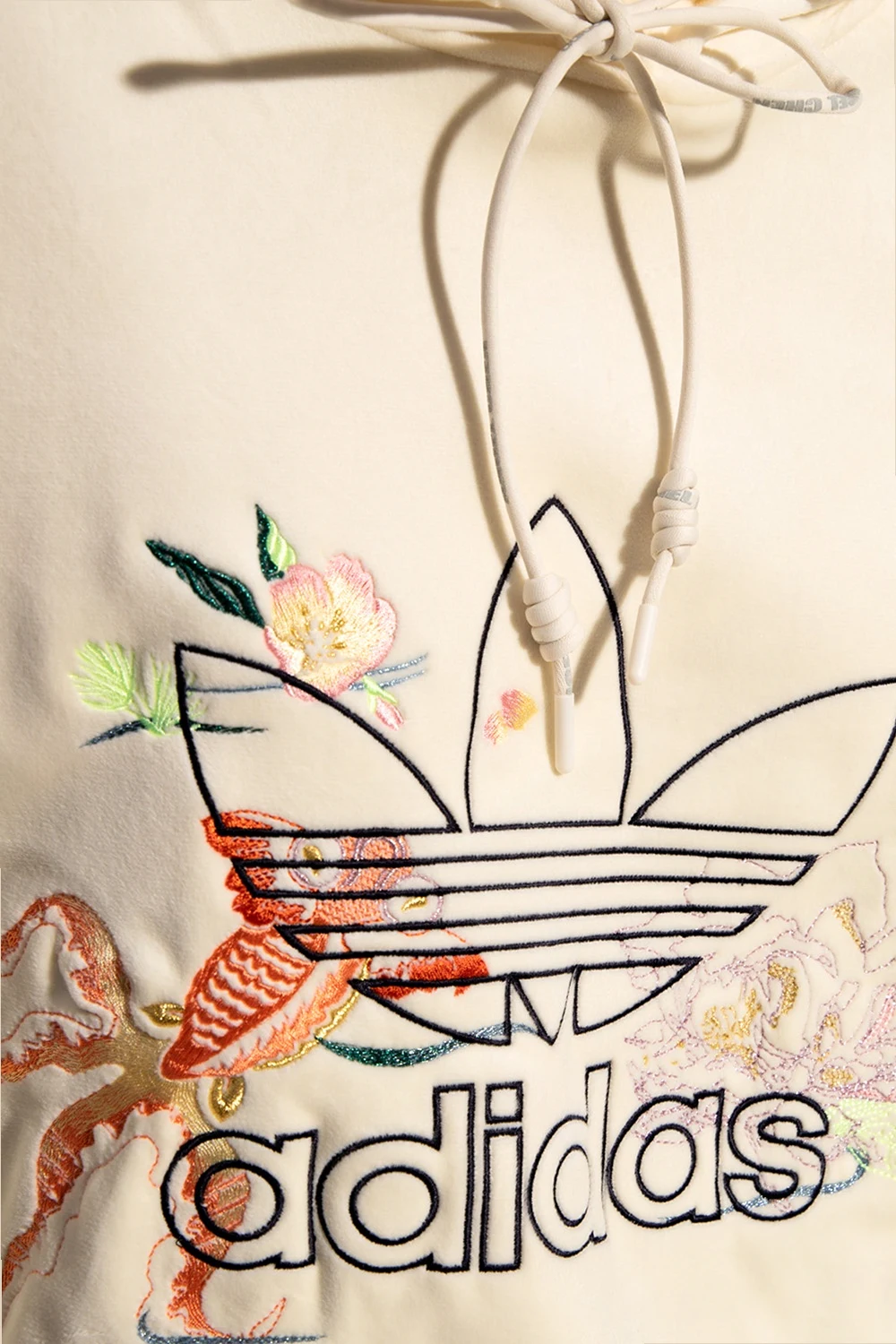Light yellow sweatshirt with a drawcord-adjustable hood from ADIDAS Originals x Angel Chen. Crafted in velour, this hoodie features colourful graphic lurex embroidery with an accompanying logo, ribbed trims and the brand's iconic three stripes on the sides.