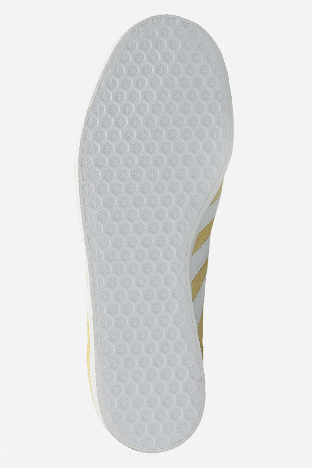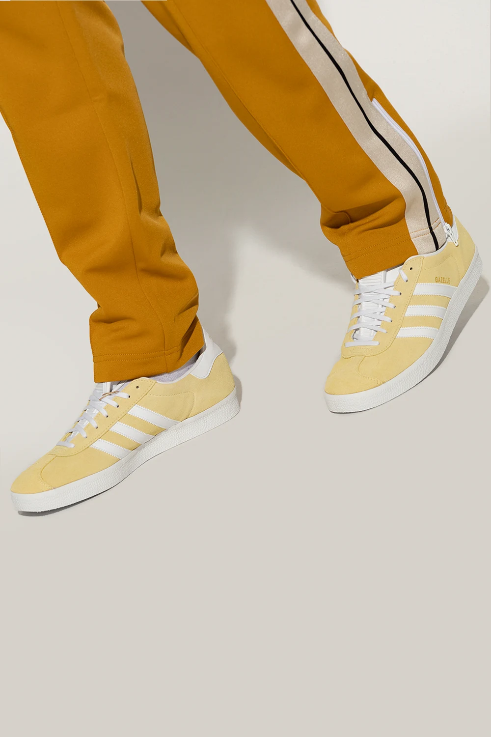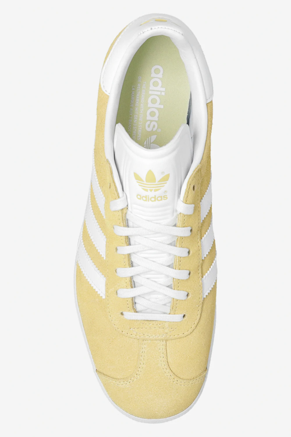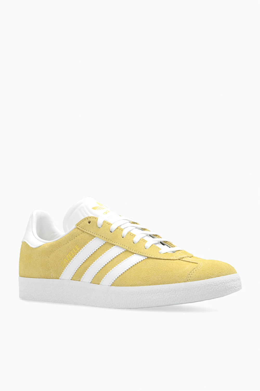 Yellow and white ‘Gazelle’ sneakers from ADIDAS Originals. Crafted from suede, this lace-up model sits on a white rubber sole and showcases the brand's logo and its signature three stripes.