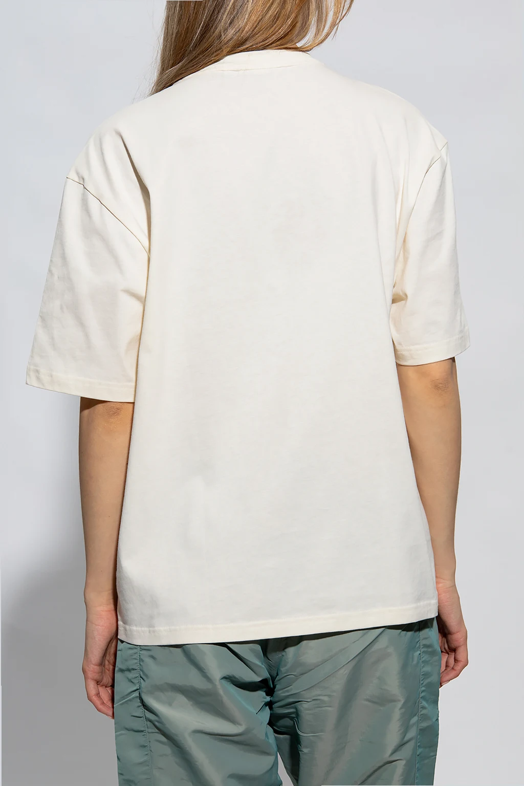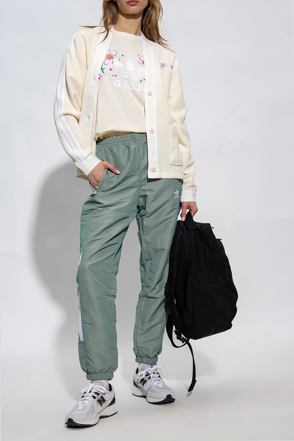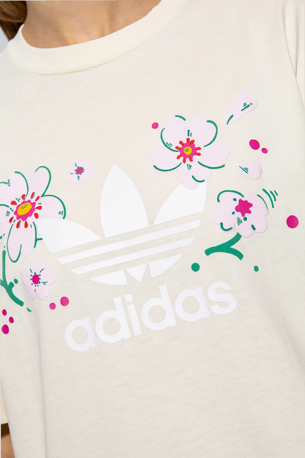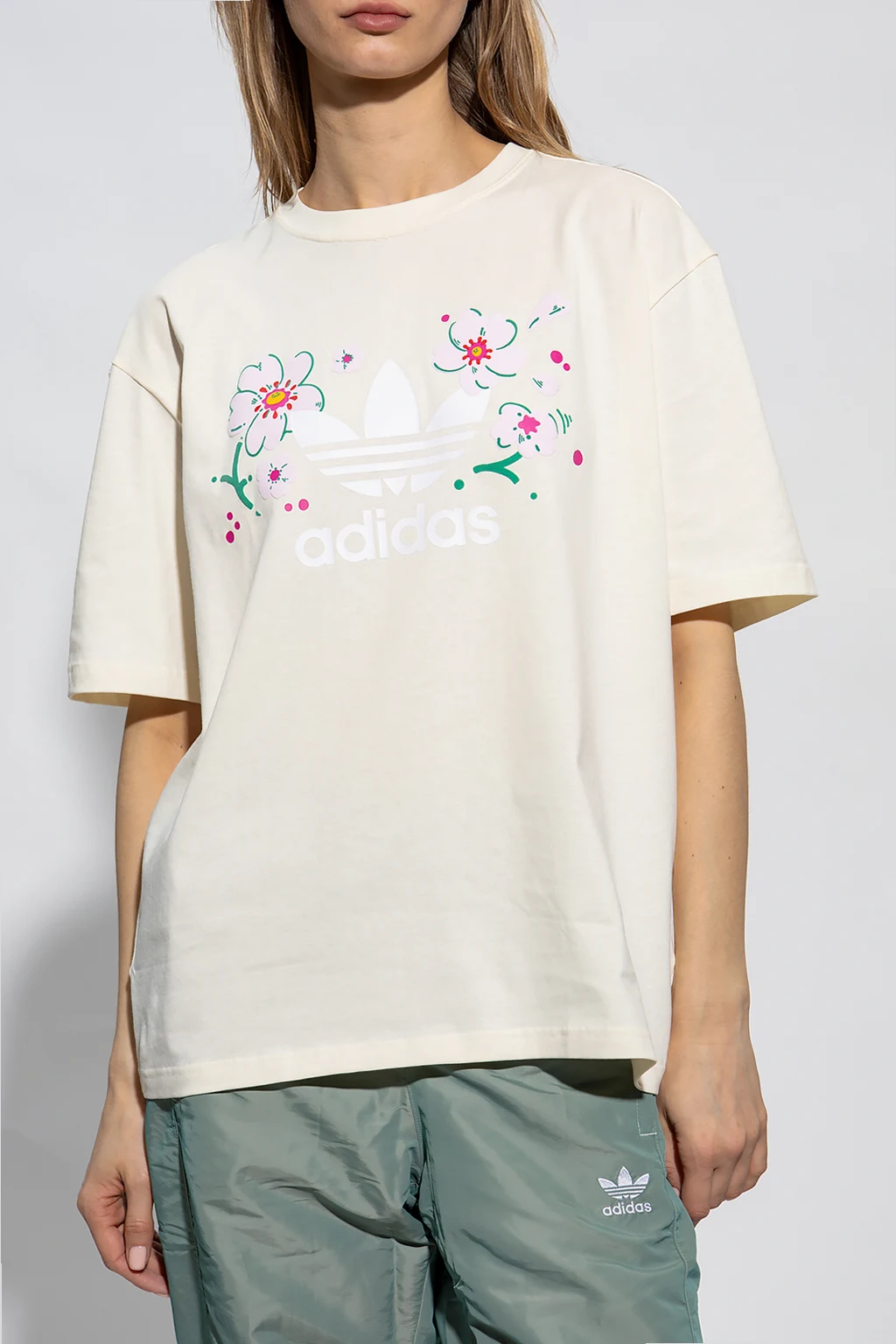 Light yellow loose-fitting T-shirt from ADIDAS Originals. Made of cotton, this short sleeve design features a white, pink and green floral print, logo and ribbed crew neck.