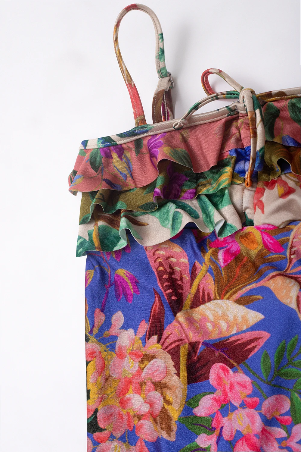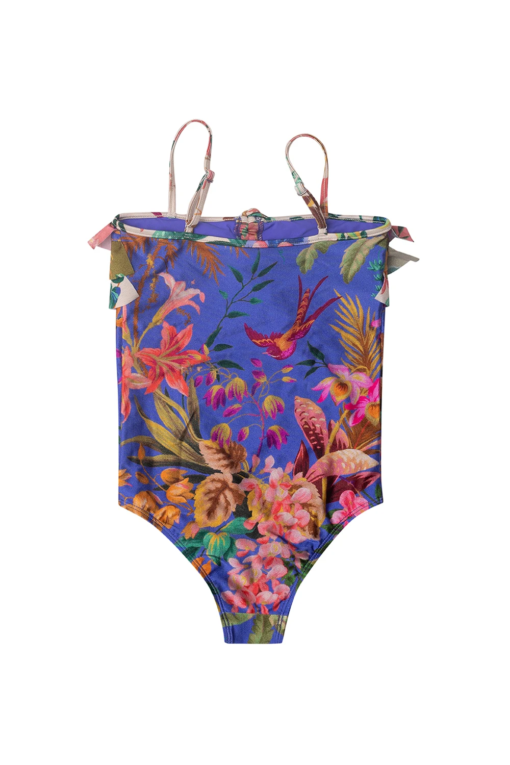 Purple one-piece swimsuit from Zimmermann Kids. Decorated with a multicolored floral motif, this design features ruffles, drawstrings and ruffled straps.