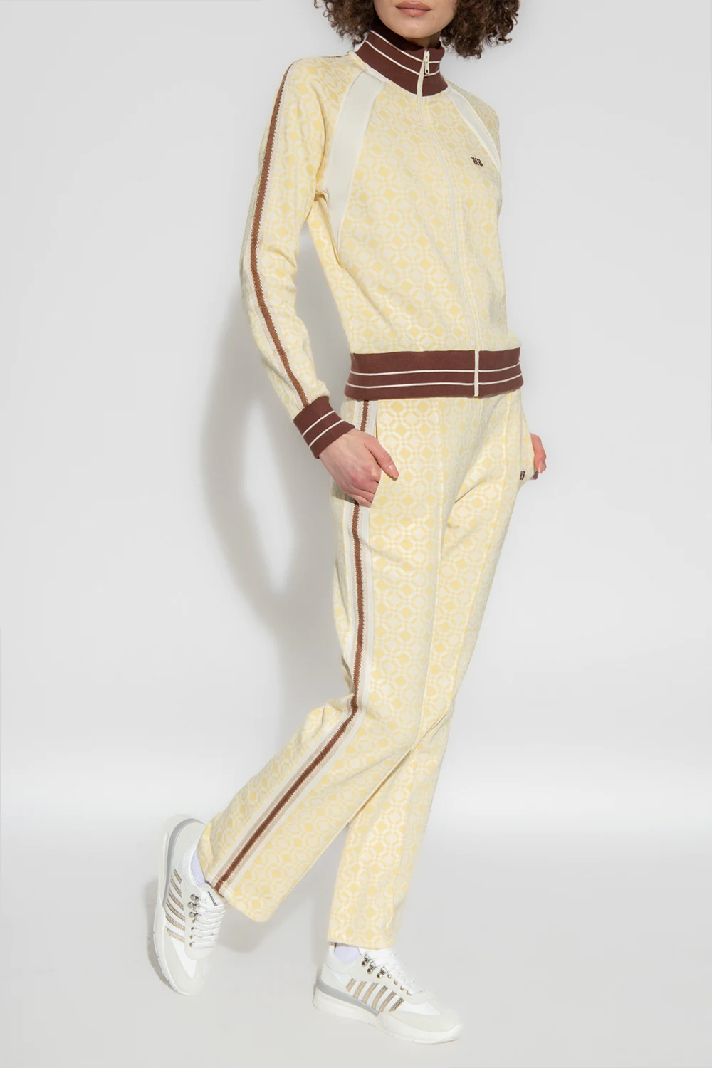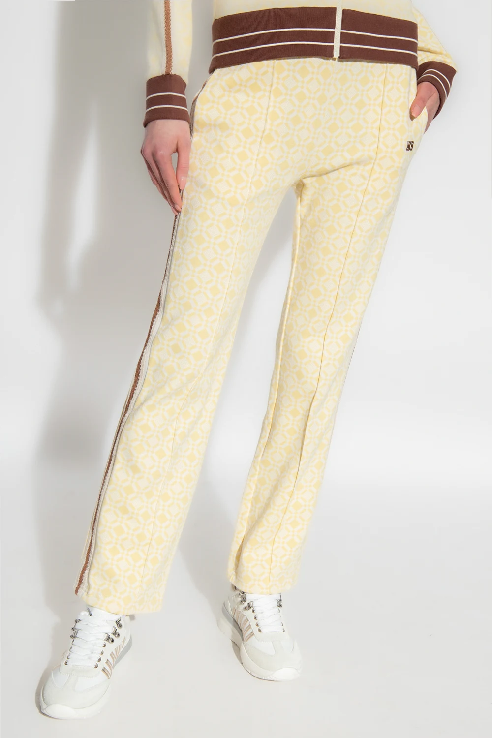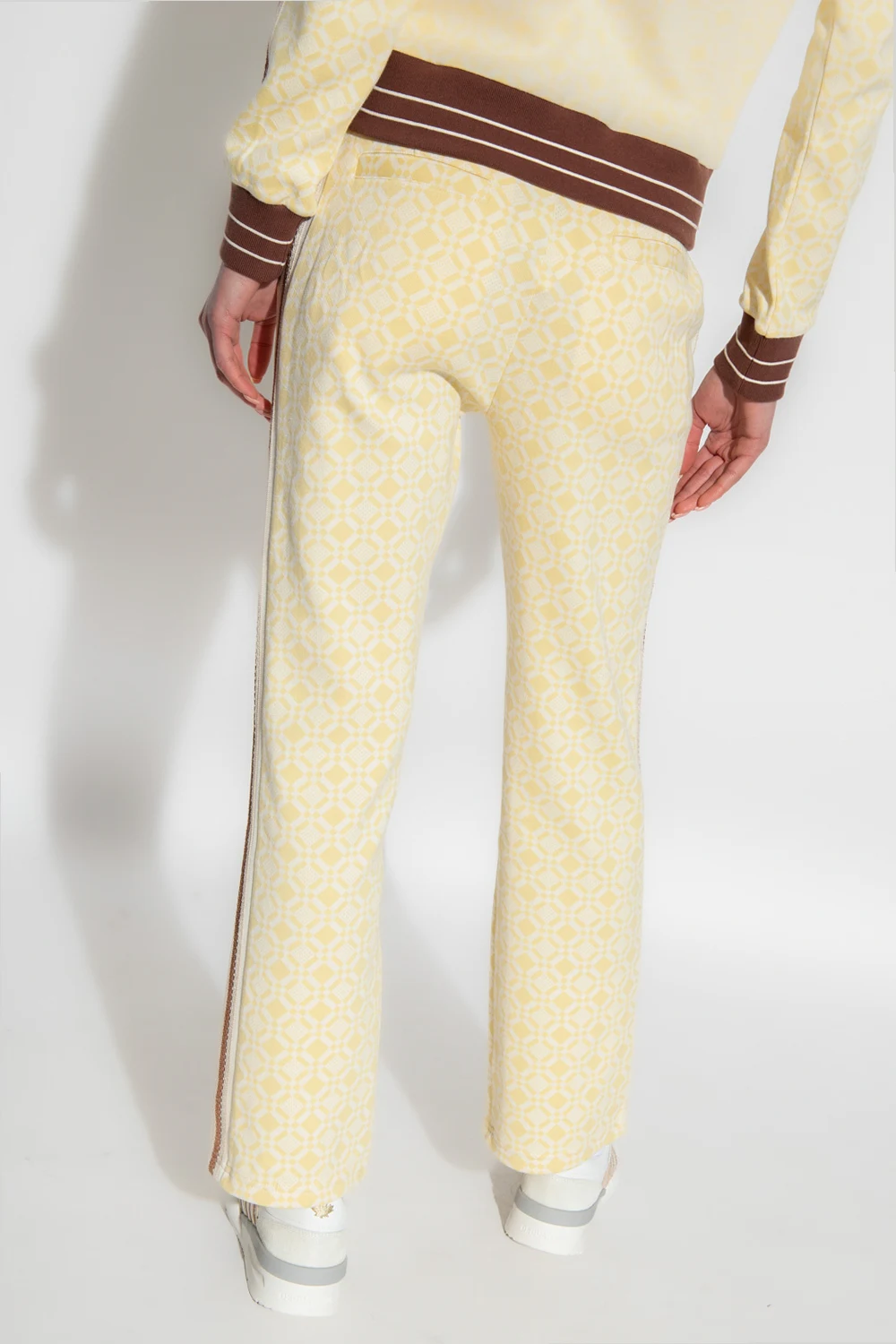 Cream and yellow ‘Shine’ sweatpants from Wales Bonner. Made of organic cotton, this pair features an elastic drawstring waistband, geometric pattern, logo embroidery, cream and brown side stripes, two front pockets and two back pockets.