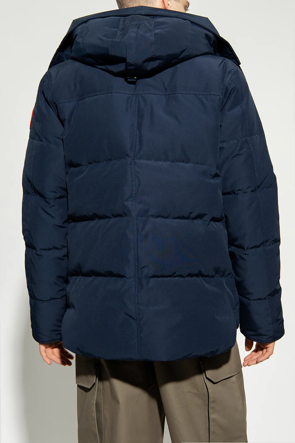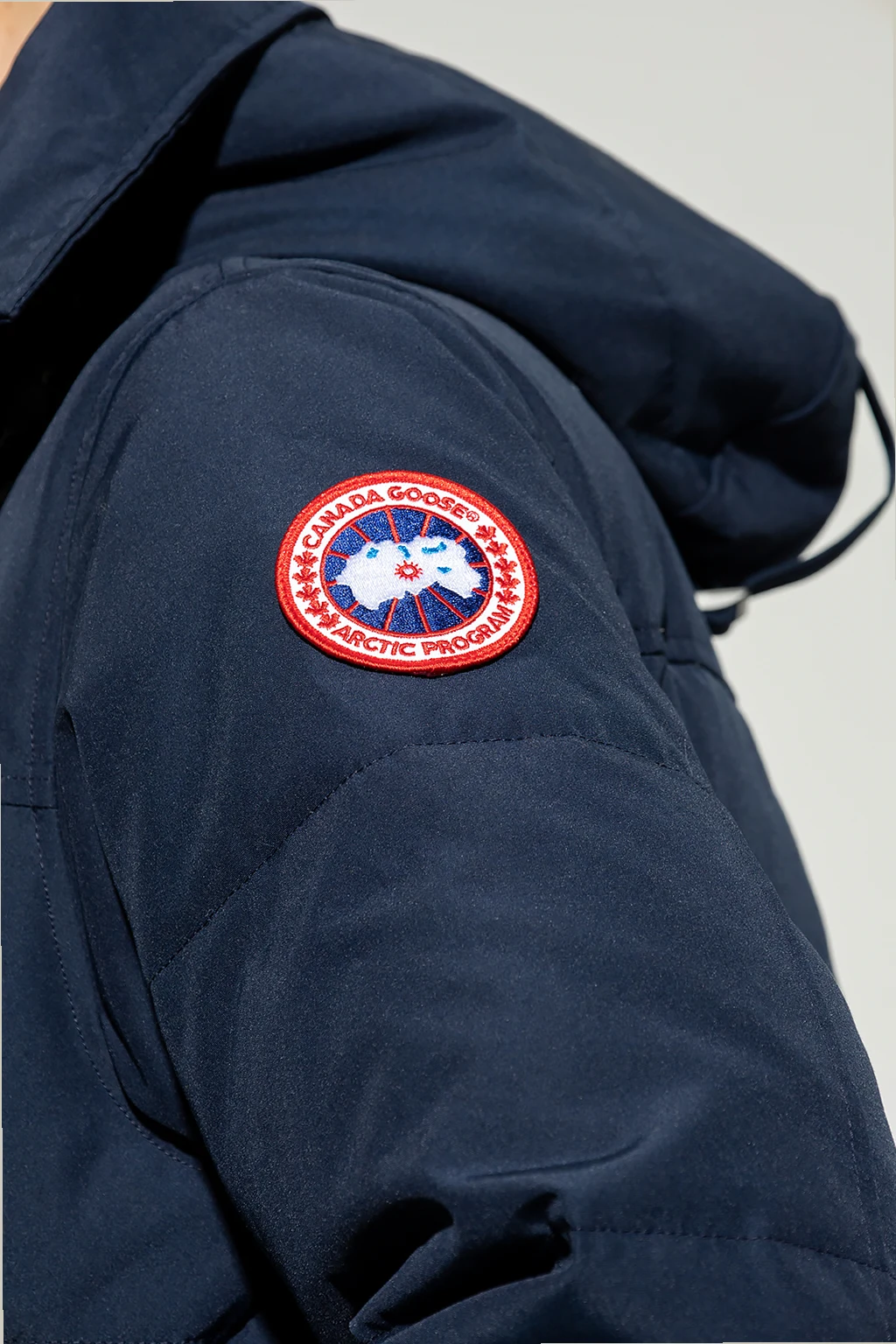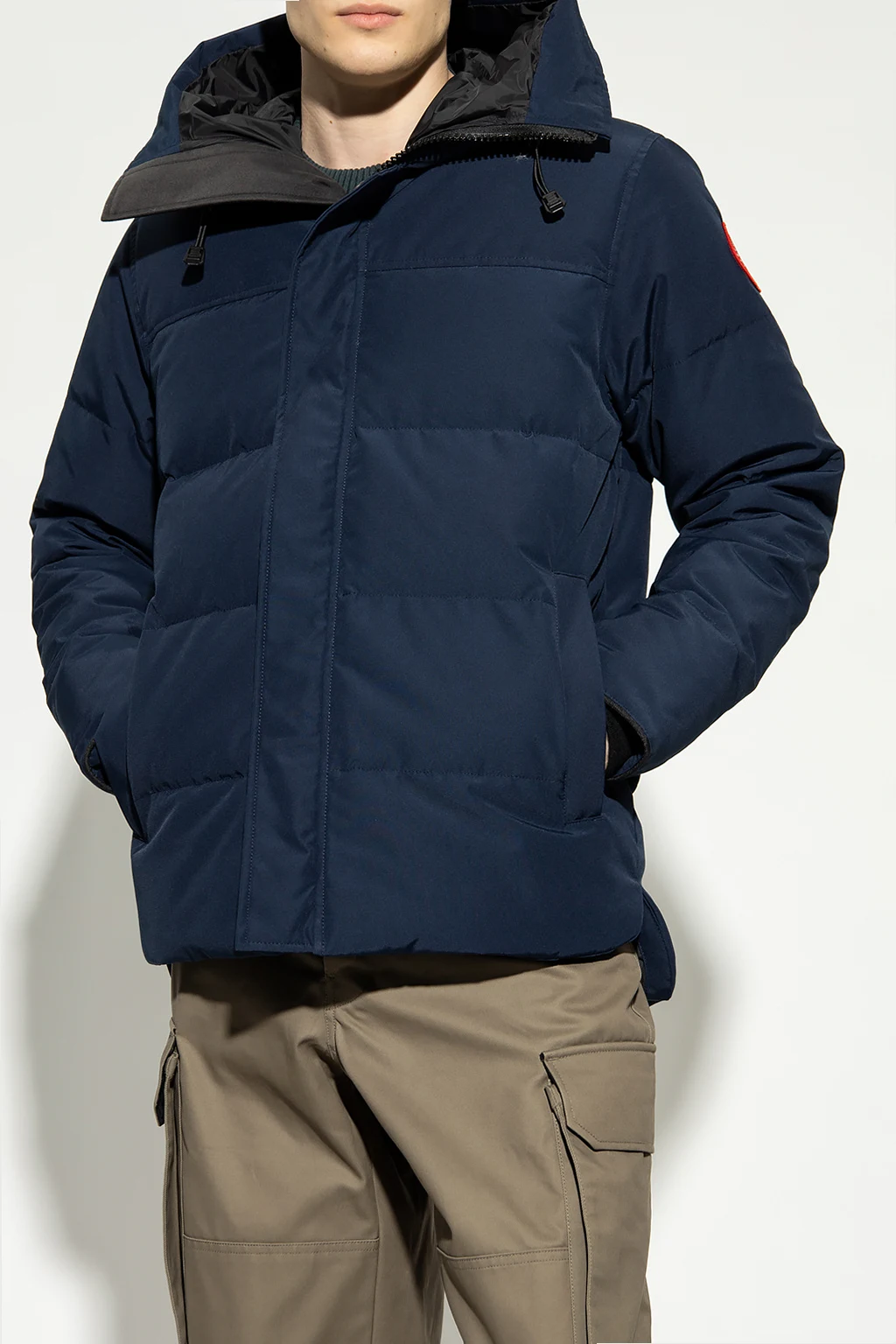 Navy ‘MacMillan’ quilted down jacket from Canada Goose. Fastened with a two-way zip and snaps, this design features a multicolored logo-embroidered patch, two front zip pockets, drawstring hood and long sleeves with ribbed cuffs. Temperature range -10°C to -20°C.