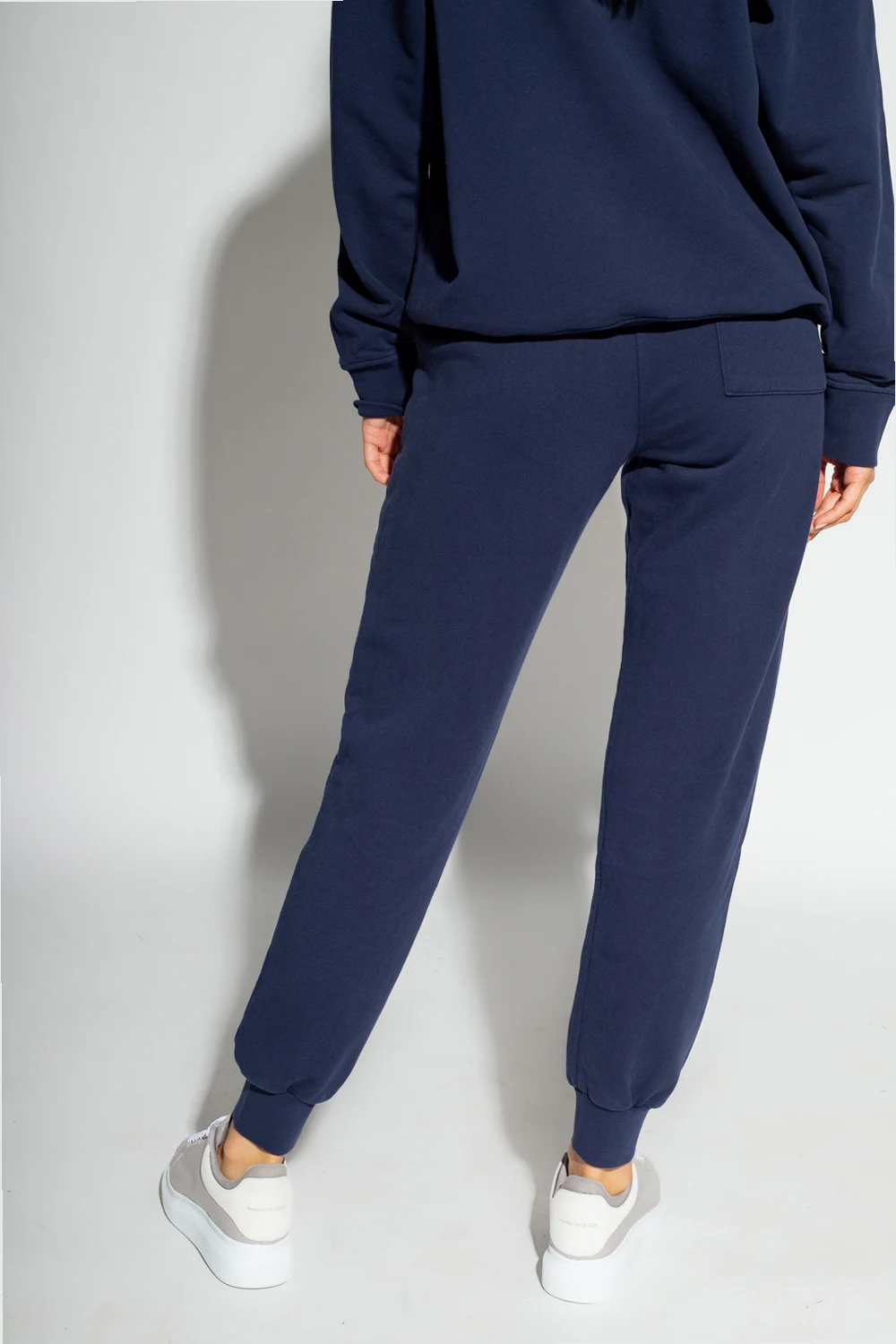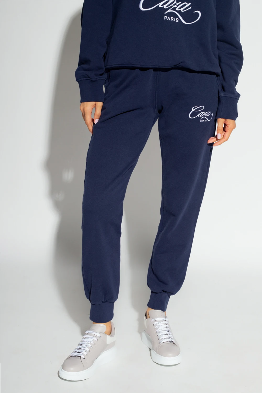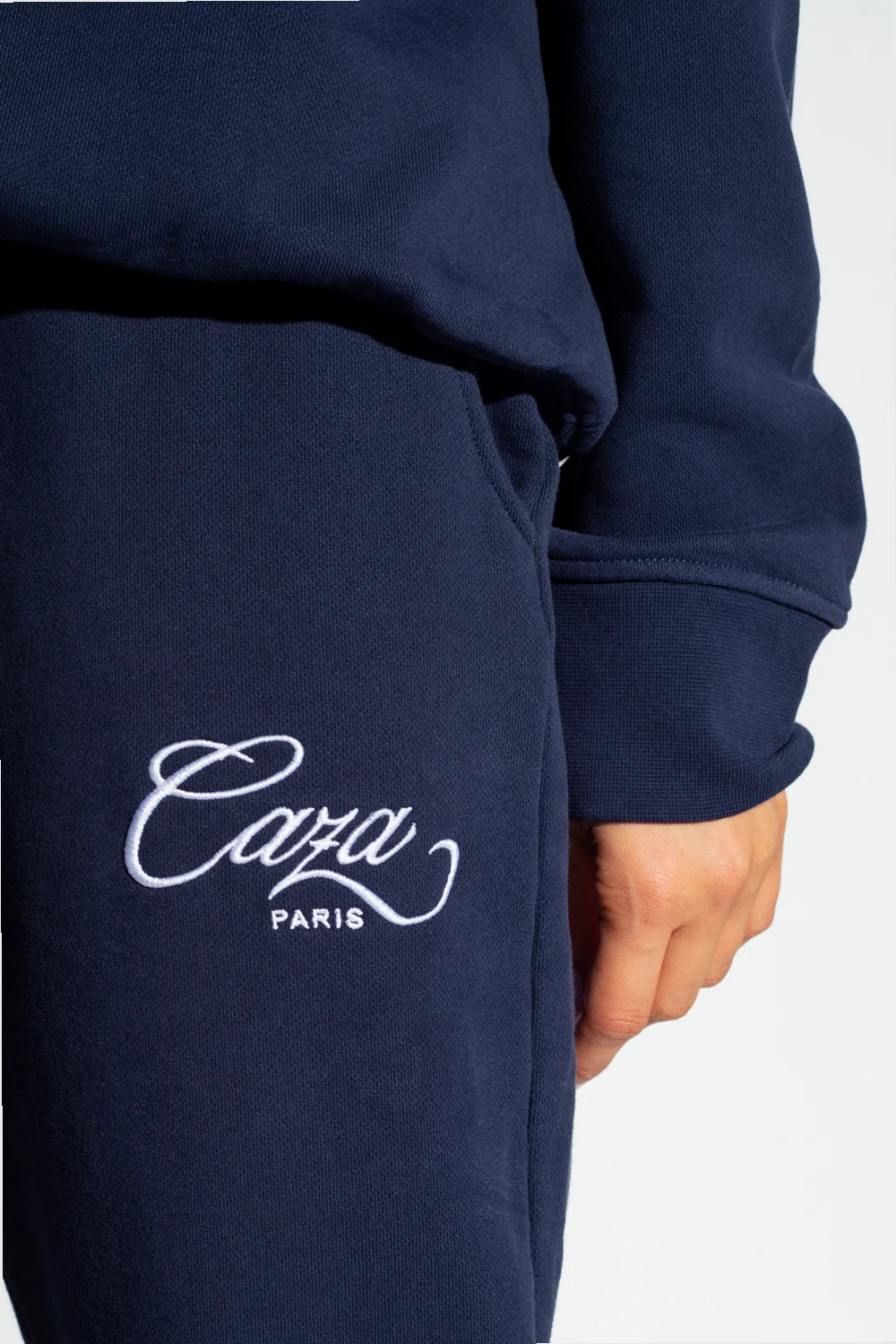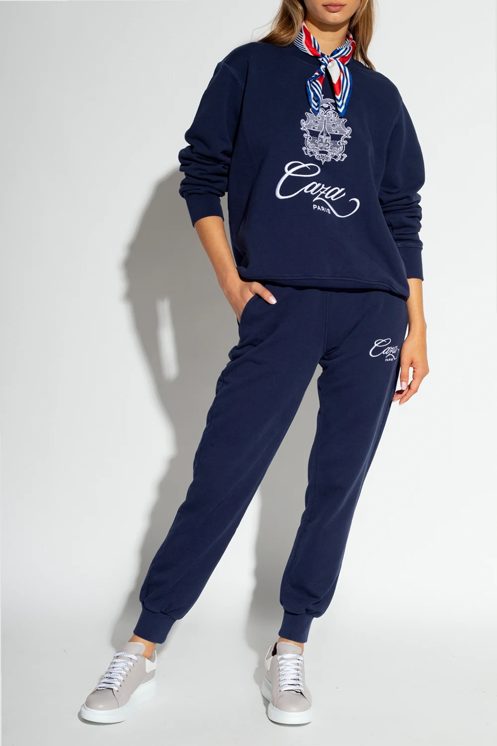 Navy sweatpants from Casablanca. Made of organic cotton, this pair features an elastic drawstring waistband, embroidered logo pattern in white, two front pockets, one back pocket, ribbed cuffs and gold-tone metal hardware.