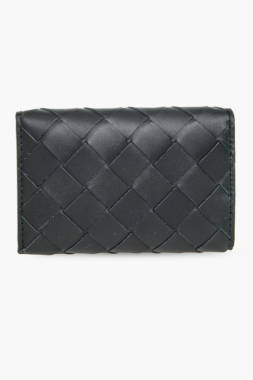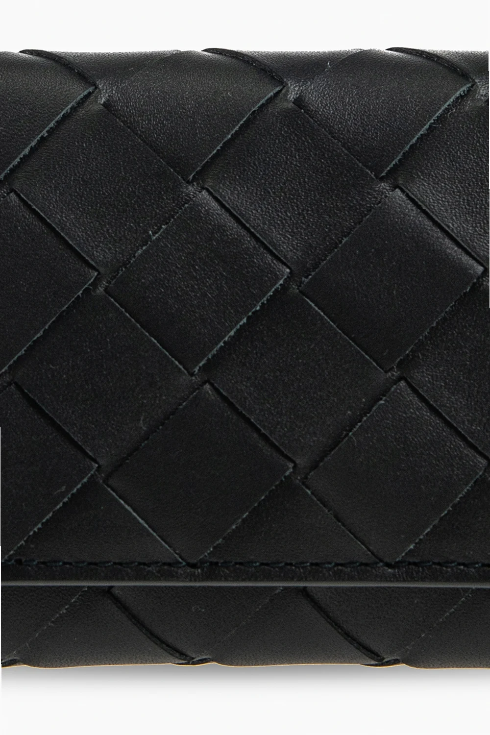 Dark green key holder from Bottega Veneta. Crafted from calf leather with the brand's iconic Intrecciato weave, this design secures with snaps and features a blue-clad interior with one slip pocket and six key hooks inside.