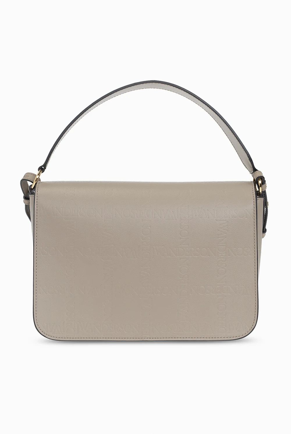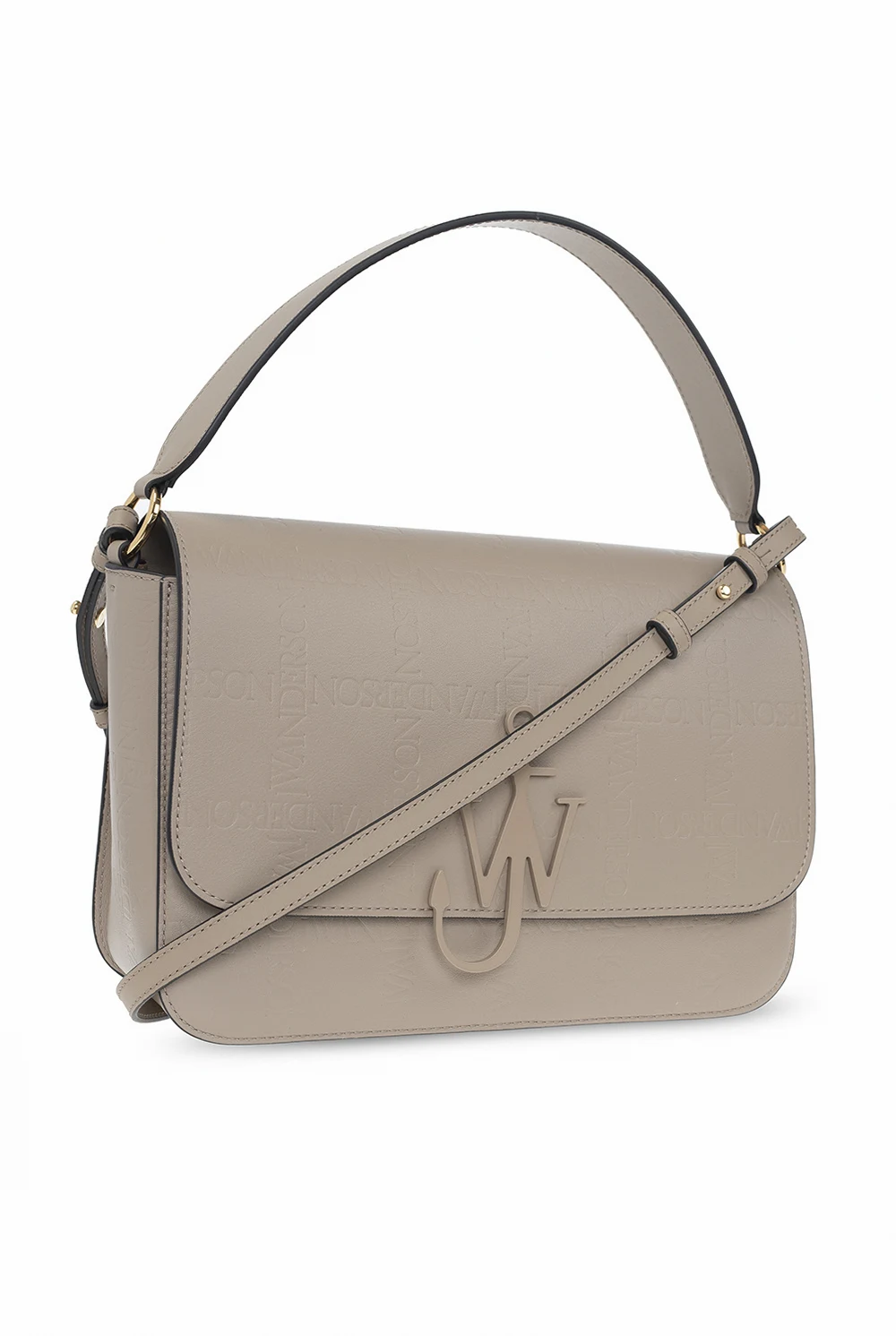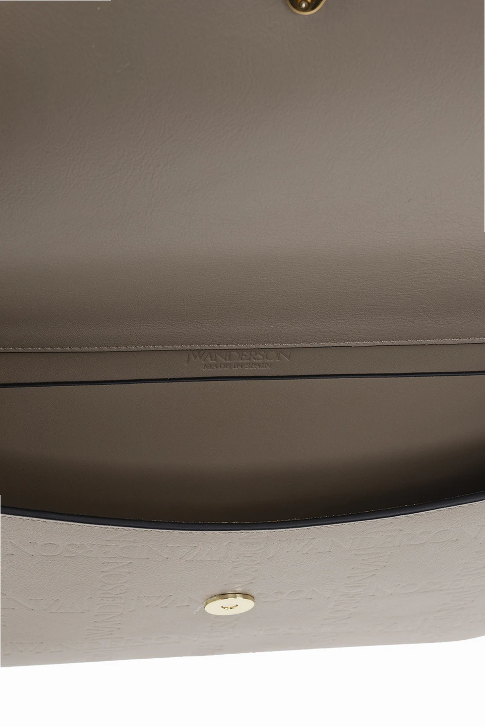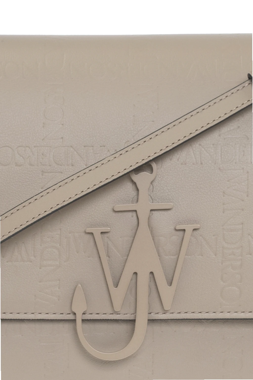 Begie and gray shoulder bag 'Anchor' from JW Anderson. Made of calf leather. Closed with a magnetic clasp. Decorated with an embossed logo. Shoulder strap with adjustable length. One compartment and a slip pocket inside. Metal golden finish.