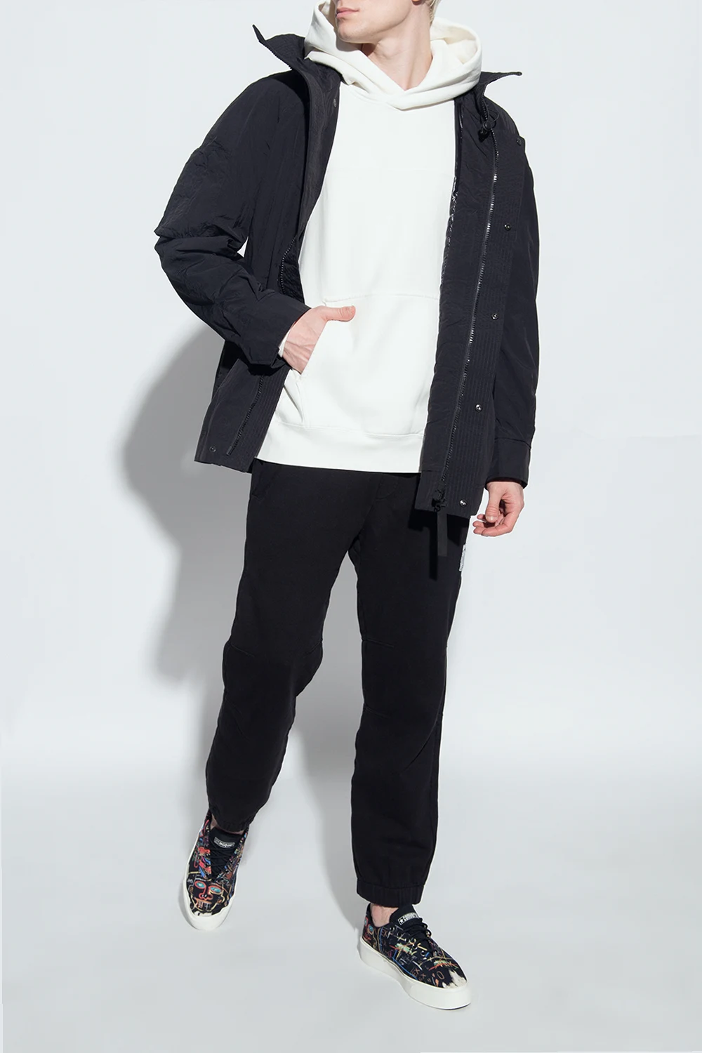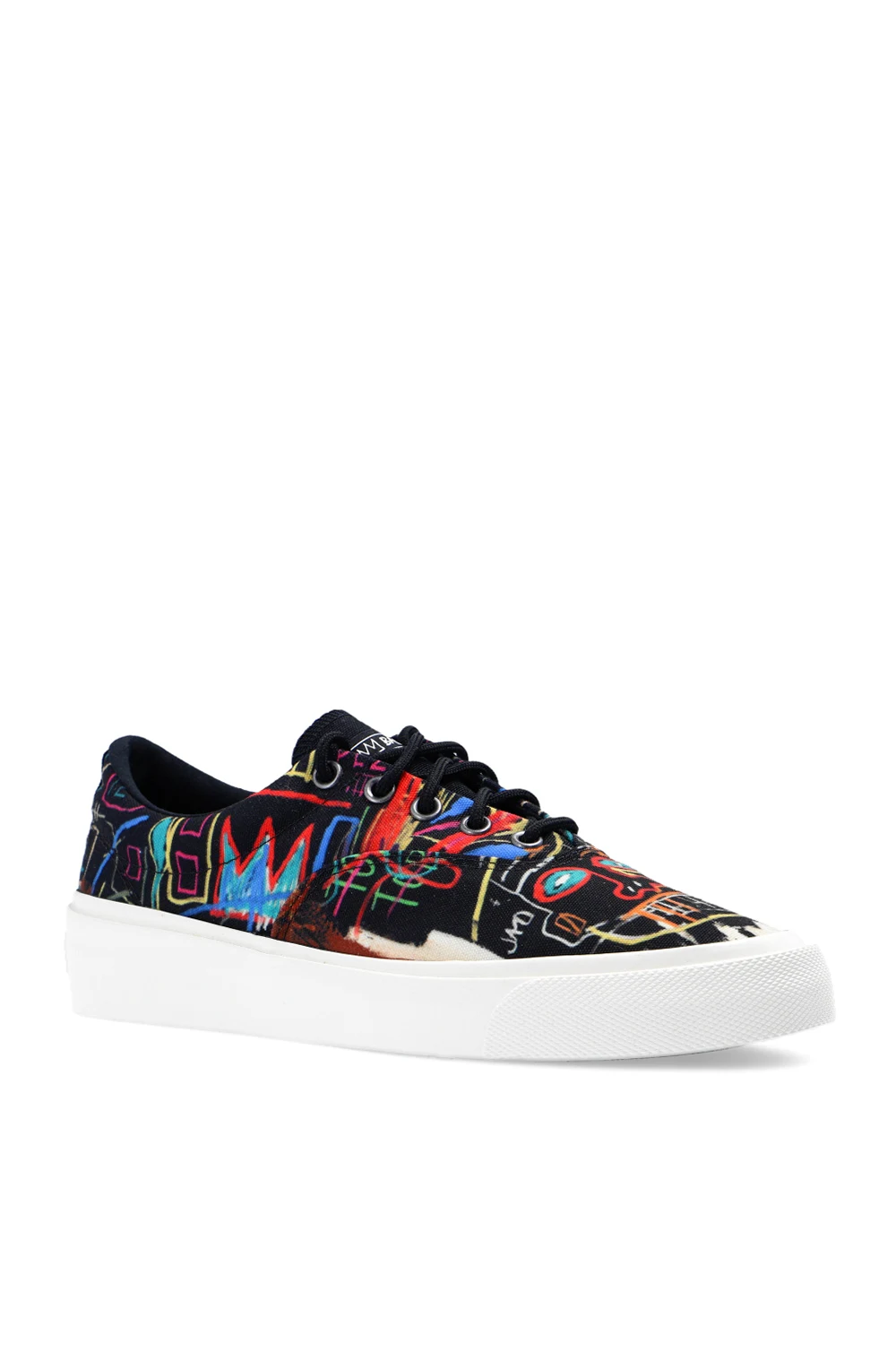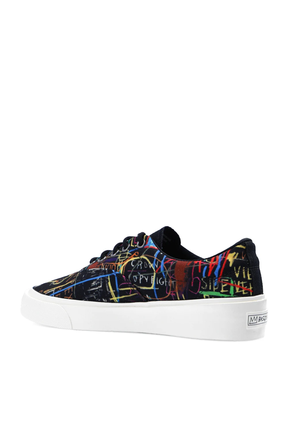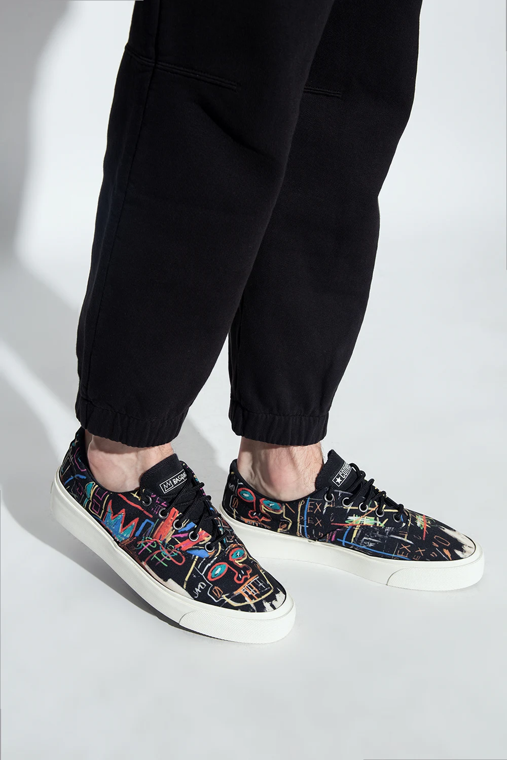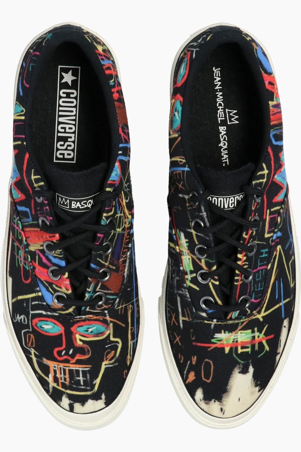 Black ‘Skid Grip OX’ high-top sneakers from Converse x Jean-Michel Basquiat. Resting on a white and black rubber sole, this lace-up pair is enriched by a white logo printed on the tongue, silver-tone metal hardware and a multicolored print inspired by Jean-Michel Basquiat’s graffiti designs.