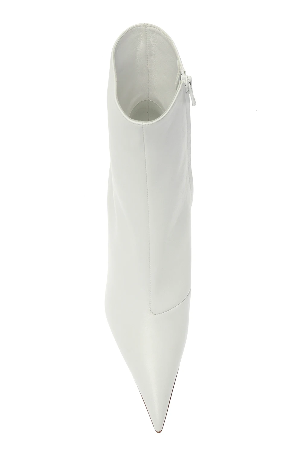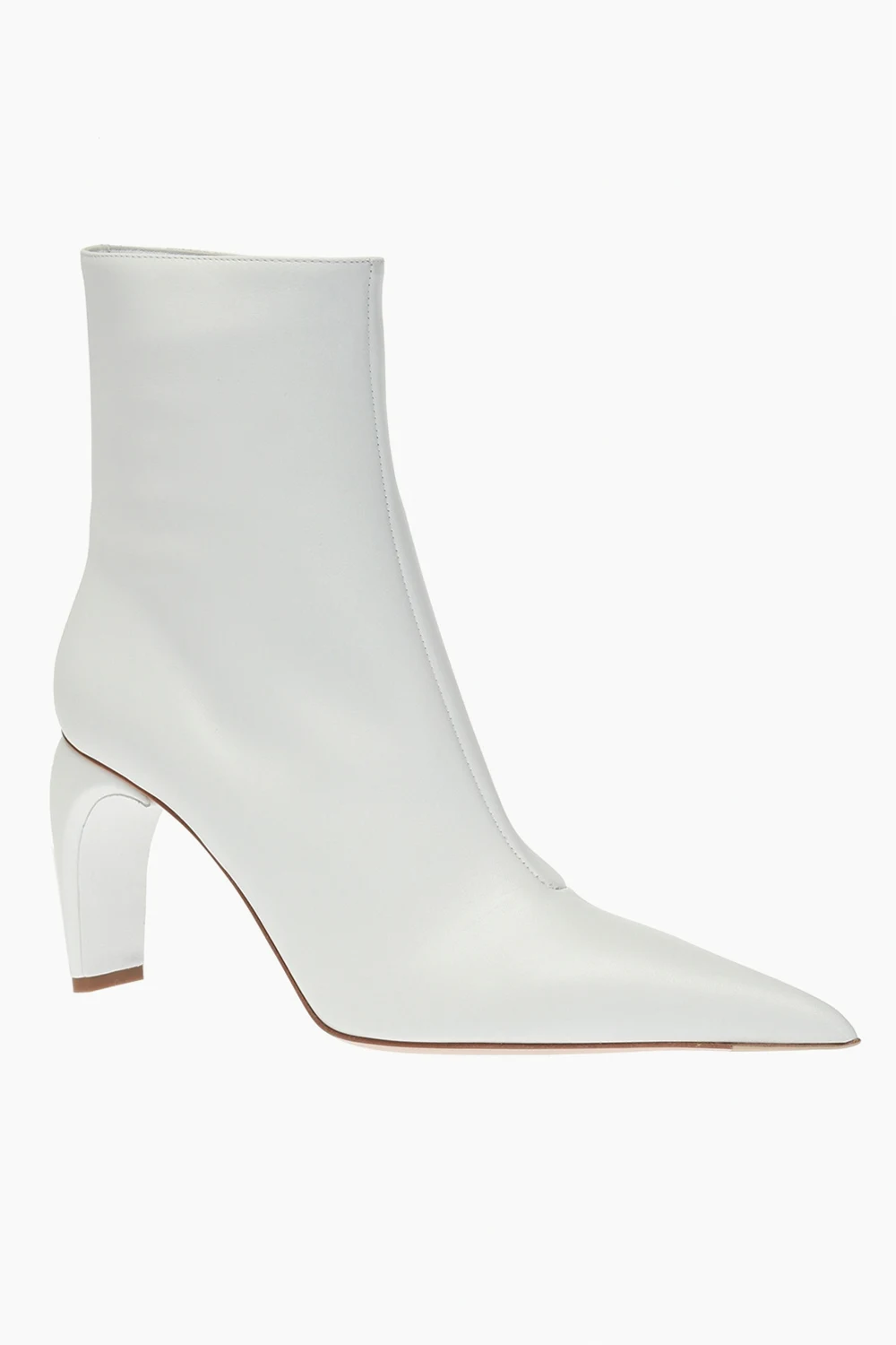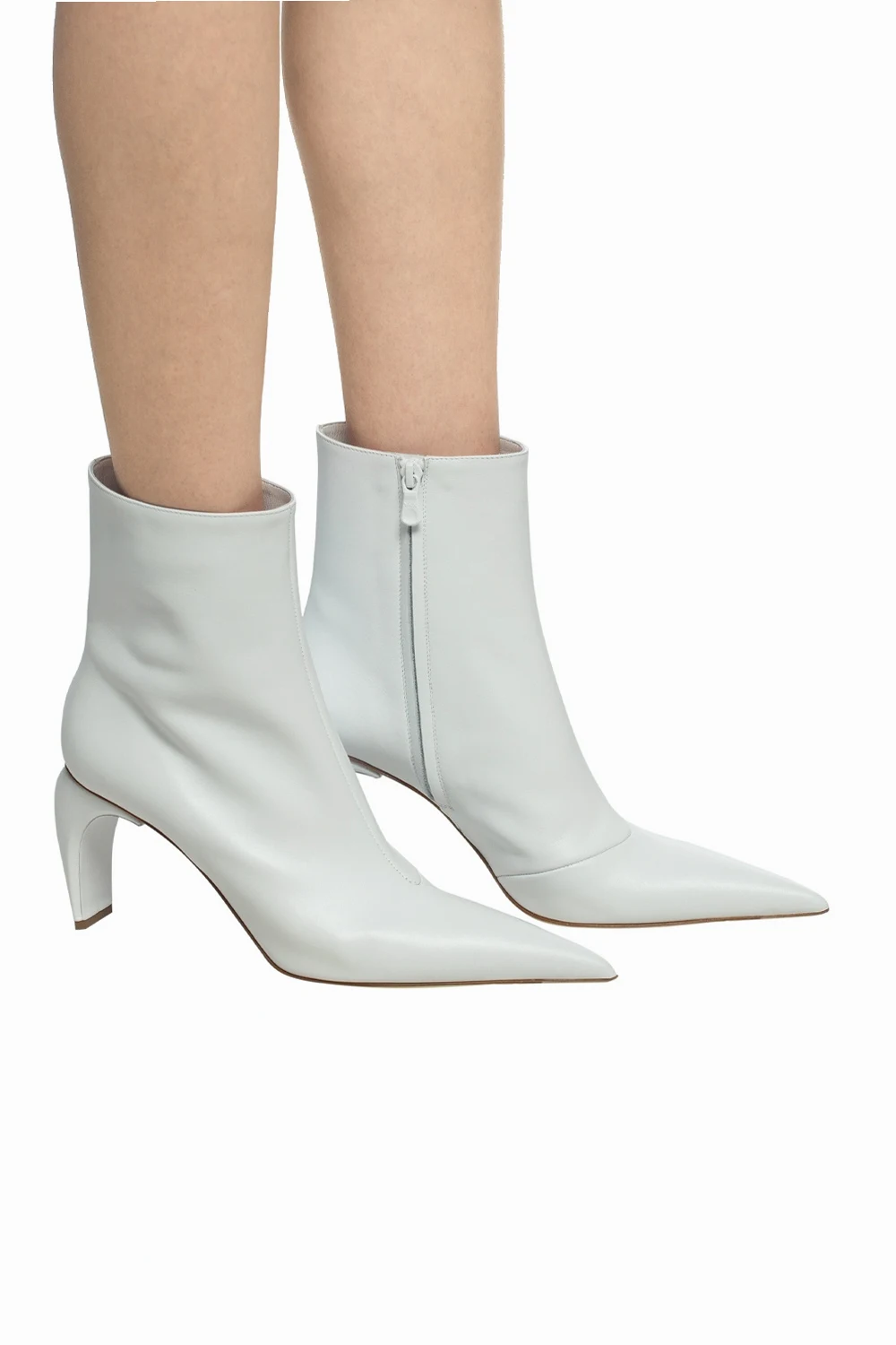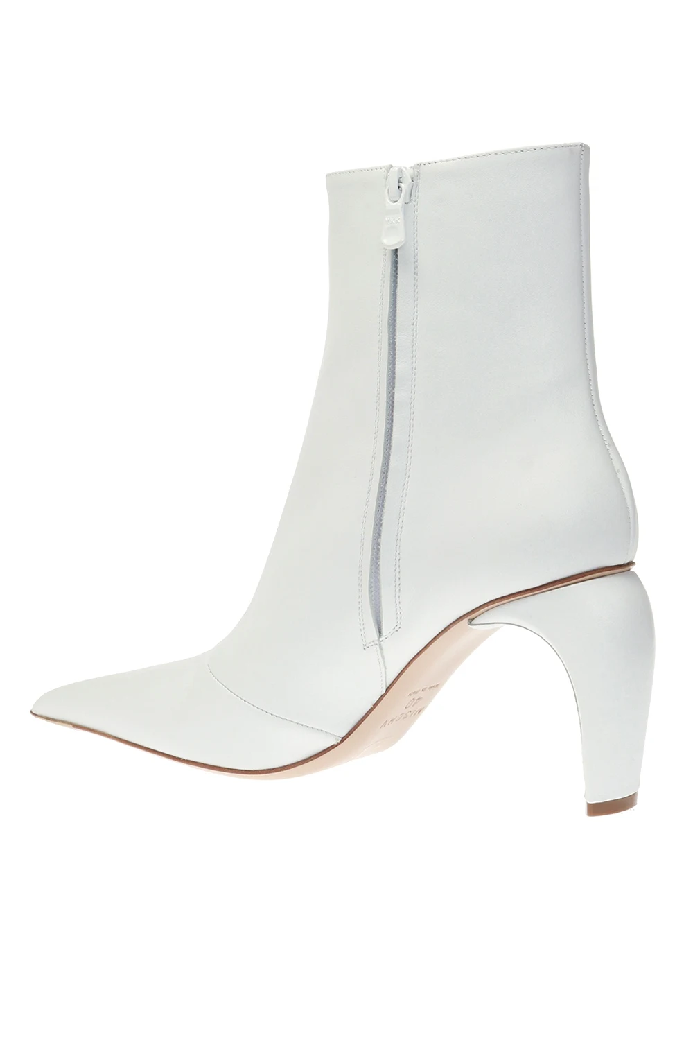 White heeled ankle boots from MISBHV. Made of leather. Zip fastening on the side. Decorative heel. Pointed toe. White rubber sole.
