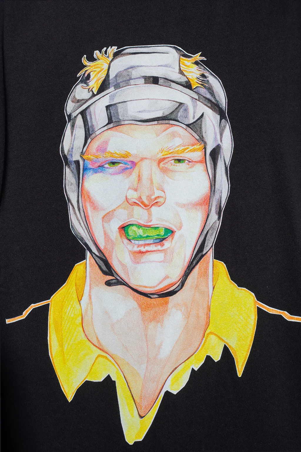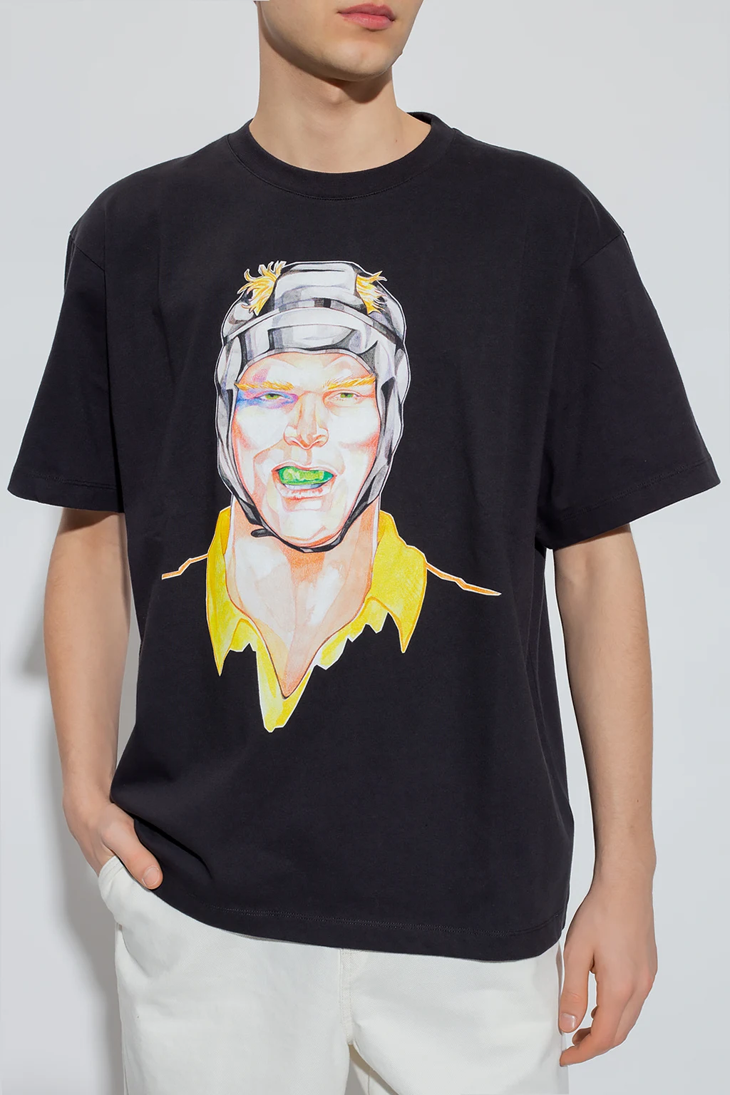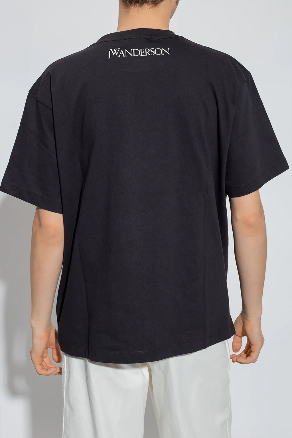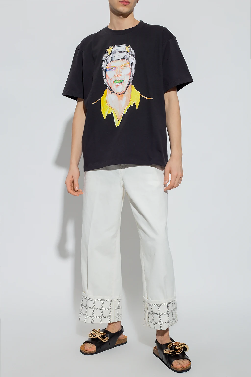 Black crewneck T-shirt from JW Anderson x Pol Anglada. Made of cotton, this style showcases short sleeves, an elasticated collar and a colourful graphic print.