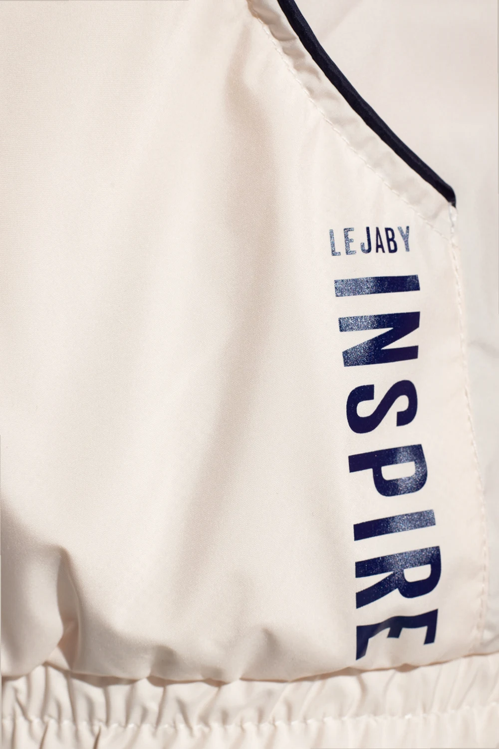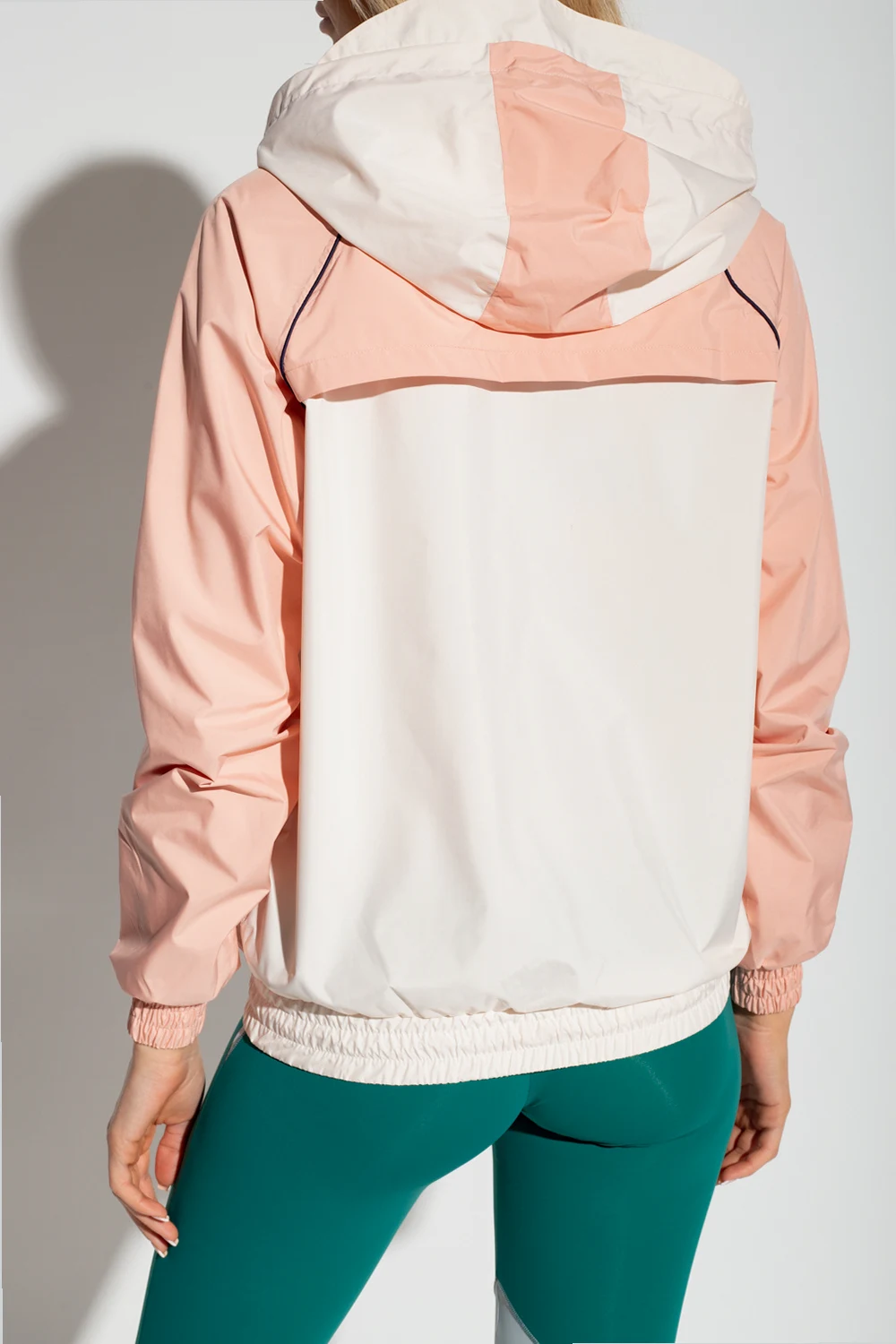 Pink and cream light rain jacket from Maison Lejaby. Made of recycled fabric, this model features a zip, drawstring hood, navy logo print, black trimmings, slip pocket and ribbed trims at the hem and cuffs.