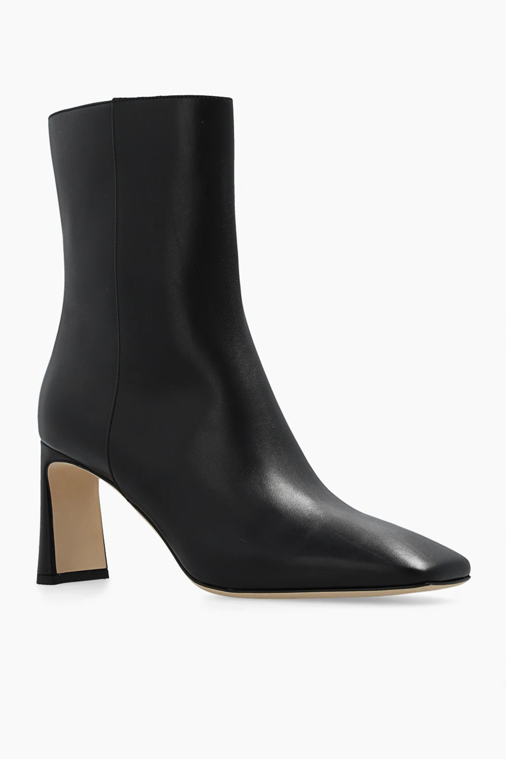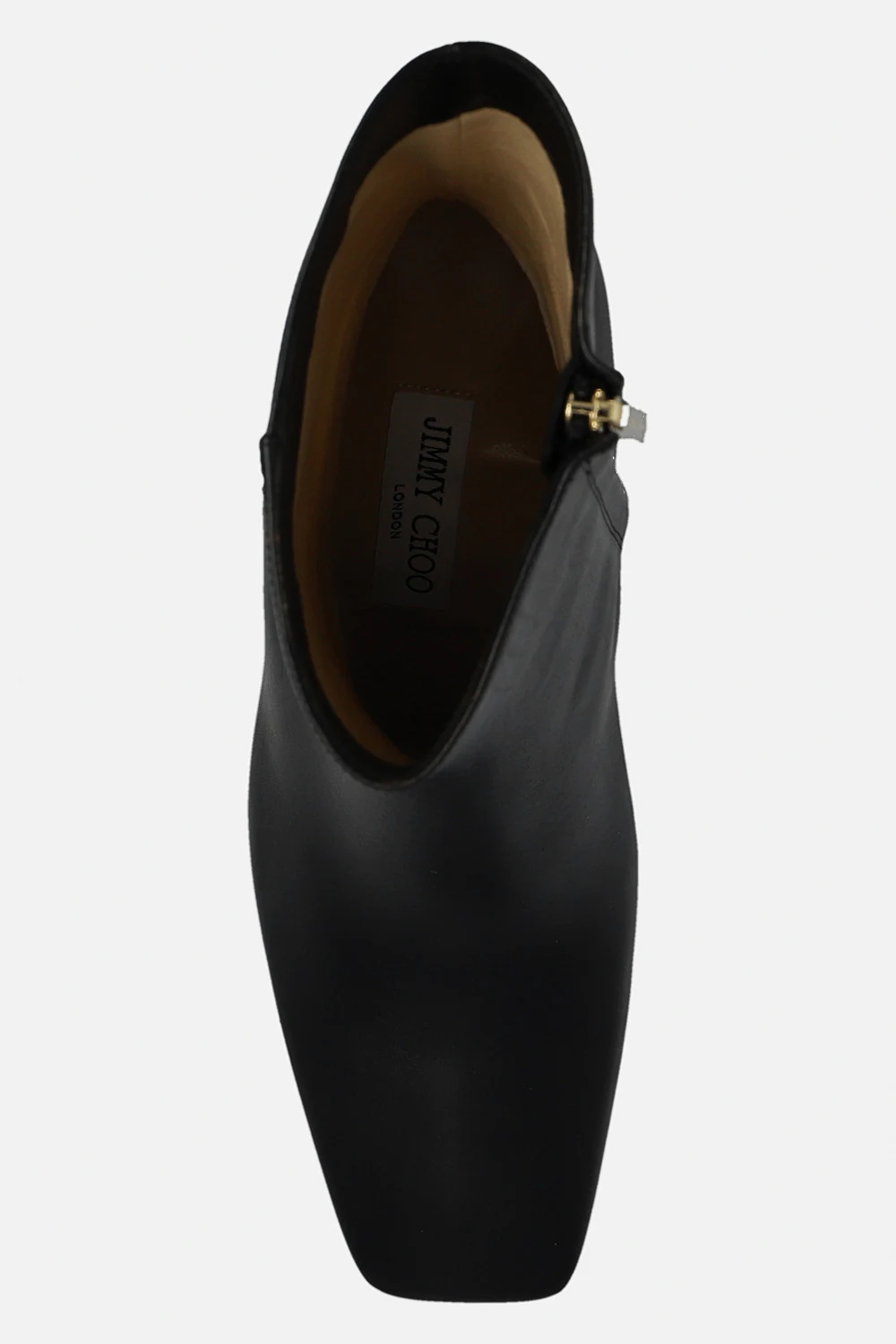 Black ‘Kinsey’ heeled ankle boots from Jimmy Choo. Crafted from leather, this model features a side zipper, a square toe, logo hardware at the back and a beige sole made of leather and rubber at the base.