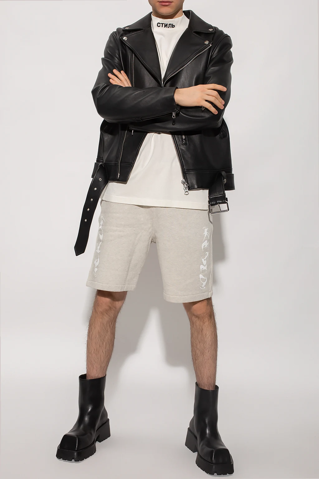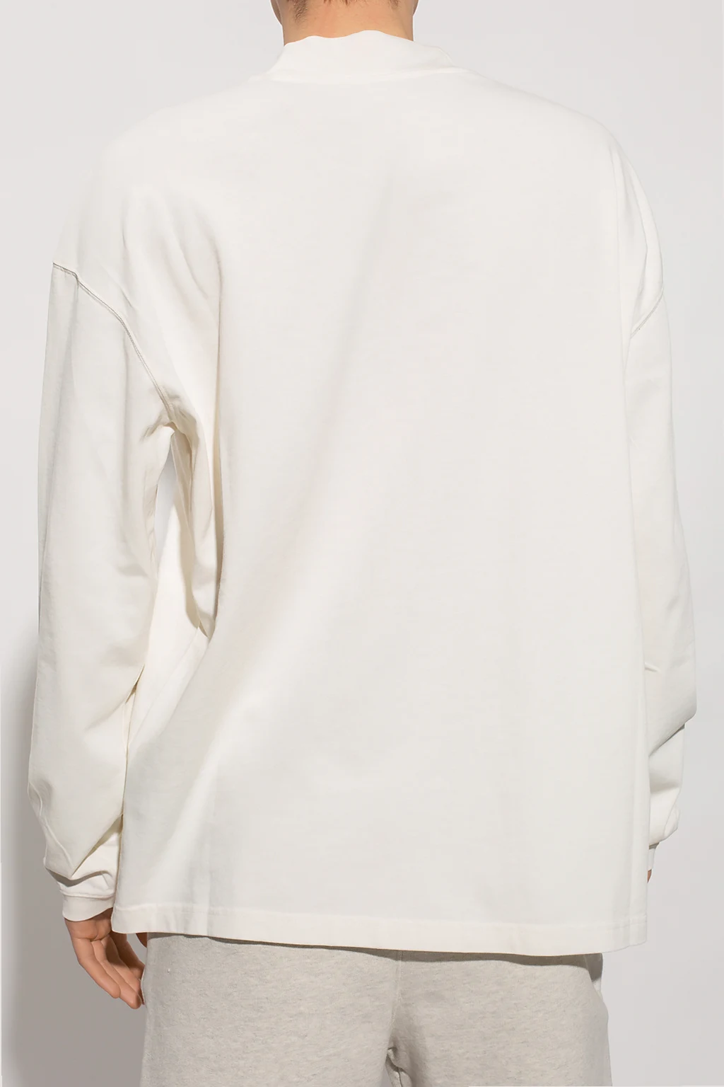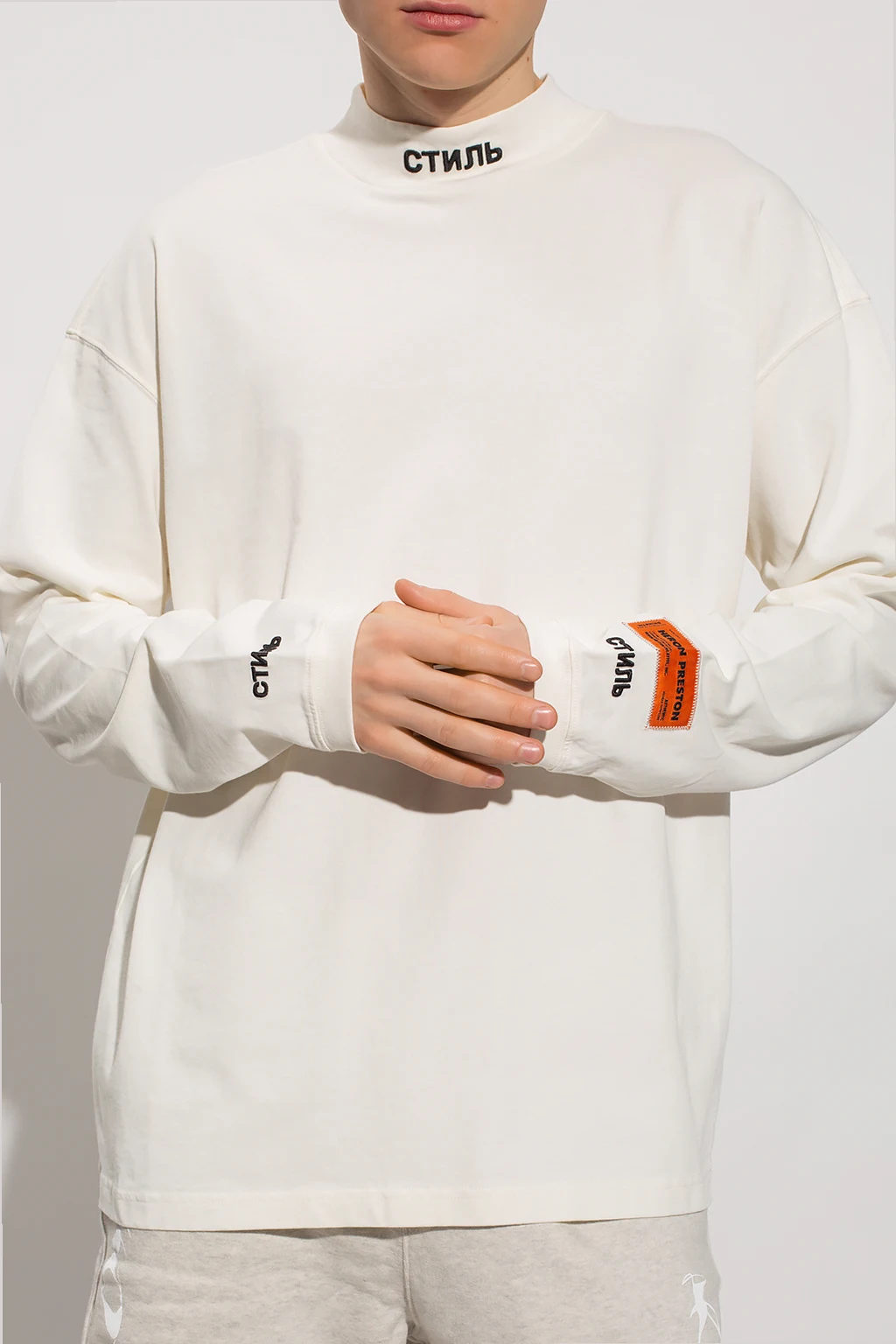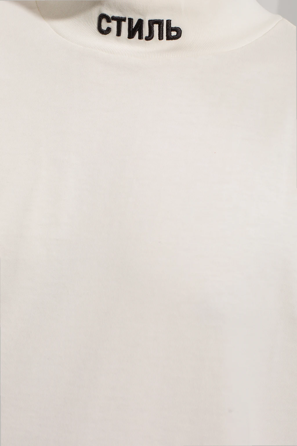 White T-shirt with a mock neck from Heron Preston. Crafted from cotton, this long sleeve design features a black logo embroidery and patch in orange and black.