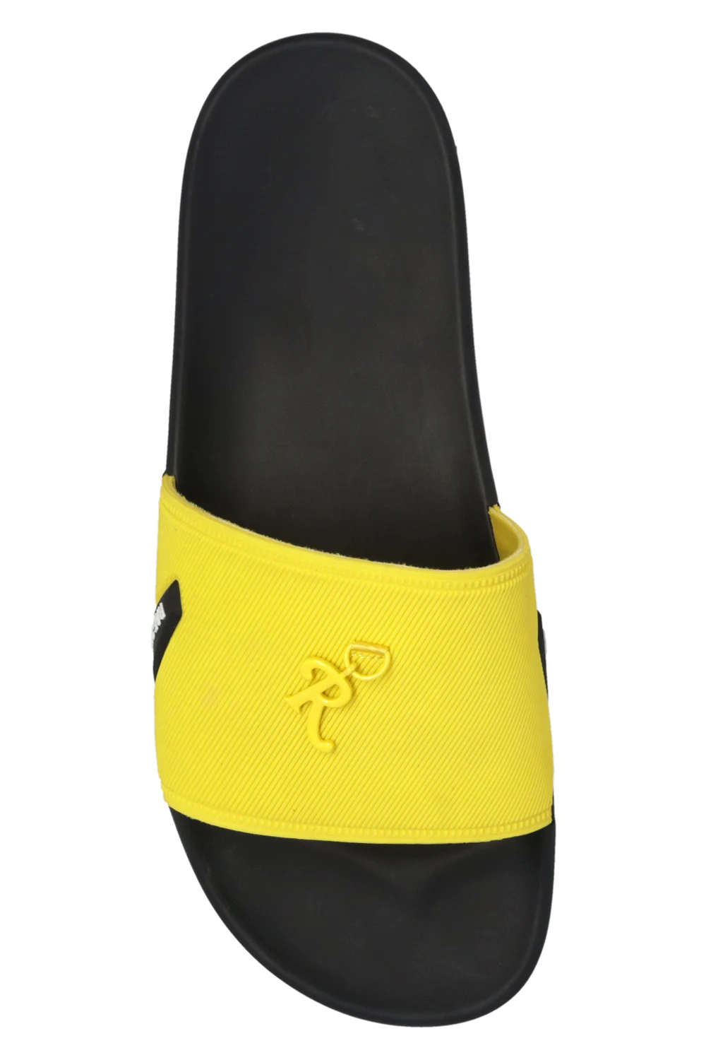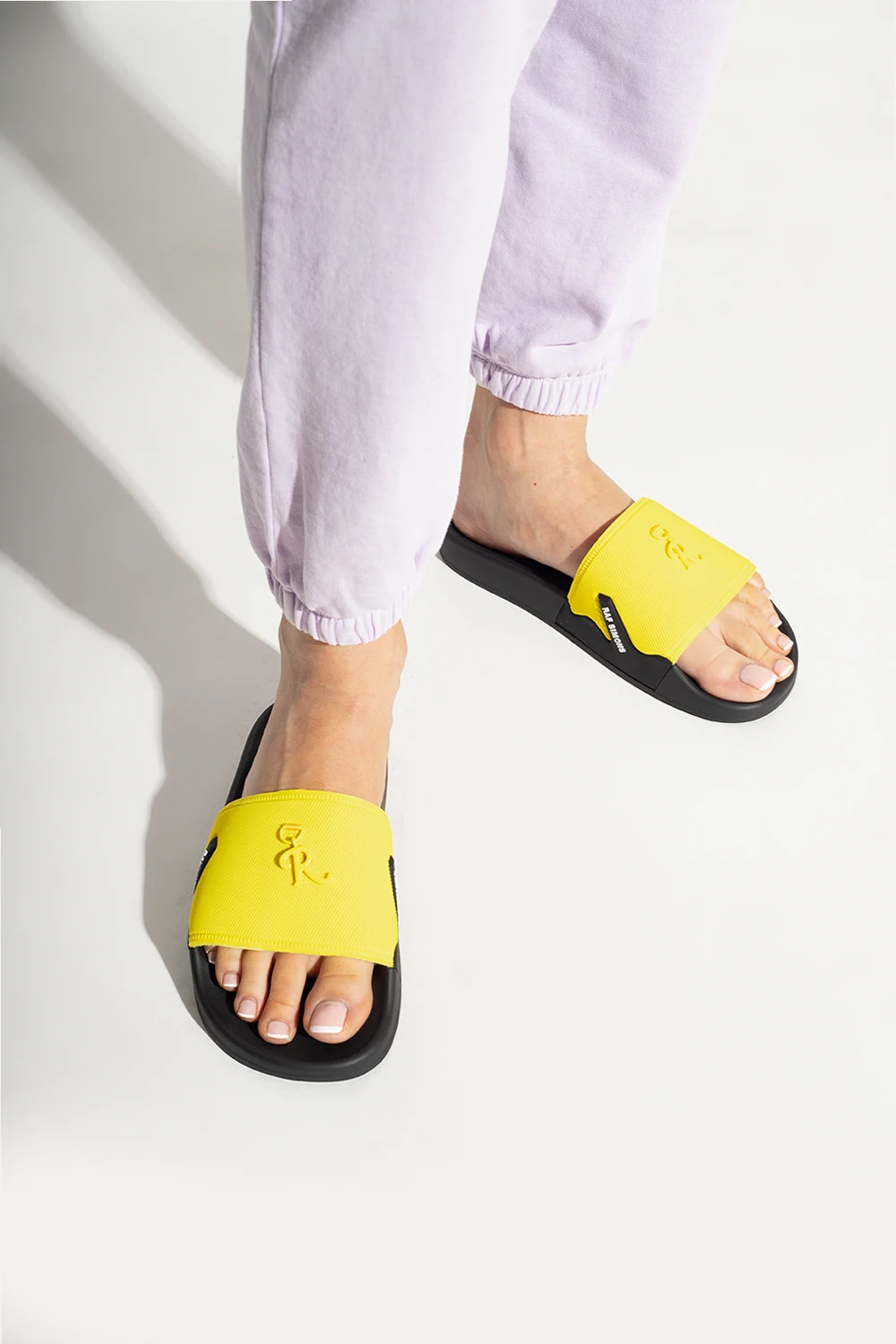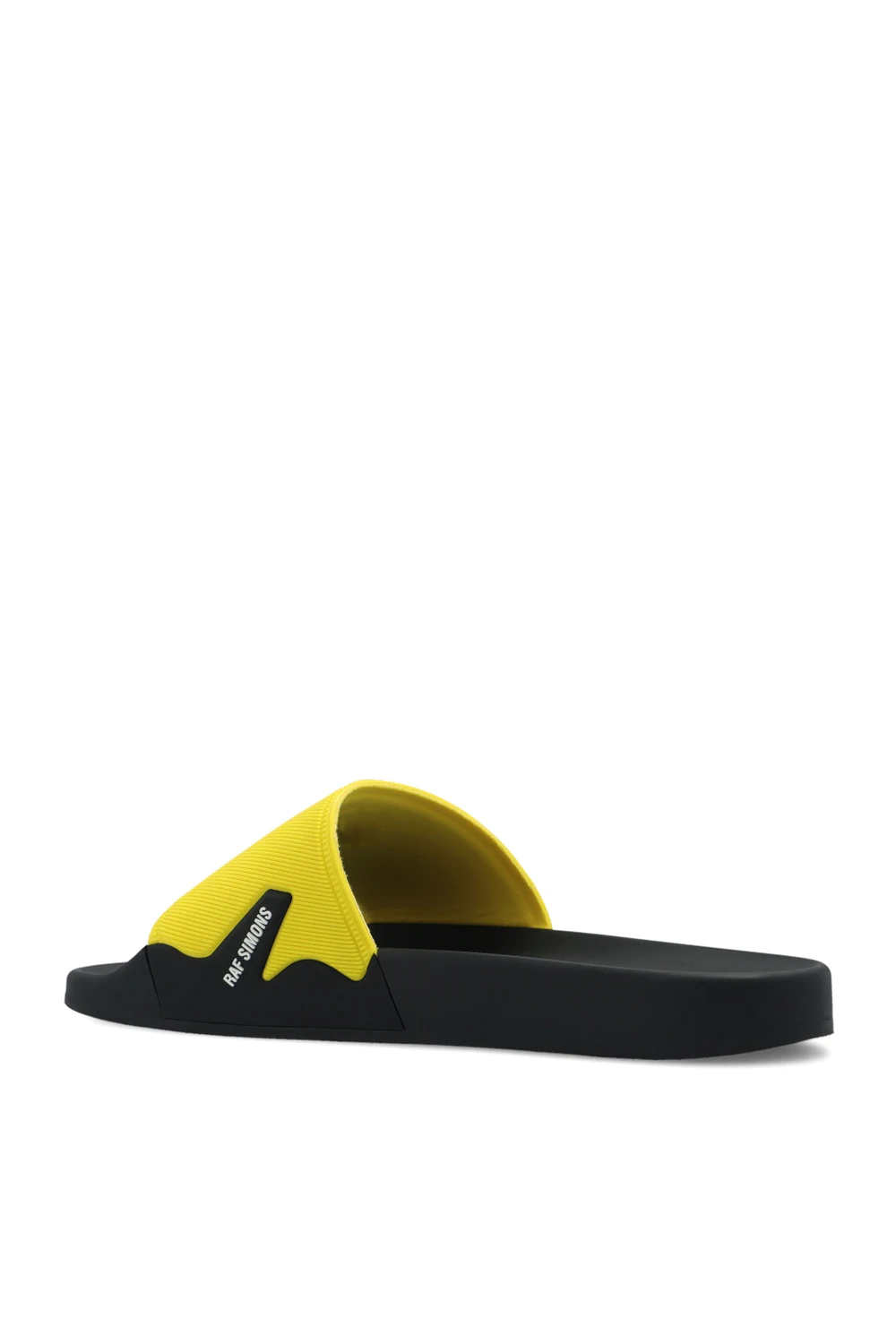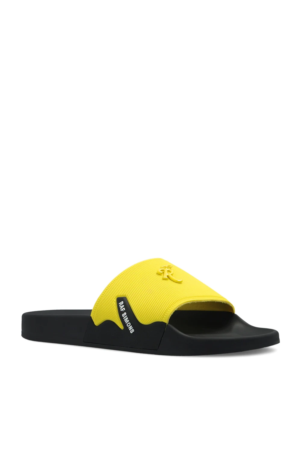 Yellow and black ‘Astra’ slides from Raf Simons. Made of rubber, this pair features a raised logo detail and a logo appliqué.