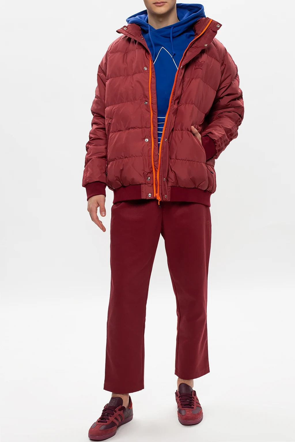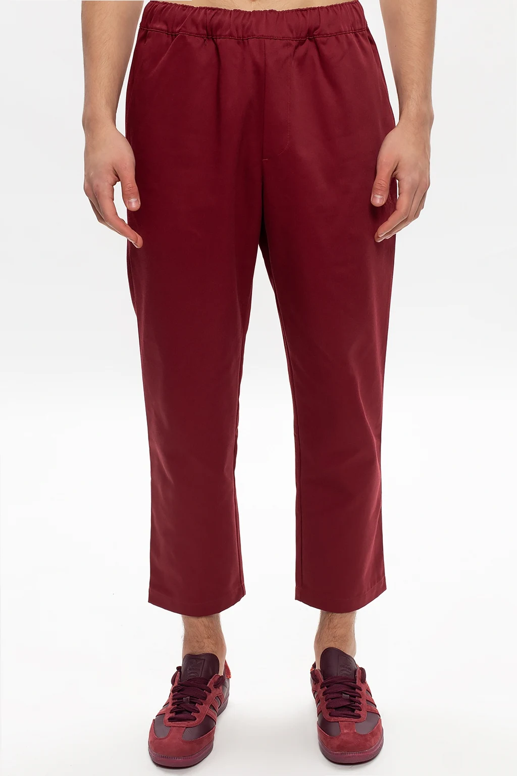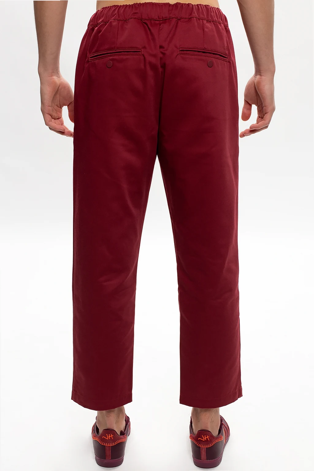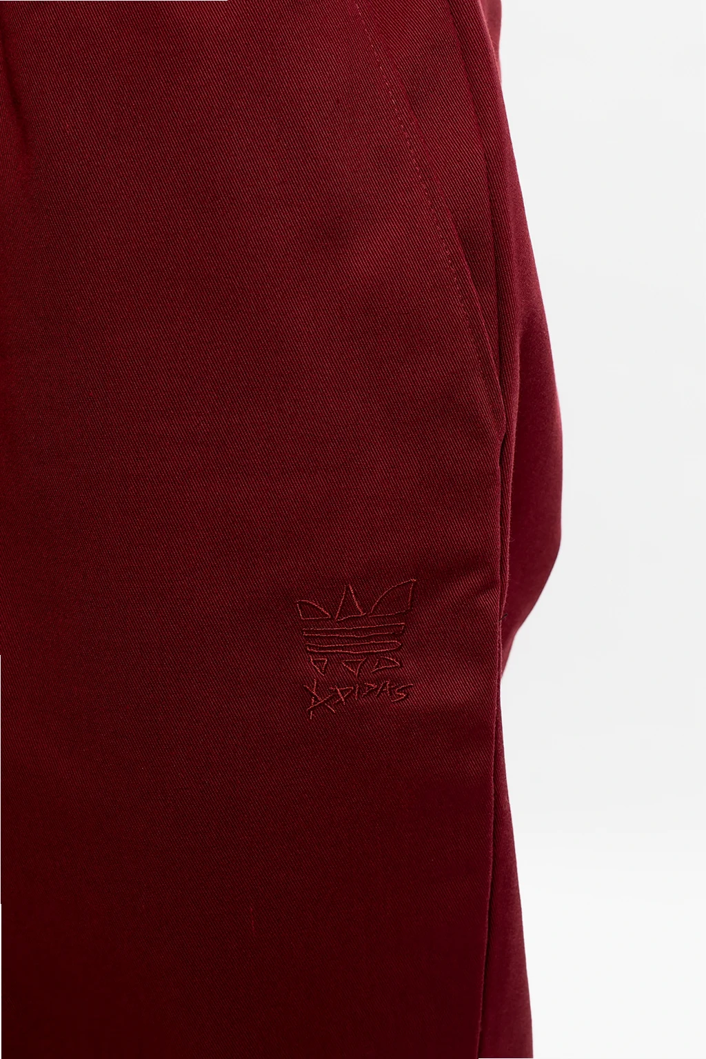 Maroon chino trousers from ADIDAS Originals x Jonah Hill. Boasting relaxed fit embellished with a logo embroidery designed exclusively in partnership with Jonah Hill – an American actor, comedian, writer, director and film producer – this pair falls down with slightly tapered legs and is complete with a drawcord-adjustable waist, two slant front pockets and two button-fastened back pockets.
