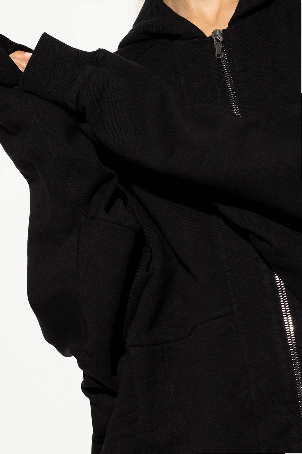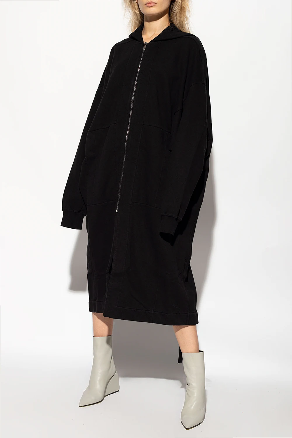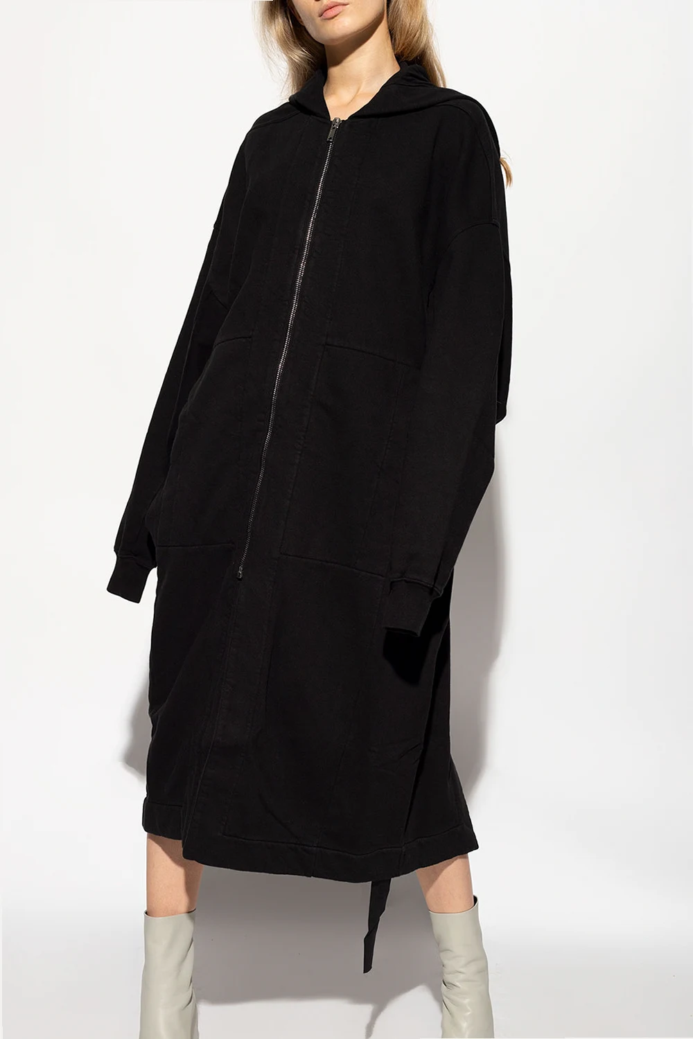 Long black hoodie from Rick Owens DRKSHDW. Crafted from cotton, this garment features a zip fastening and two slip pockets.