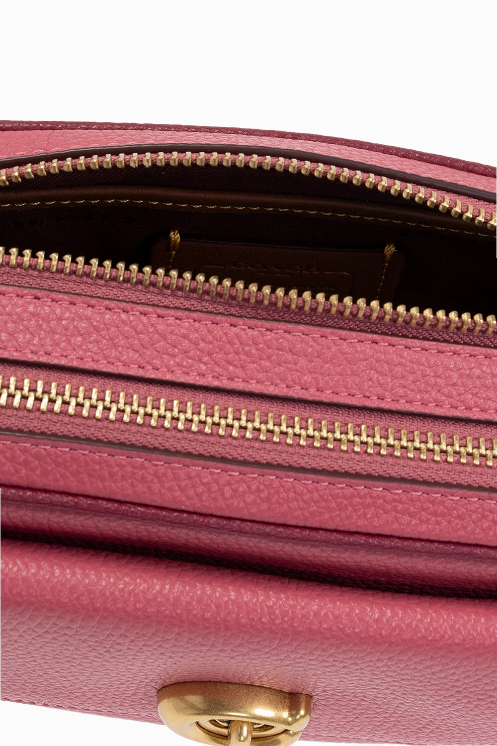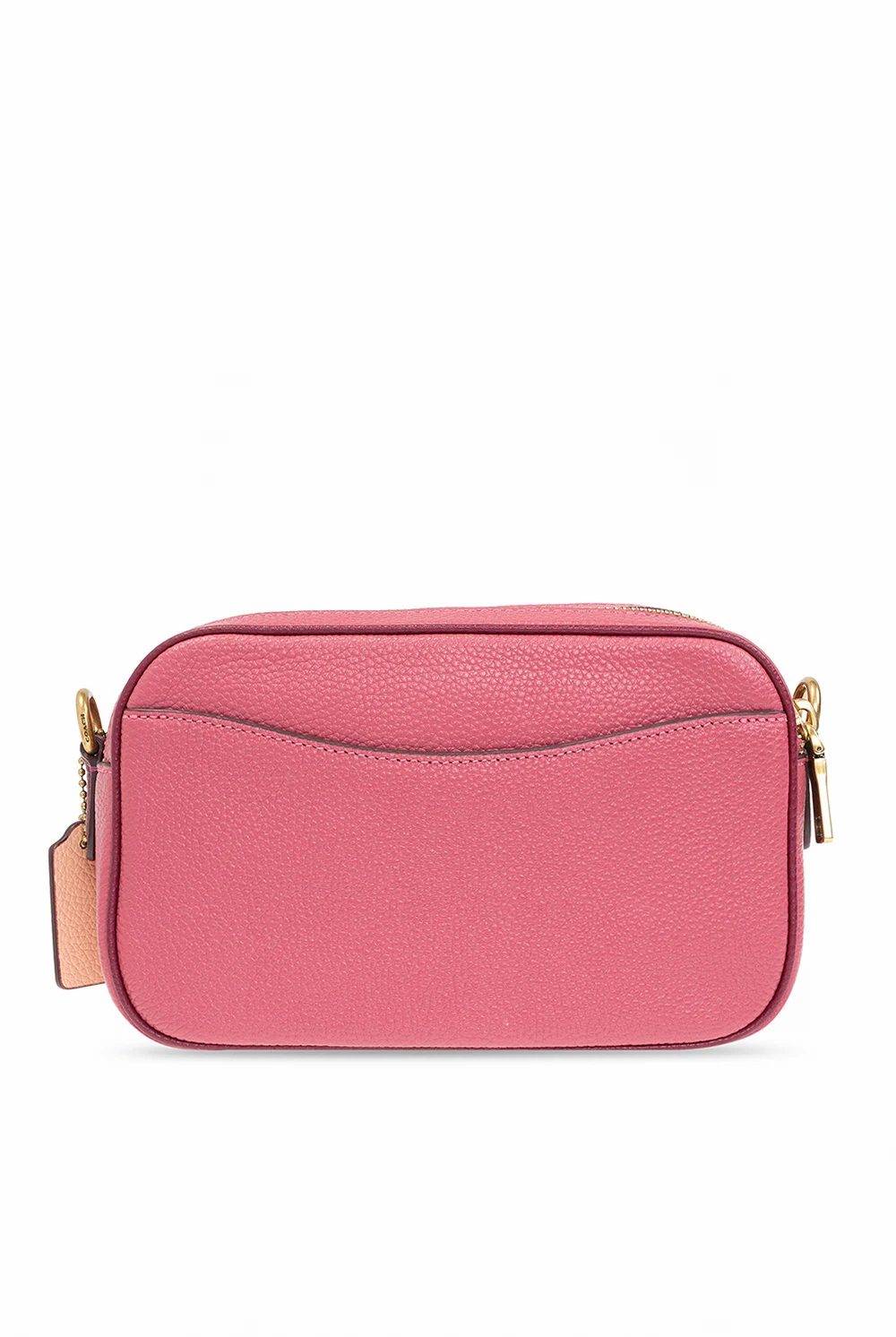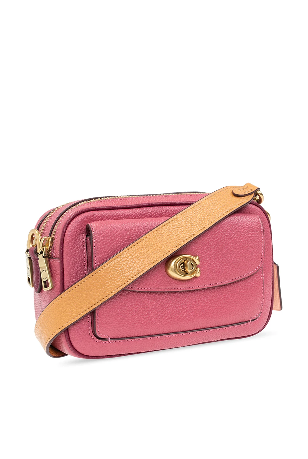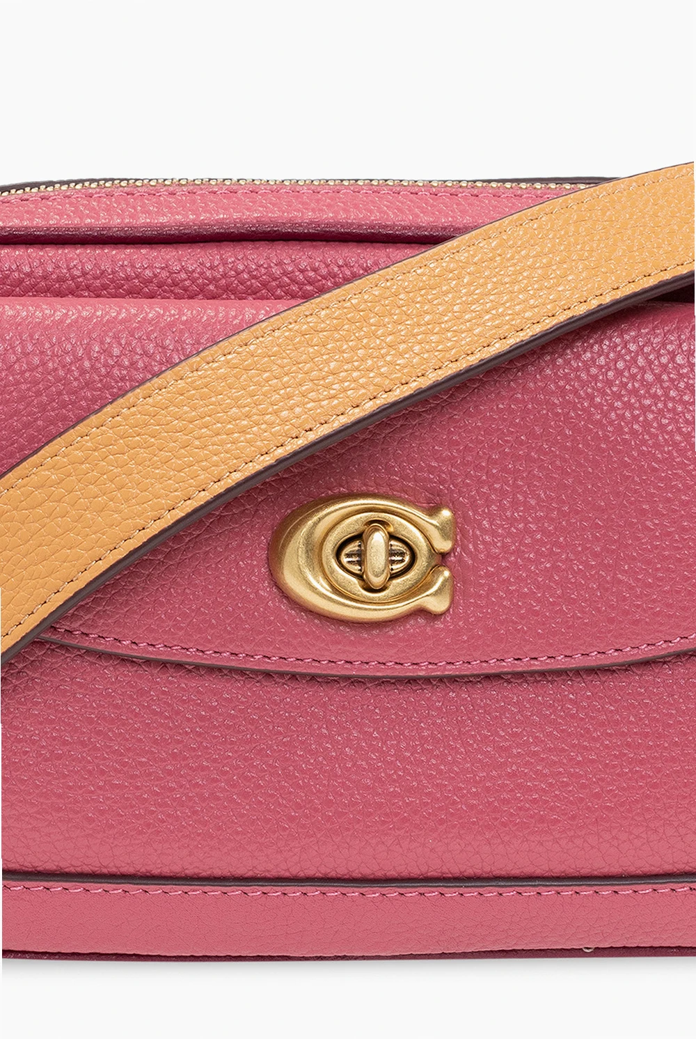 Pink and purple 'Willow Camera' shoulder bag from Coach. Crafted from grainy leather, this design fastens via zips and features a flapped pocket with a decorative closure on the front, a slip pocket at the back, a detachable and adjustable shoulder strap, gold-tone metal hardware, an attached charm with an embossed logo and an interior with two separate compartments and one slip pocket.