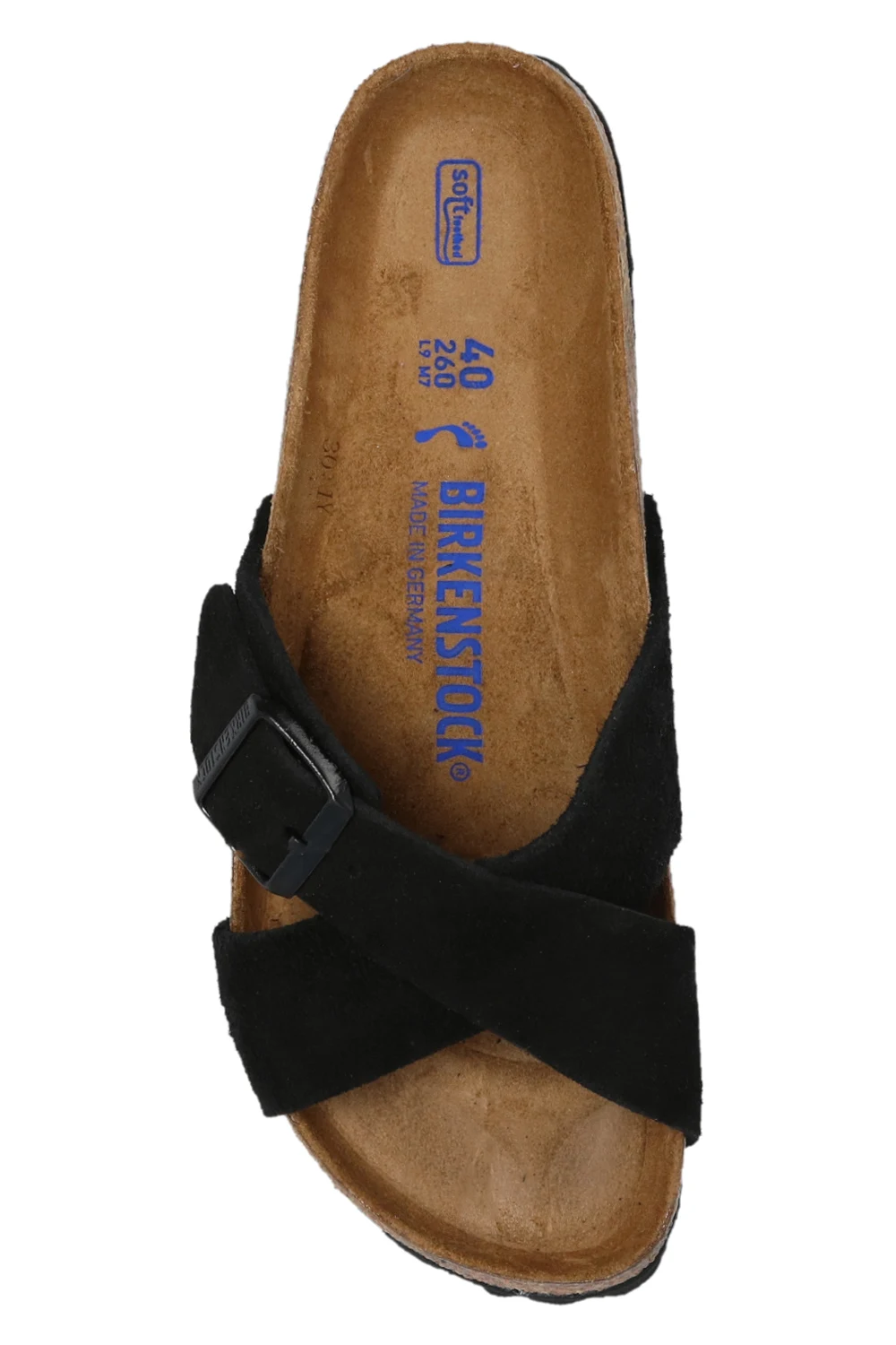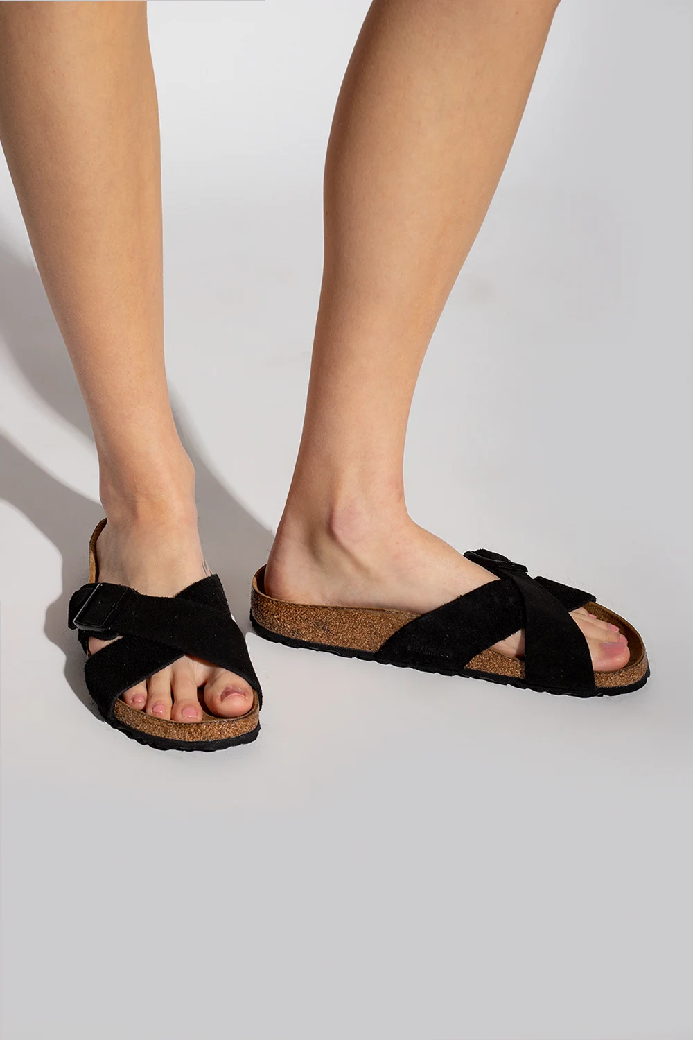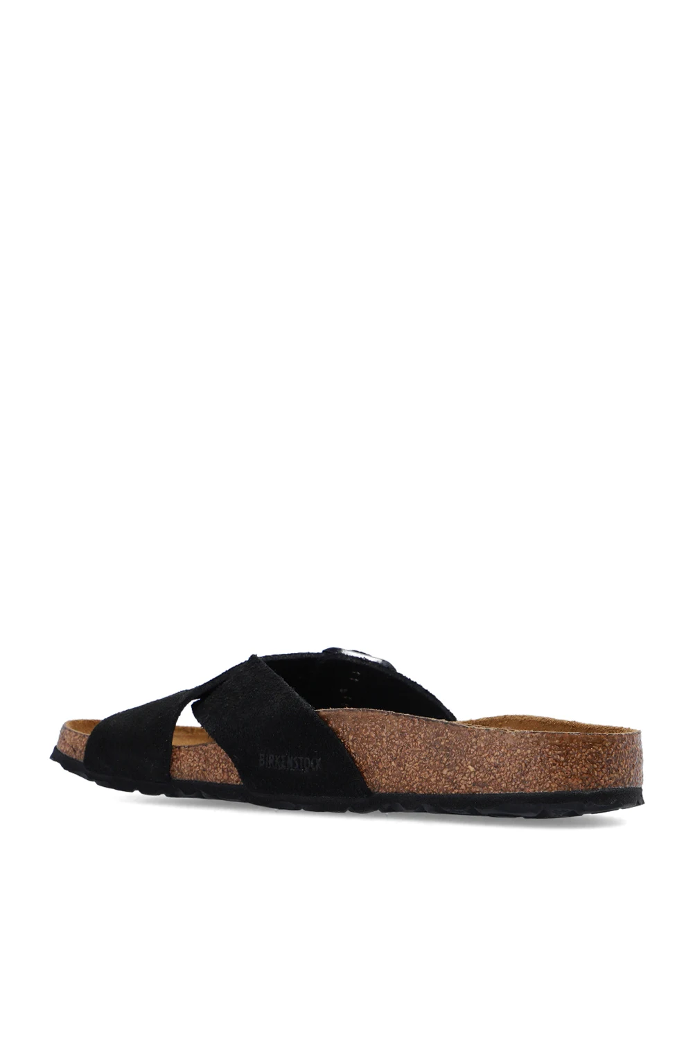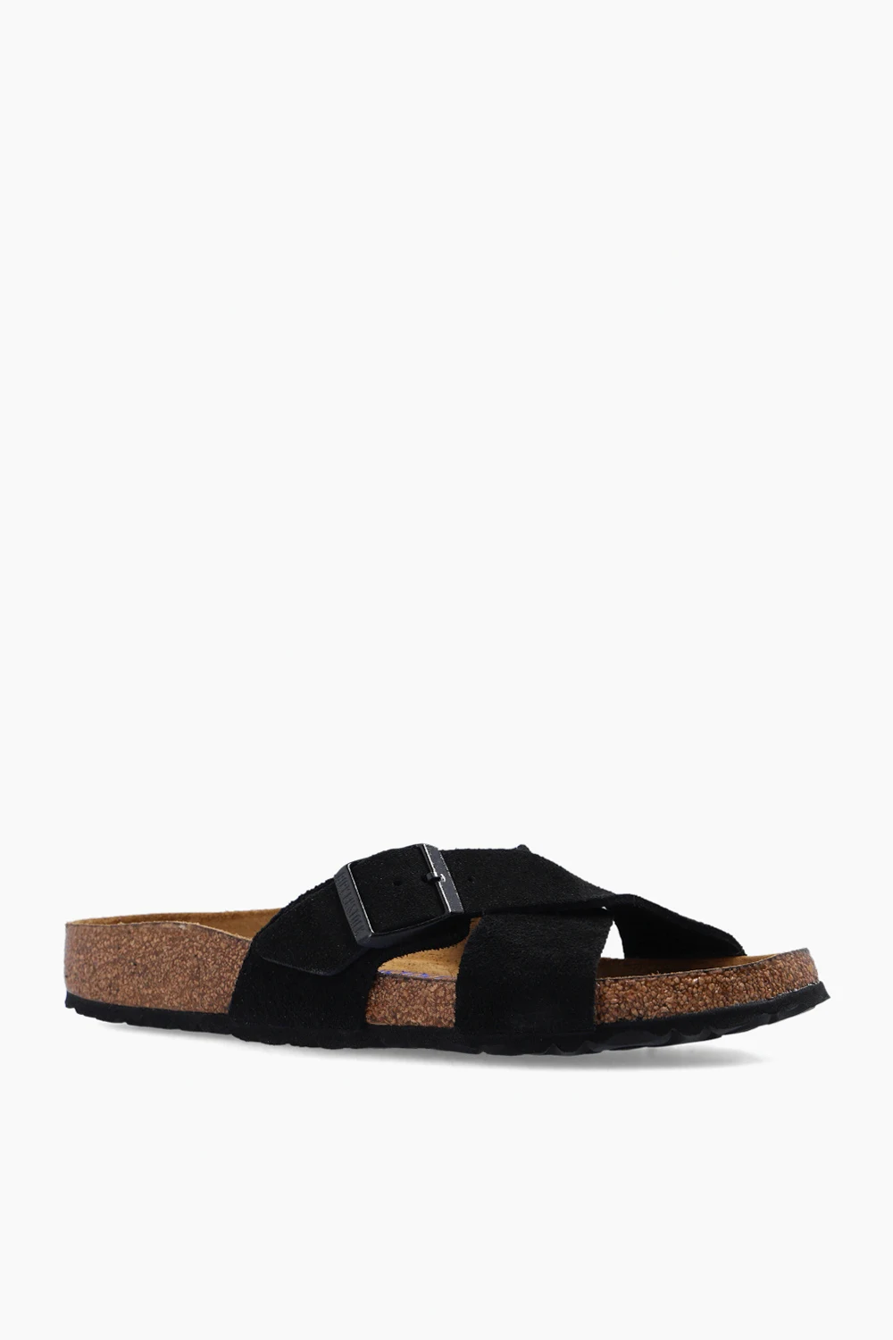 Black ‘Siena’ slides from Birkenstock. Made of suede, this pair features an adjustable strap with a branded buckle as well as a black and brown sole made of cork and EVA foam.
