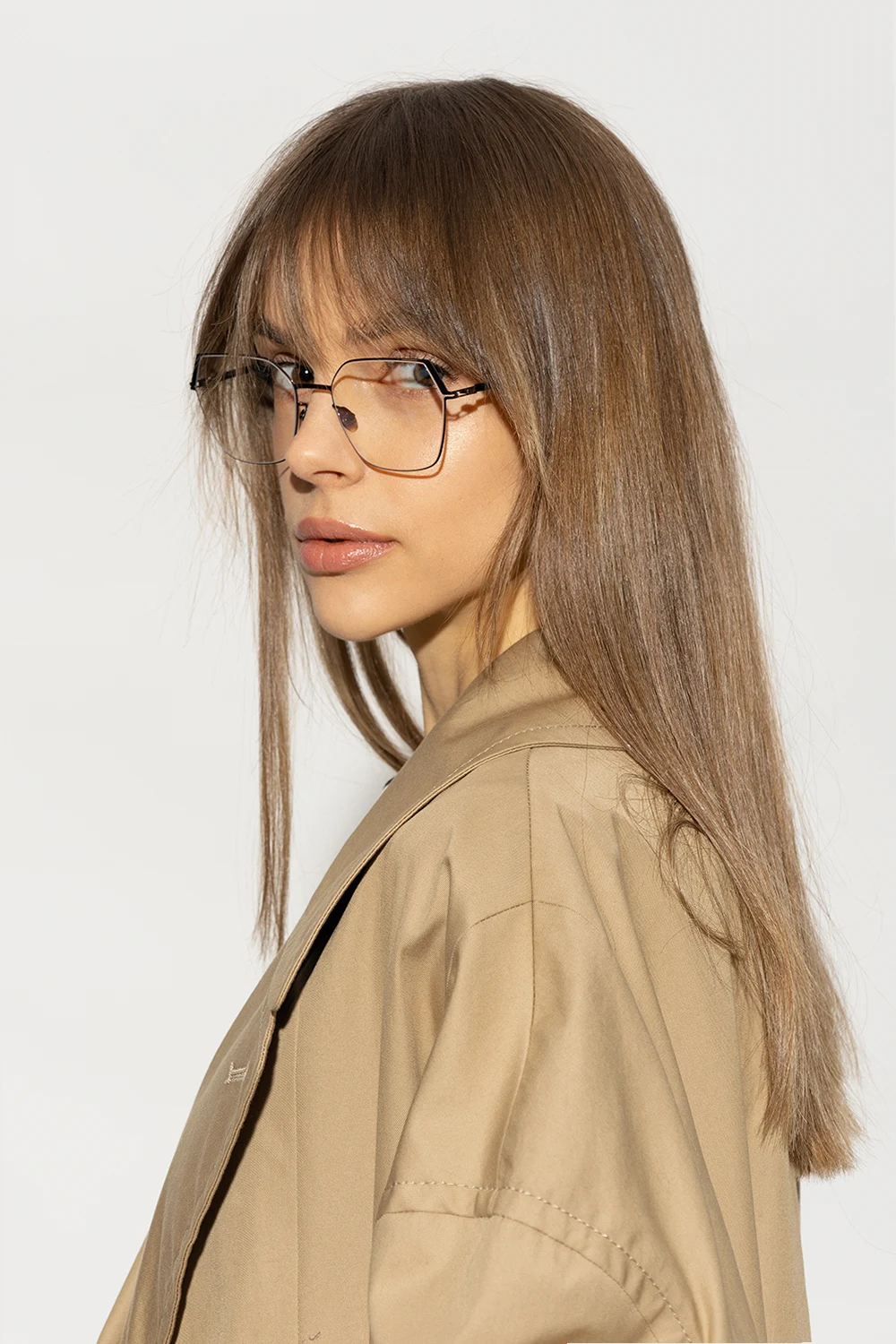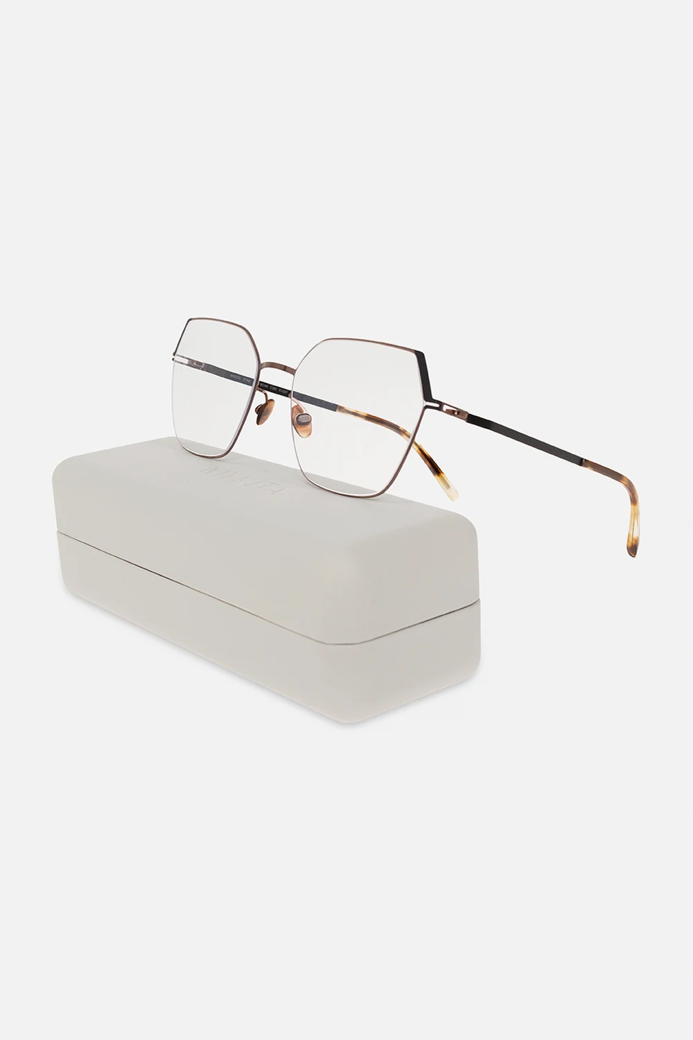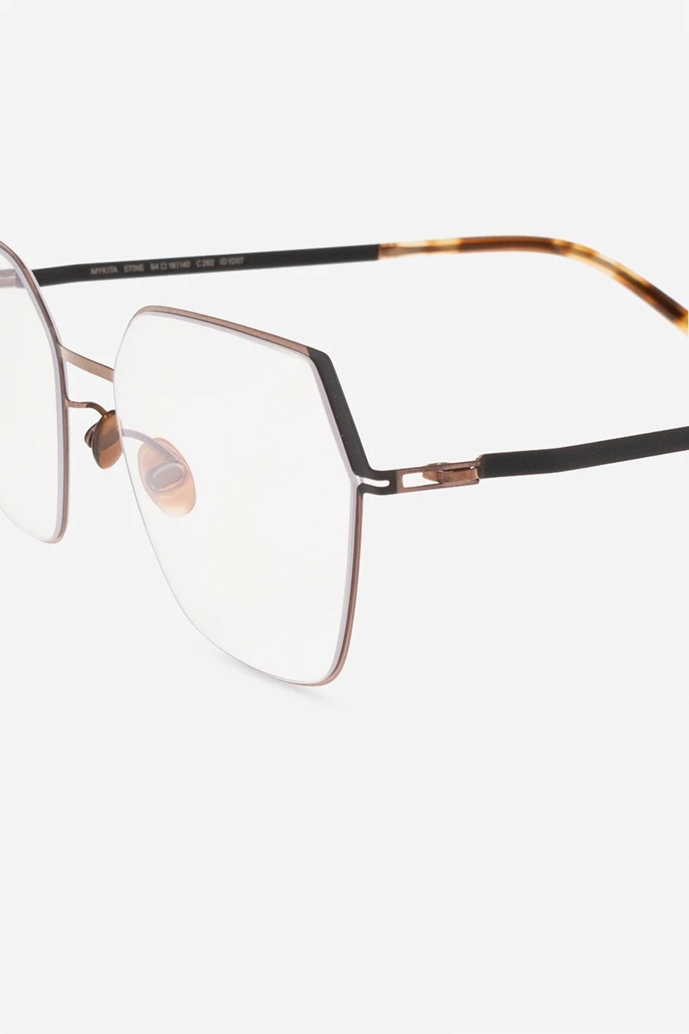 Black and copper-coloured ‘Stine Shiny’ optical glasses from Mykita. Handcrafted in Berlin from lightweight stainless steel, this model features temples with patented spiral hinges and tortoiseshell tips. Case included.
