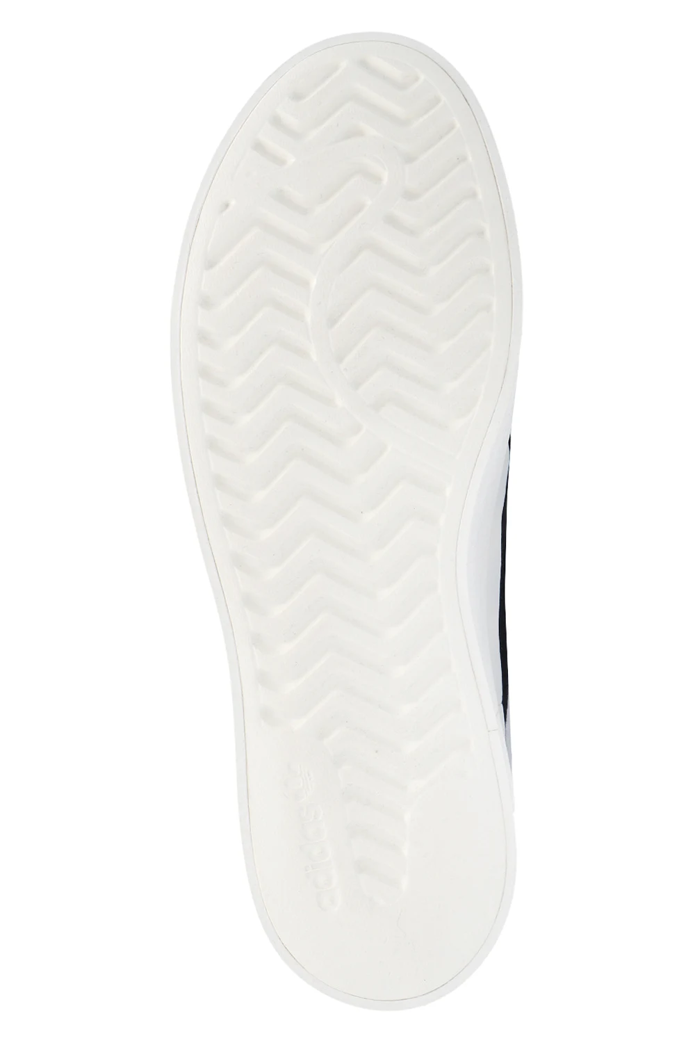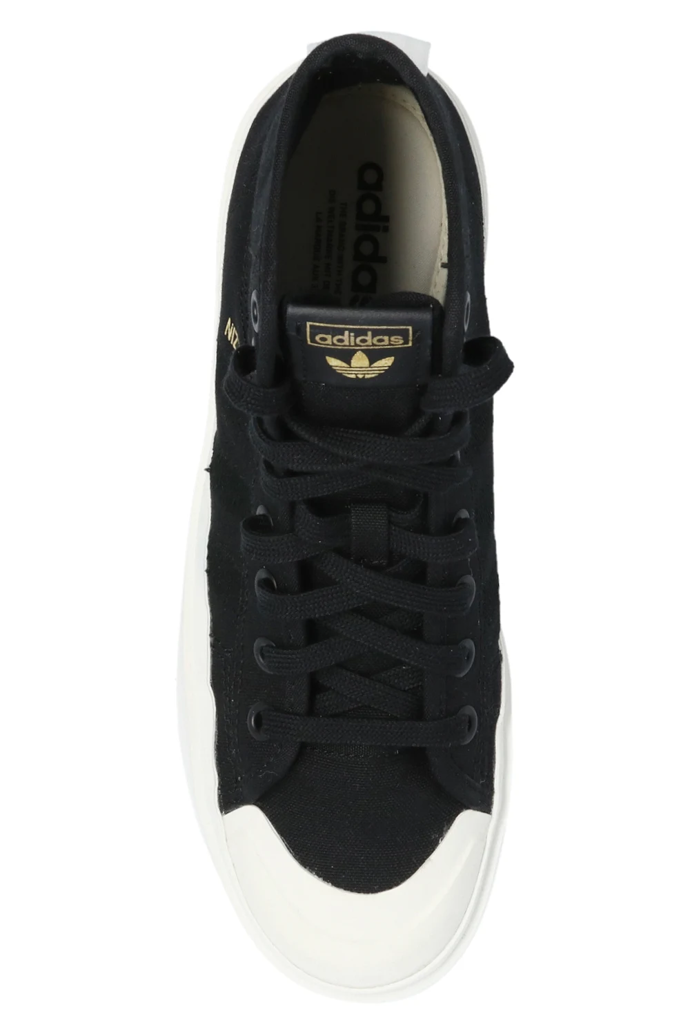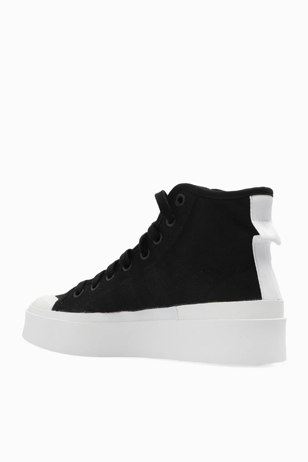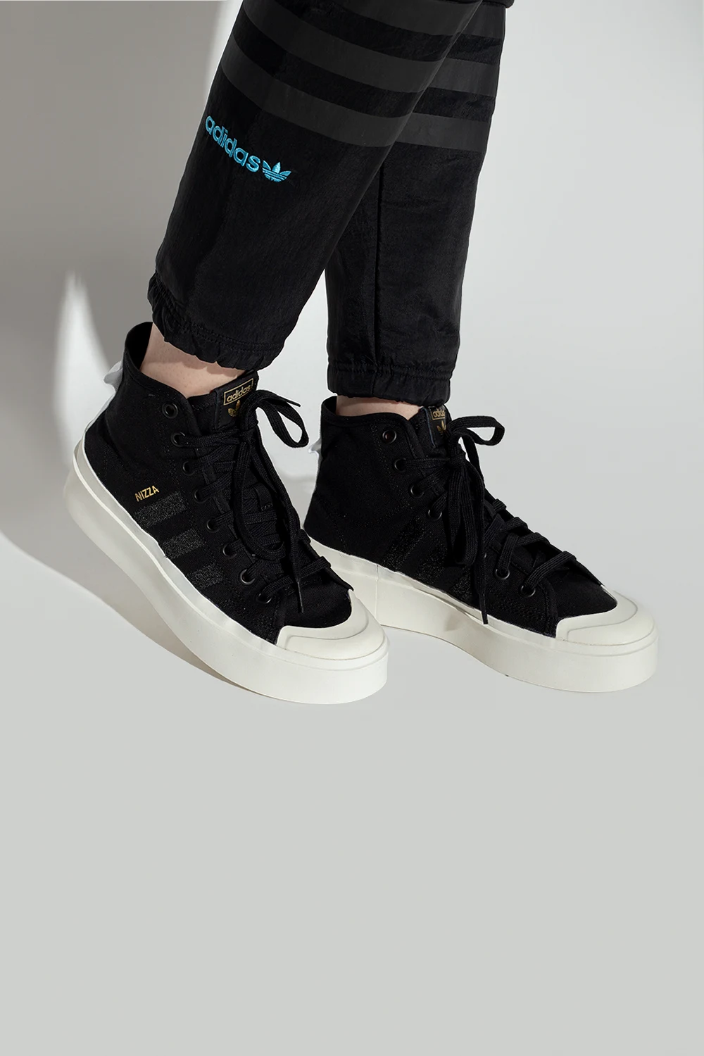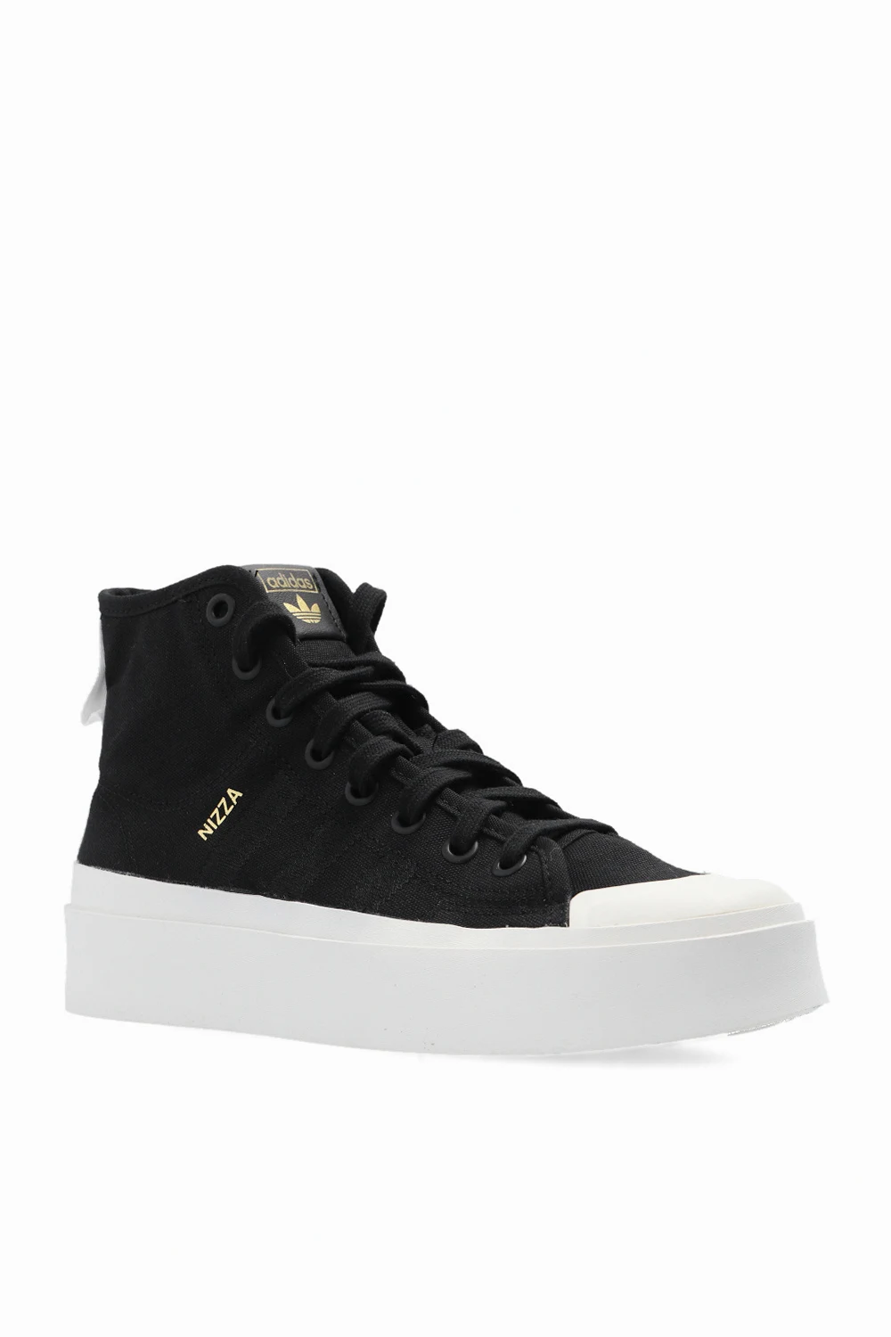 Black and white ‘Nizza Bonega Mid W’ high-top sneakers from ADIDAS Originals. Resting on a white rubber sole, this lace-up pair features a logo pattern in gold-tone and the label’s signature three stripes.