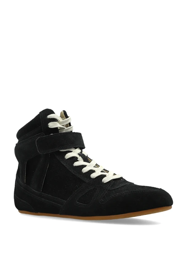 Senny High Sneakers aus der exklusiven Kollektion von Isabel Marant begeistern mit einer raffinierten Form und edlen Details. Der klassische, hohe High-Top-Schaft aus weichem, schwarzem Veloursleder umschließt den Fuß sanft und reicht über den Knöchel hinaus. Die geschwungenen Linien sowie die Verstärkungen an Zehenkappe und Ferse unterstreichen die Langlebigkeit, ohne auf anspruchsvolle Ästhetik zu verzichten. Charakteristische Nähte und die einheitliche schwarze Farbgebung verleihen den Schuhen eine edle Schlichtheit, die durch die hellen Schnürsenkel stilvoll akzentuiert wird. Das äußere und innere Leder unterstreicht die außergewöhnliche Qualität, während die braune Gummisohle für hervorragenden Halt sorgt. Auf der Zunge ist das „marant“-Logo prominent platziert und betont die Exklusivität des Produkts.