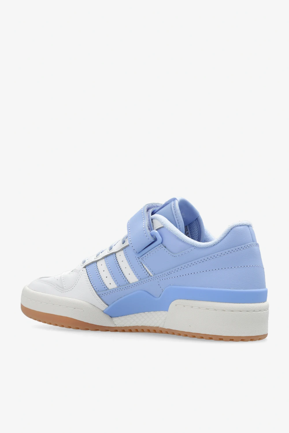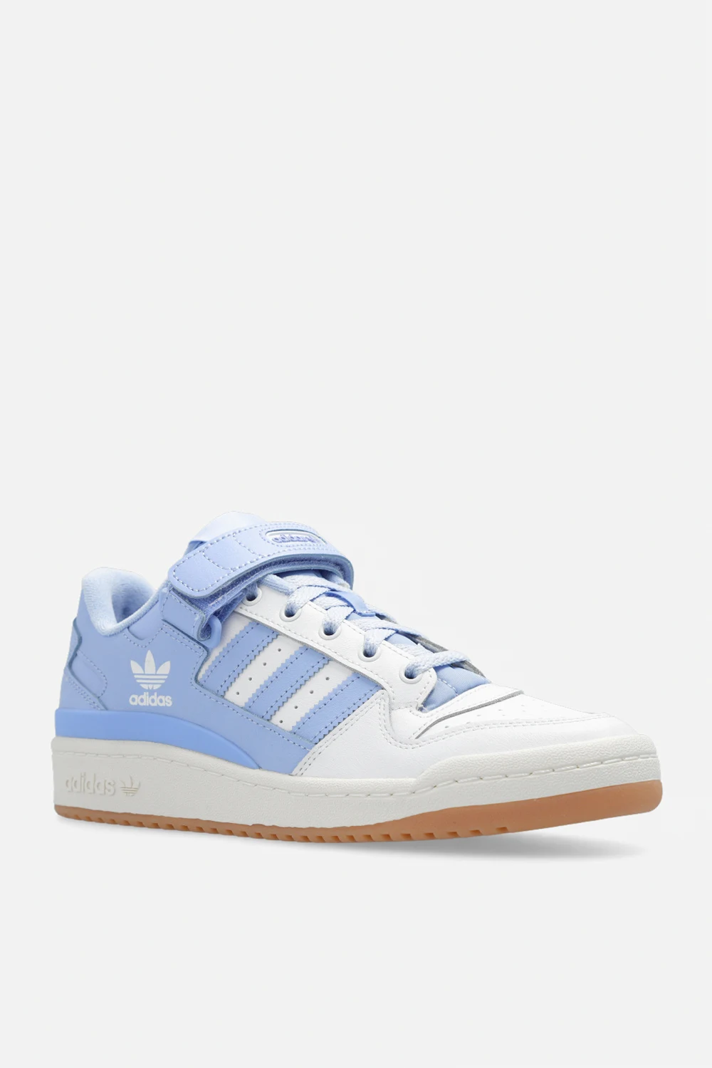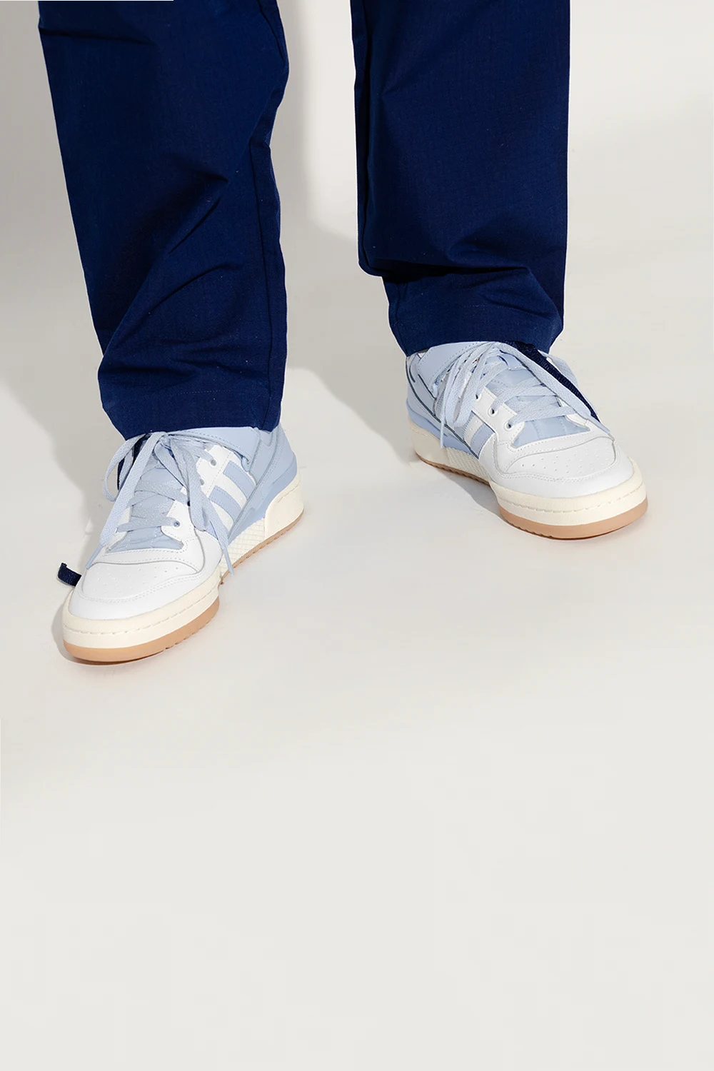 White, light blue and cream ‘FORUM LOW’ sneakers from ADIDAS Originals. Crafted from leather, this lace-up model sits on a cream rubber sole and showcases a velcro closure and the brand's signature three stripes.