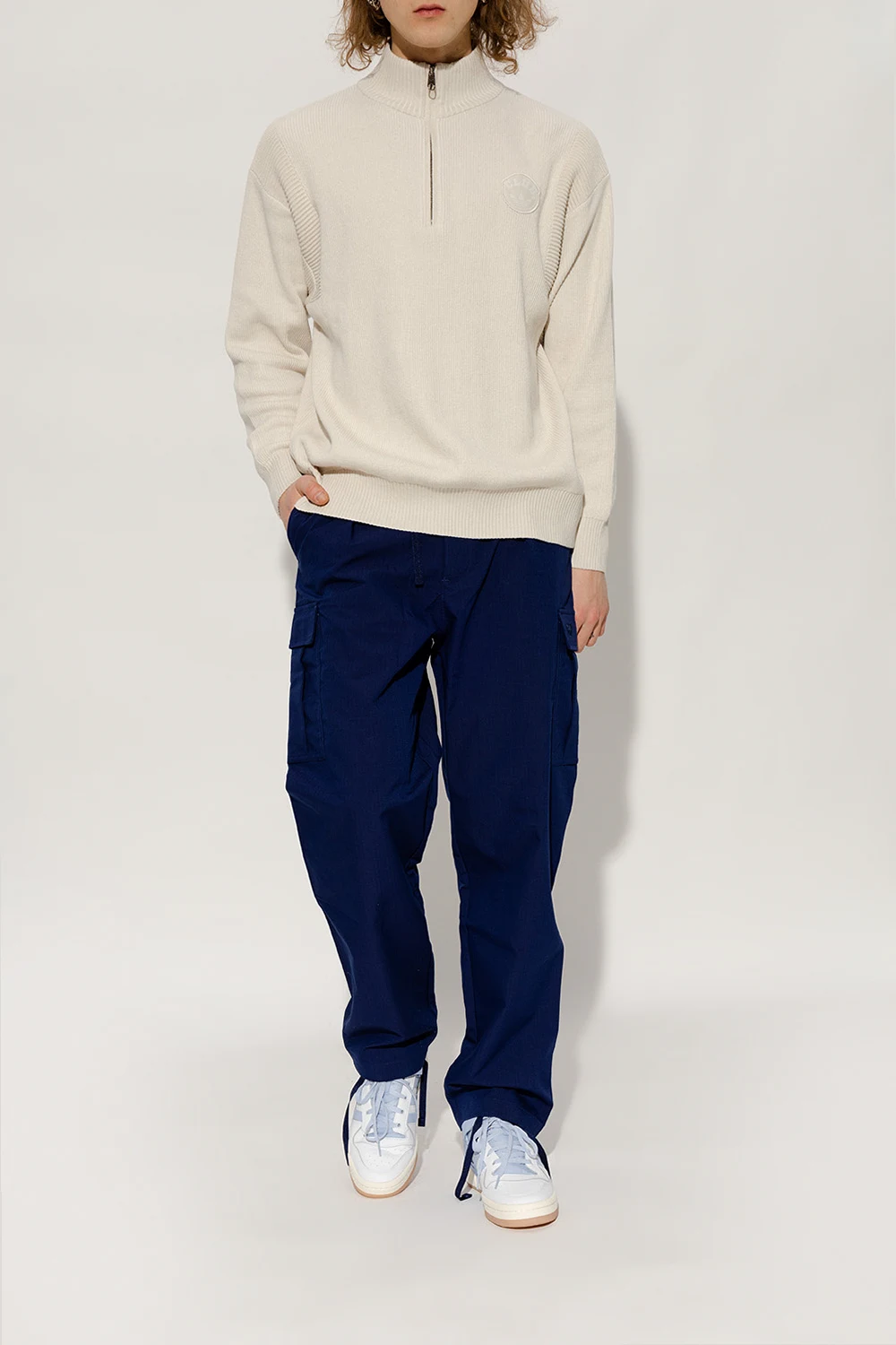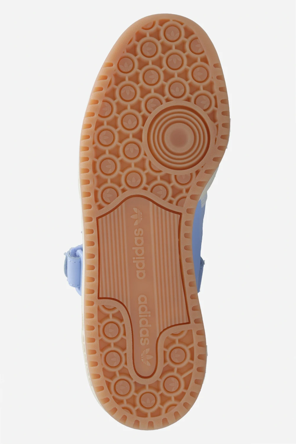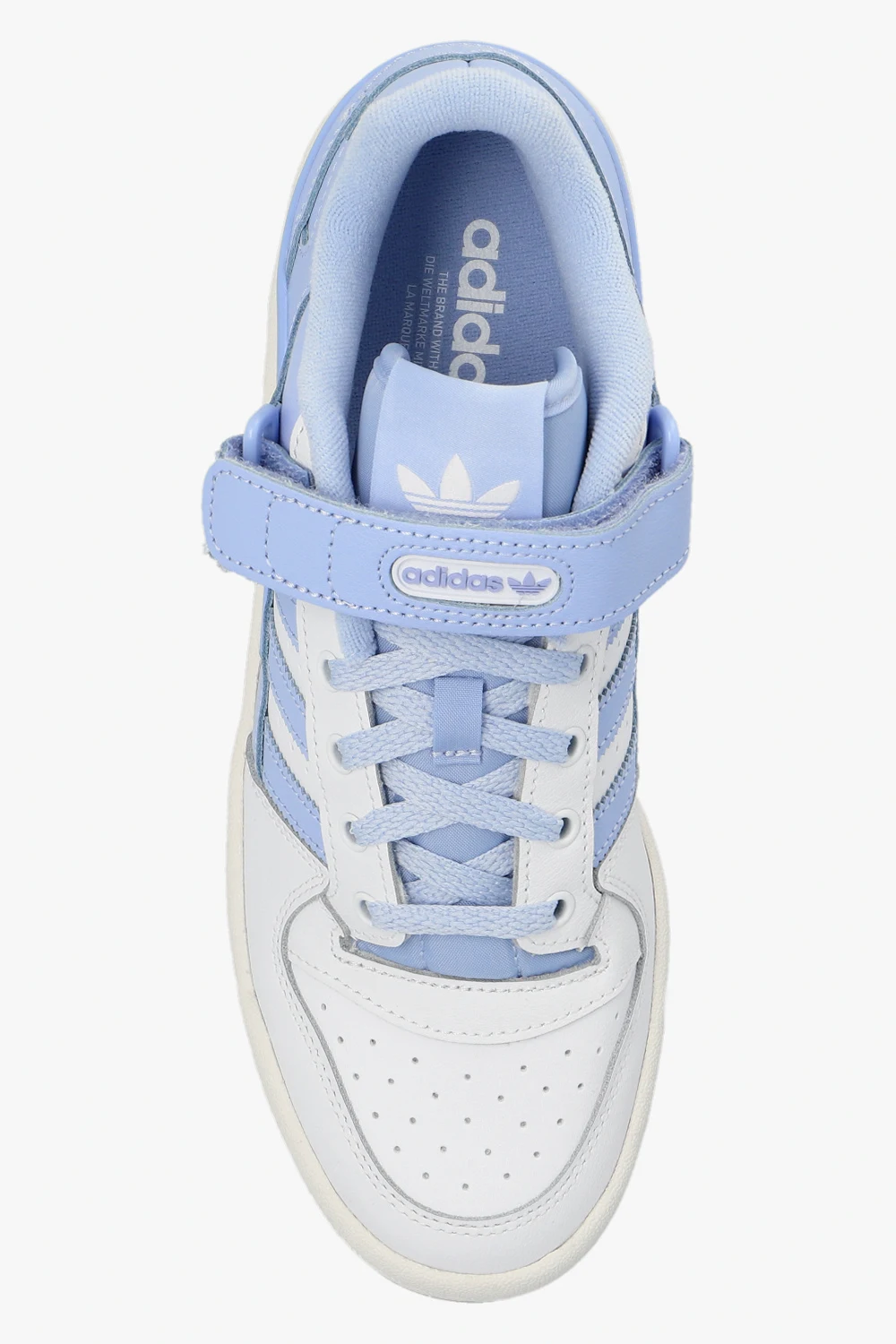 White, light blue and cream ‘FORUM LOW’ sneakers from ADIDAS Originals. Crafted from leather, this lace-up model sits on a cream rubber sole and showcases a velcro closure and the brand's signature three stripes.