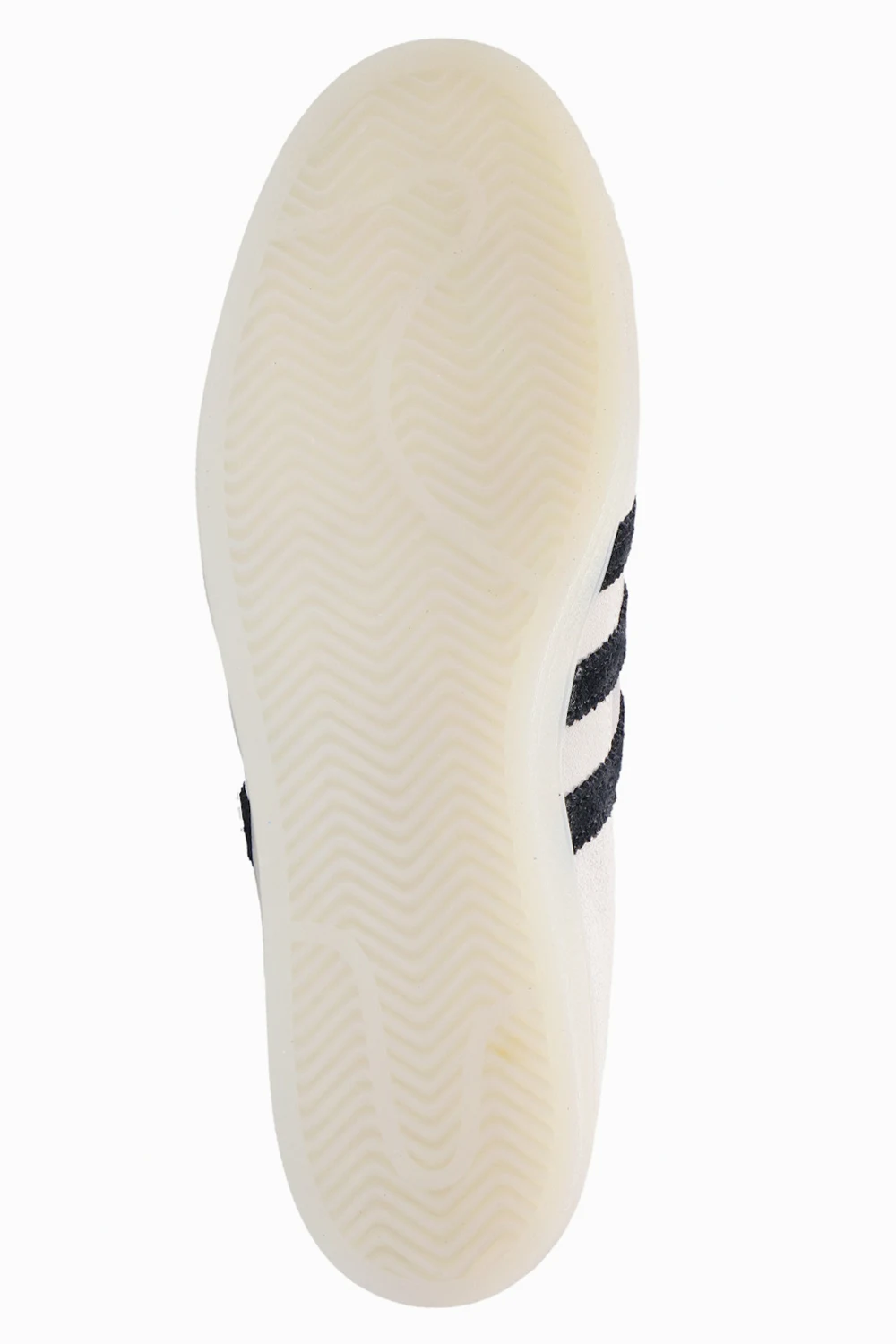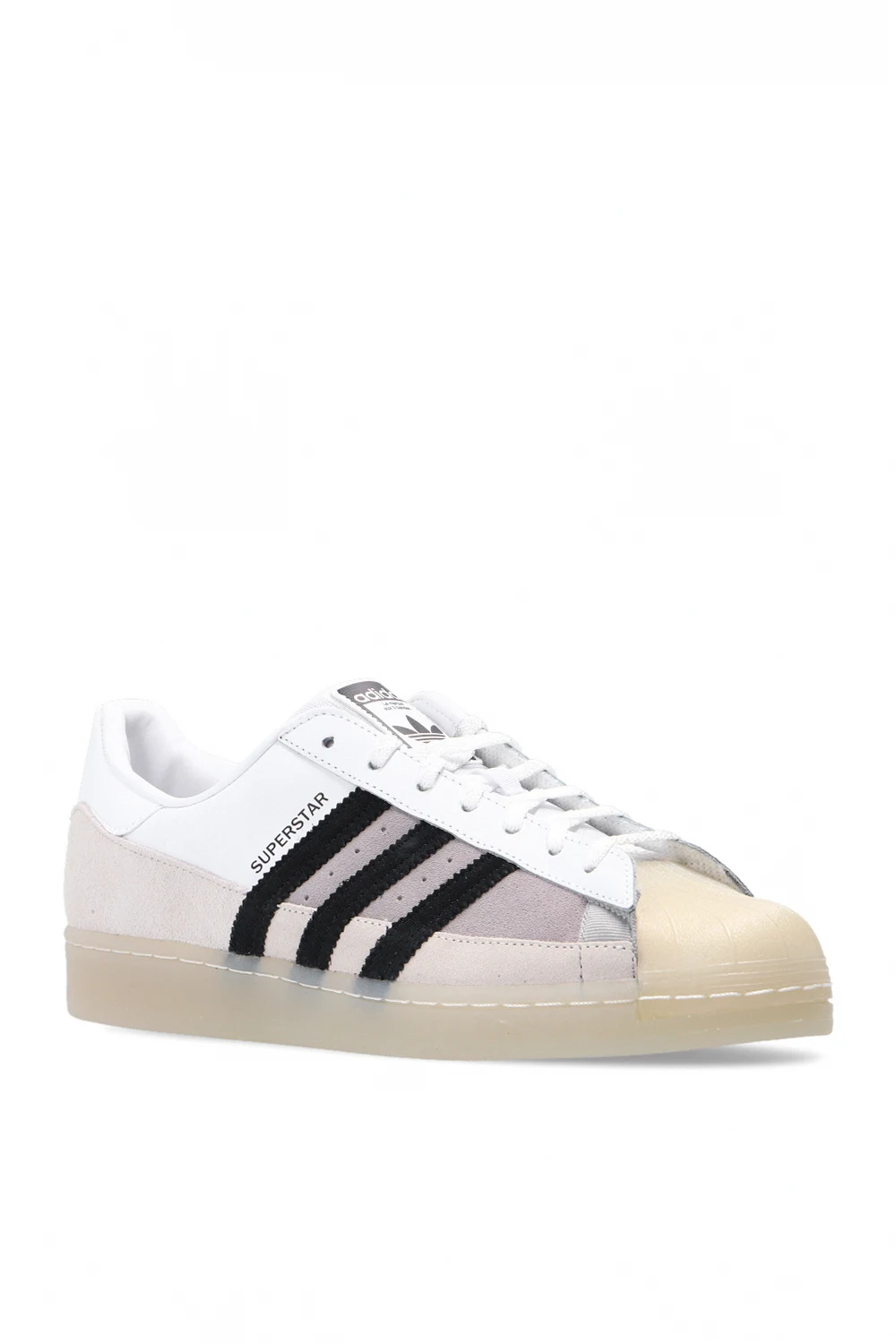 White and beige ‘Superstar’ sneakers from ADIDAS Originals. Crafted from leather, this lace-up pair sits on a beige rubber sole and showcases the label’s signature rubber shell toe, a black logo print on the tongue as well as perforations and the iconic three stripes in black on the sides.
