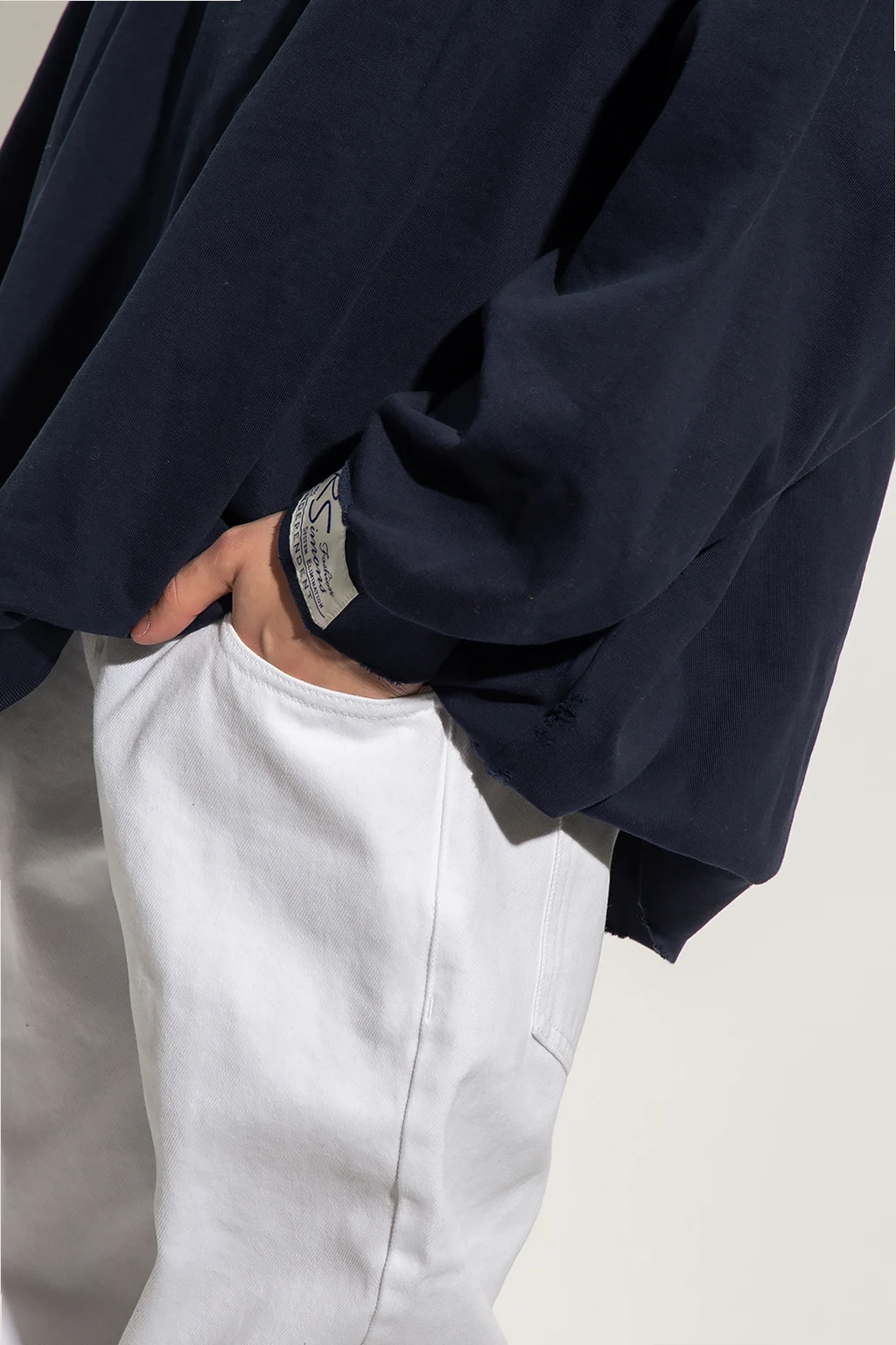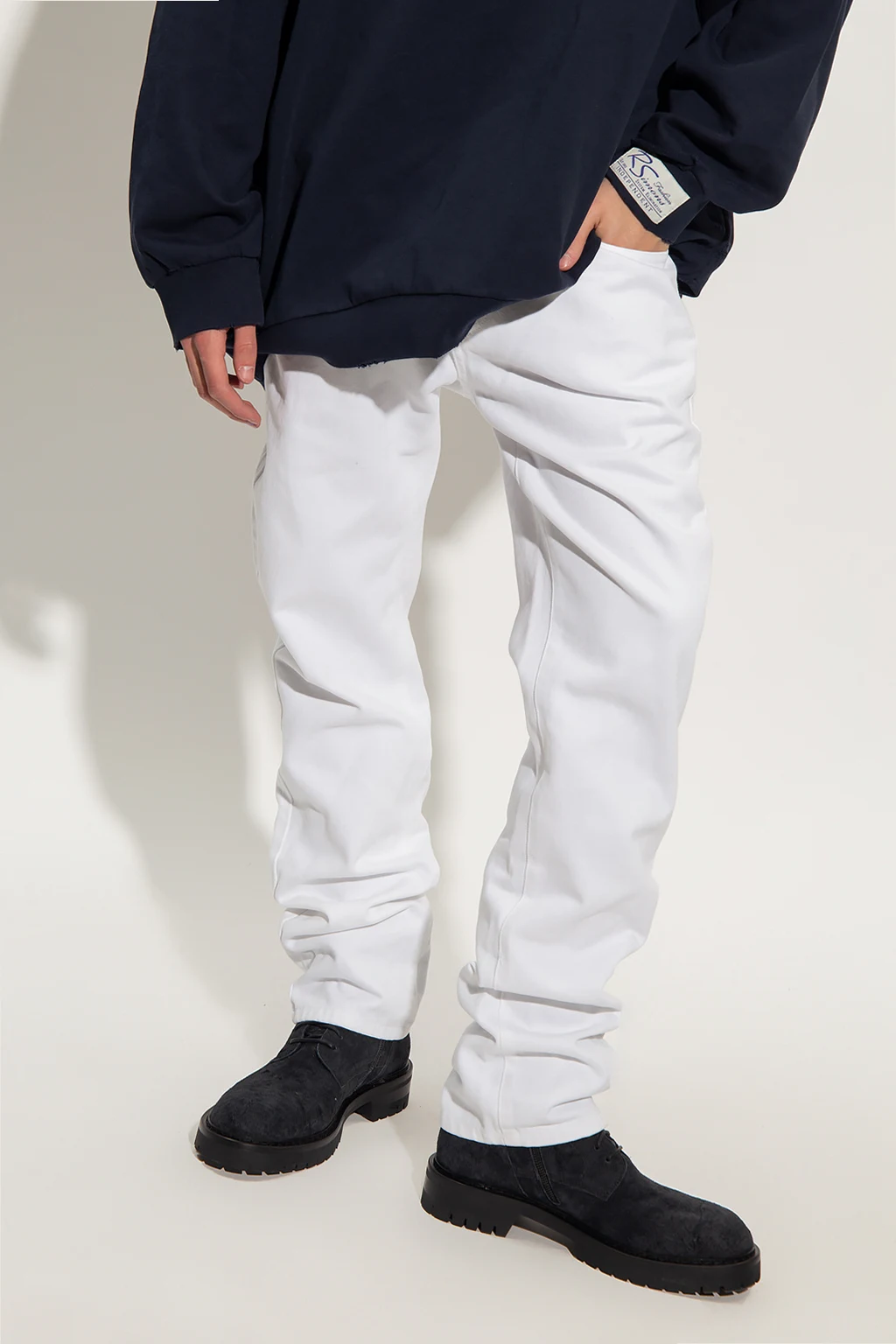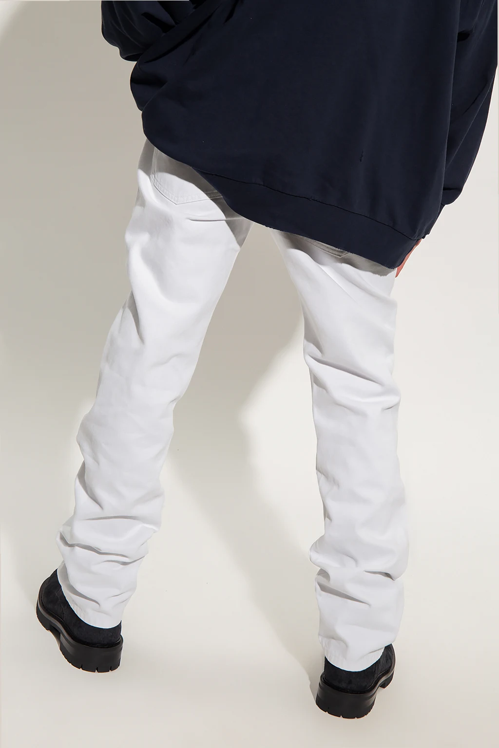 White slim jeans from Raf Simons. Fastened with a zip and button, this pair features a logo-embossed patch at the back, three front pockets and two back pockets.