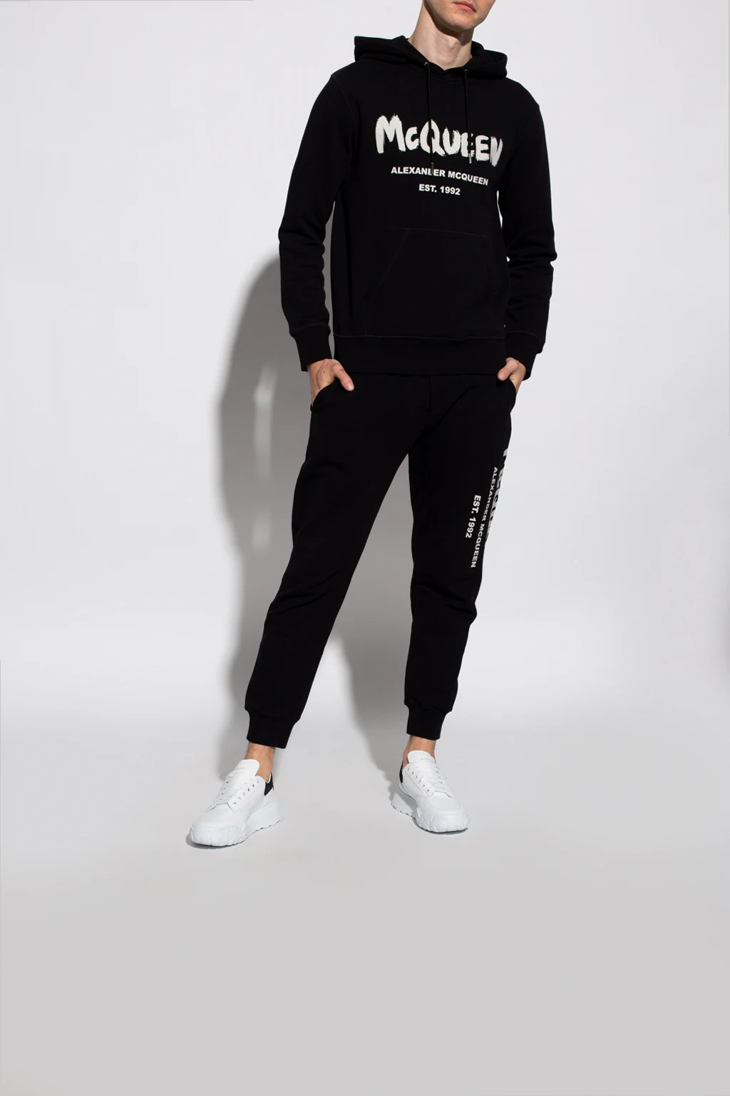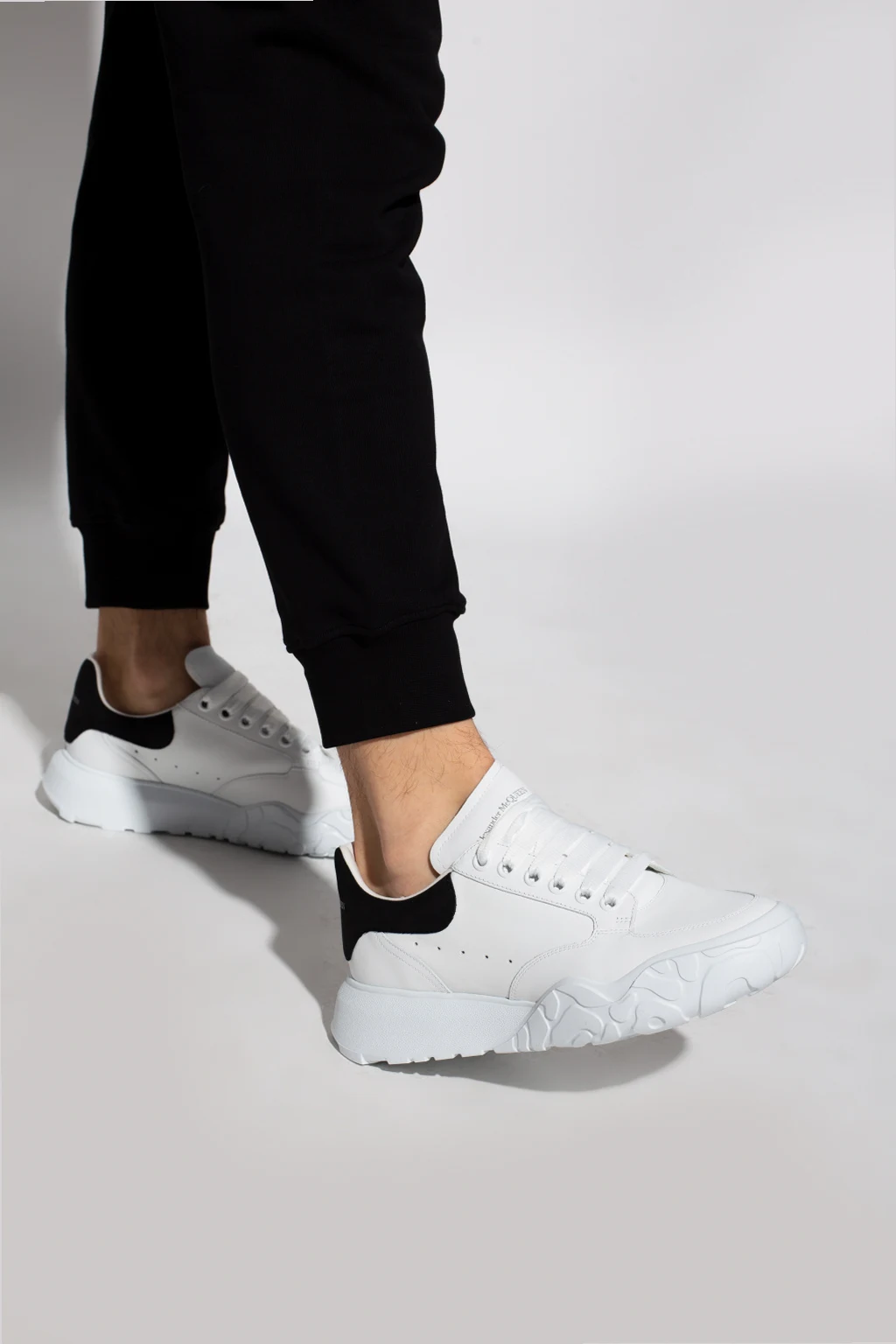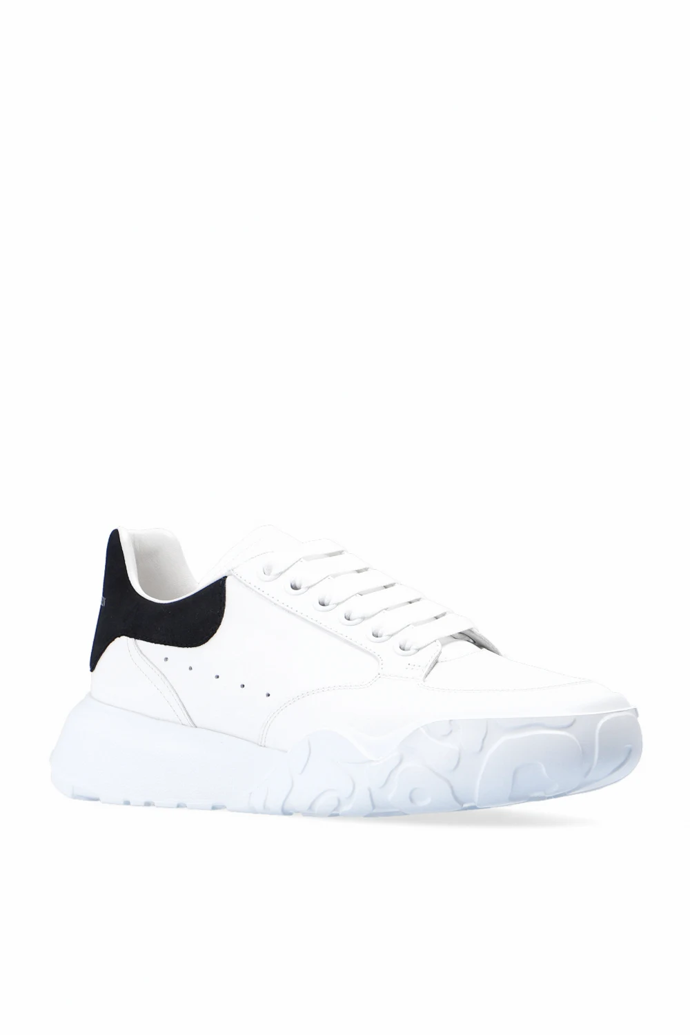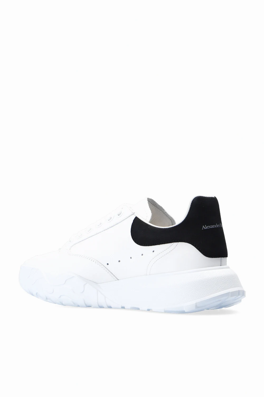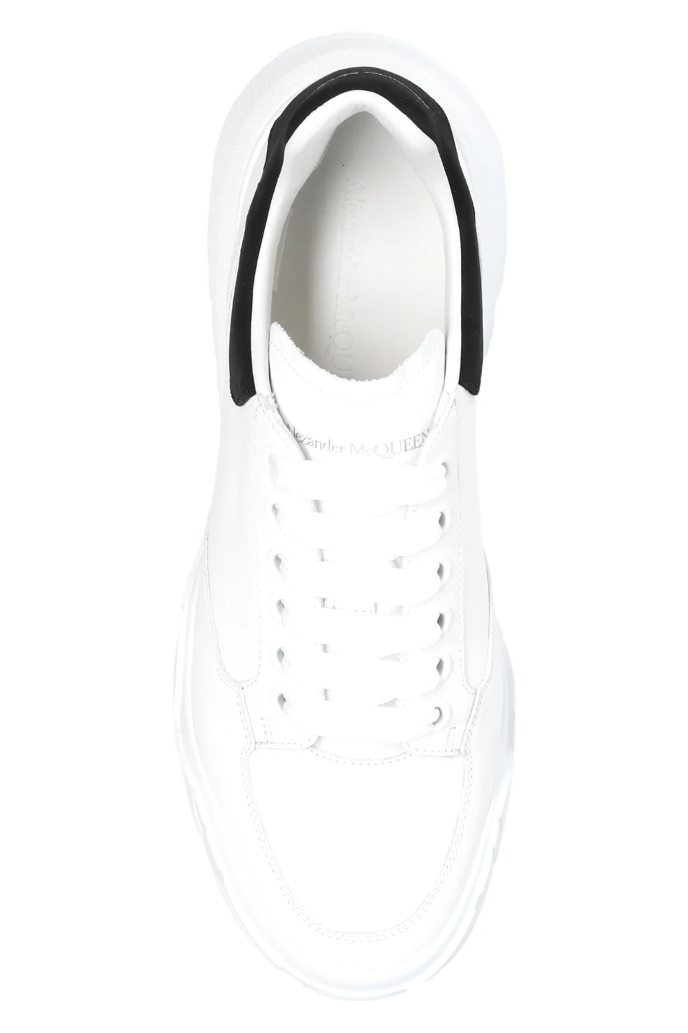 White sneakers from Alexander McQueen. Crafted from leather, this lace-up pair sits on a white rubber sole and features a logo print and a black suede heel counter.