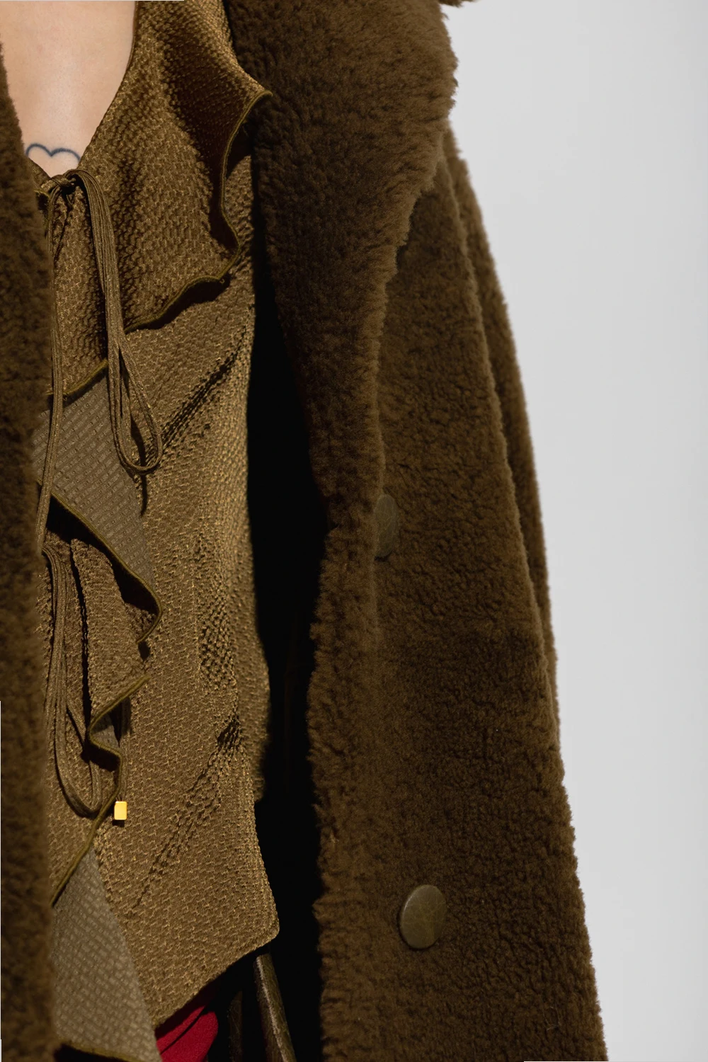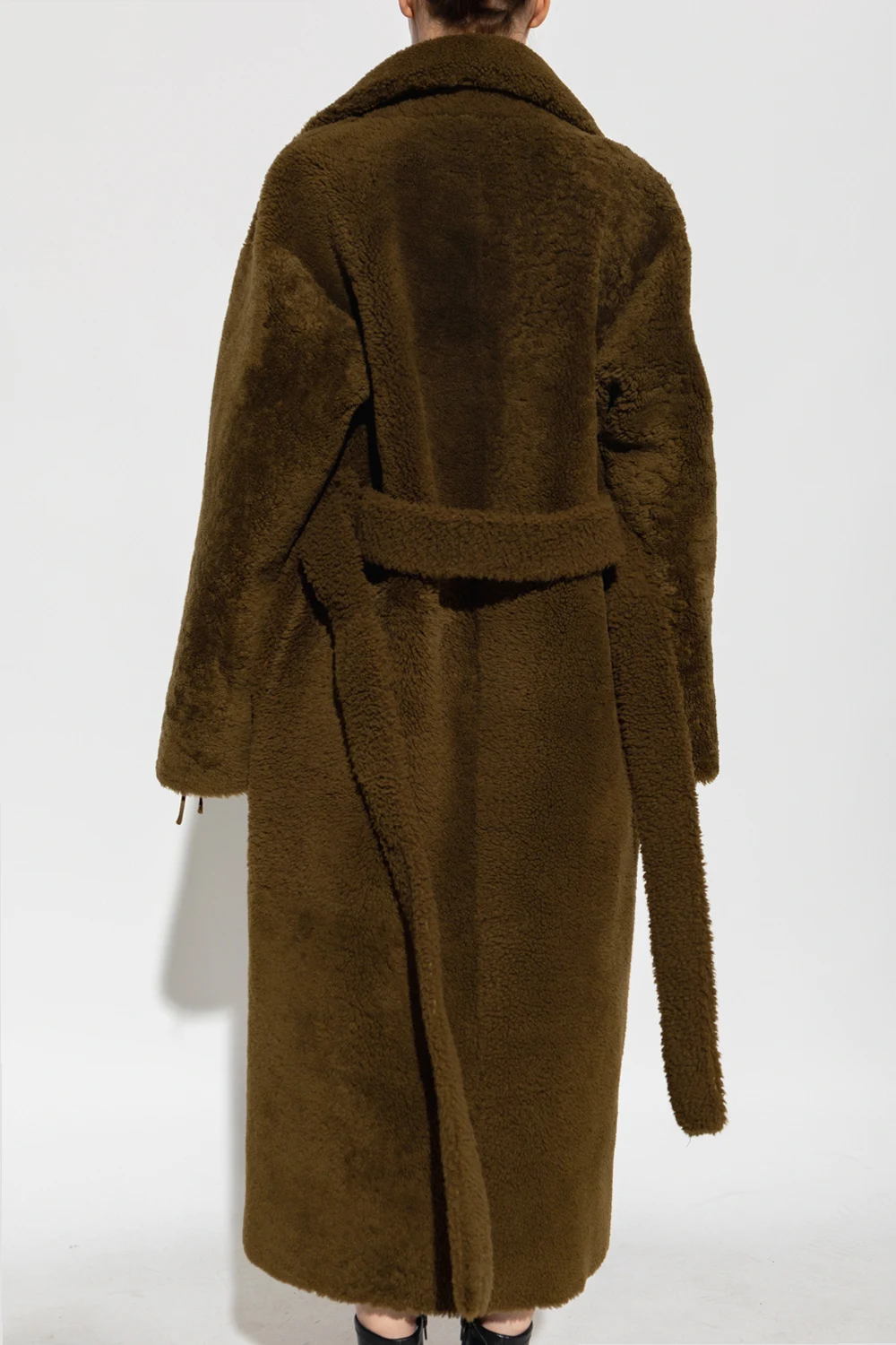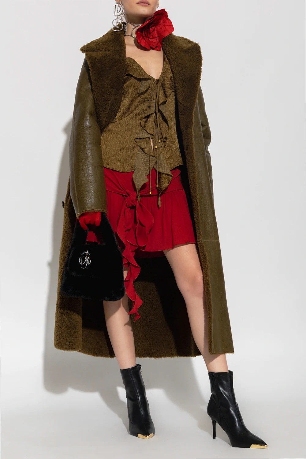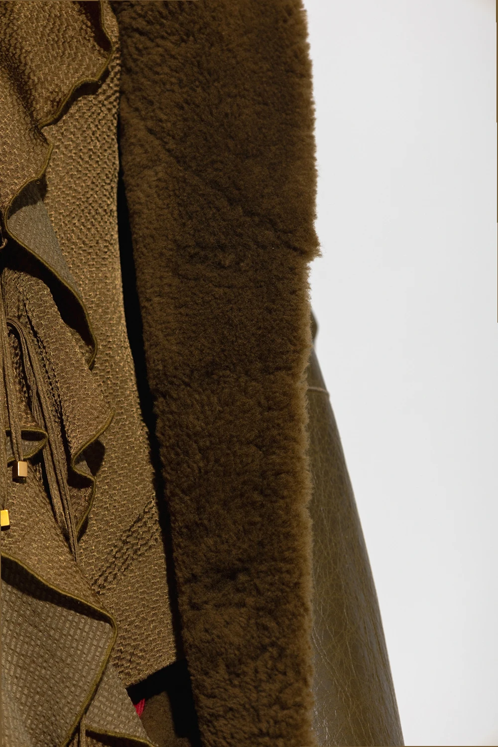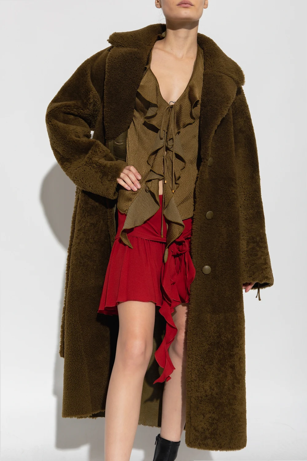 Khaki reversible coat from Blumarine. Tied at the waist with a removable belt and fastened with buttons, this long sleeve design features a sheep fur side and leather side with two slip pockets.