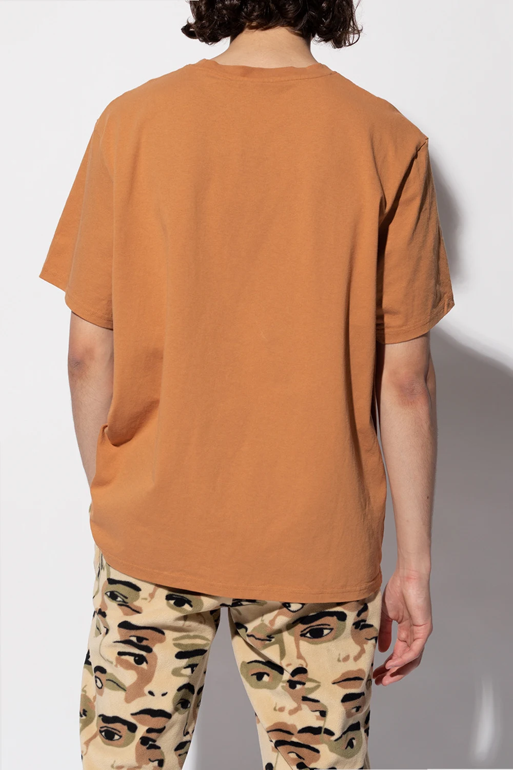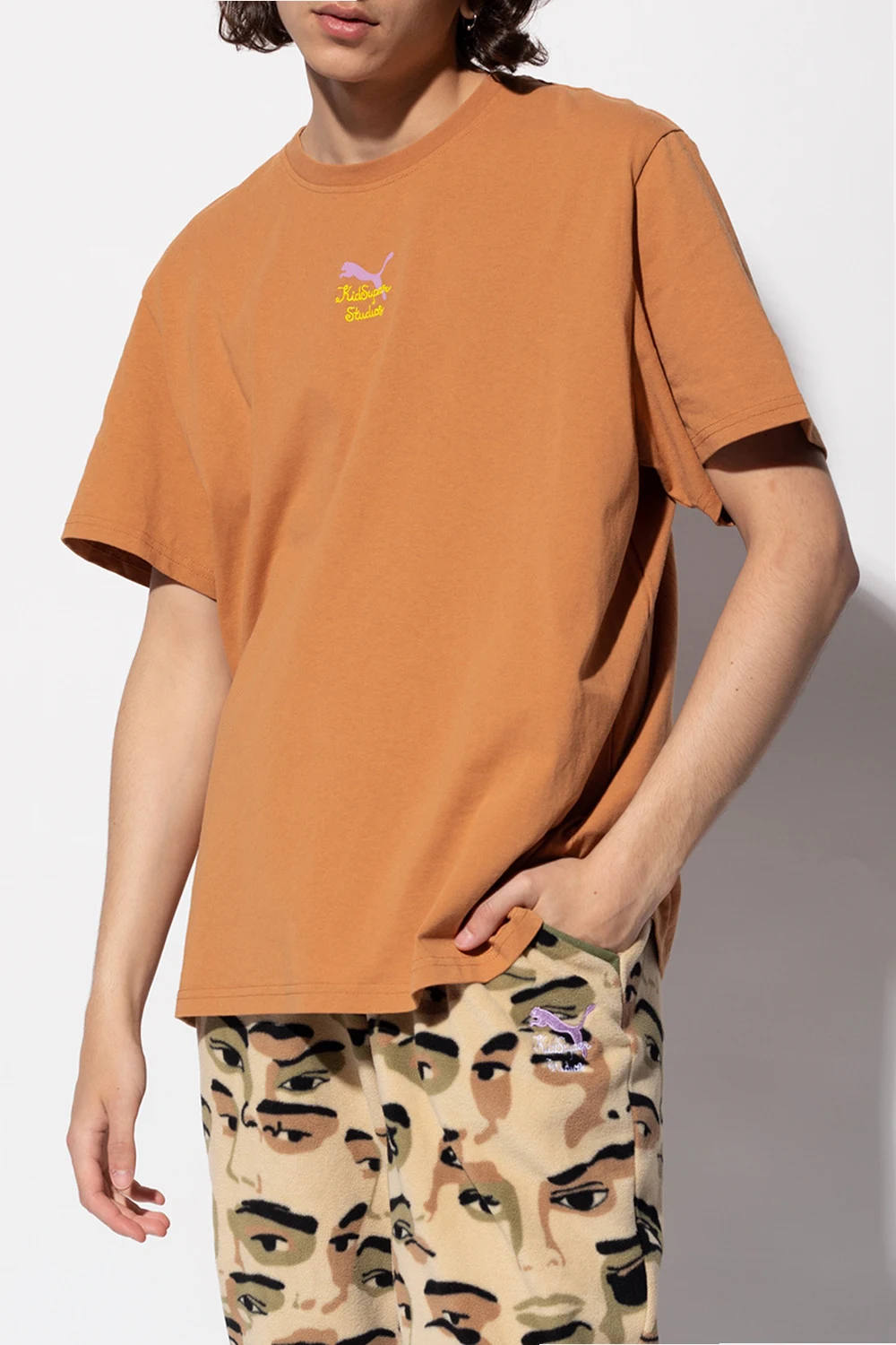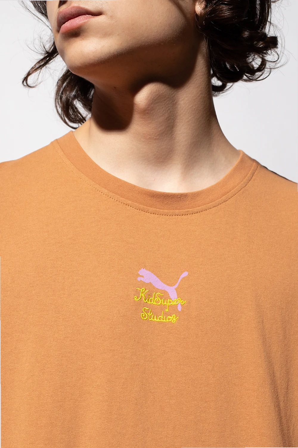 Light brown crewneck T-shirt from Puma x Kidsuper Studios. Made of cotton, this garment is decorated with a purple logo print and yellow logo embroidery.