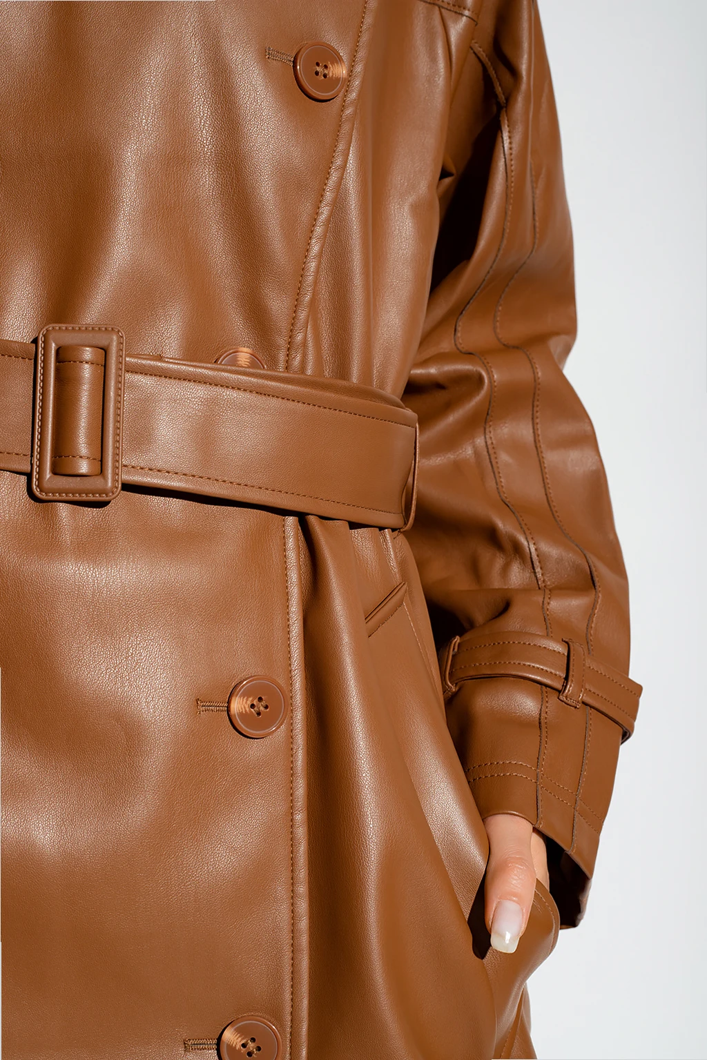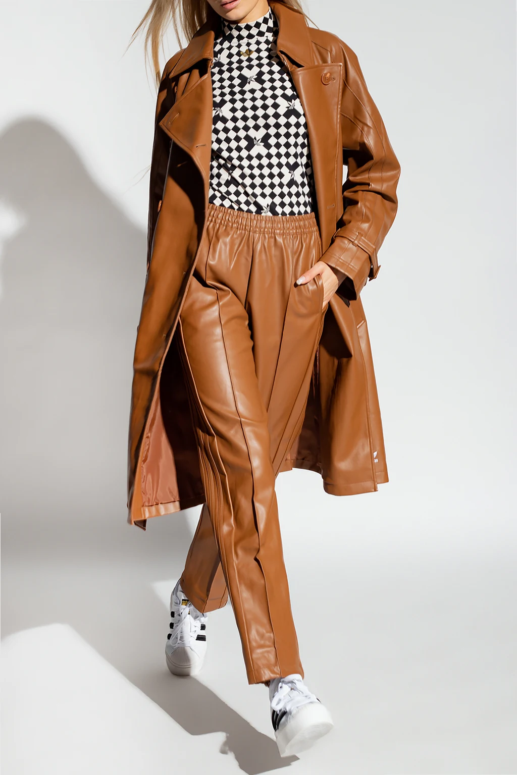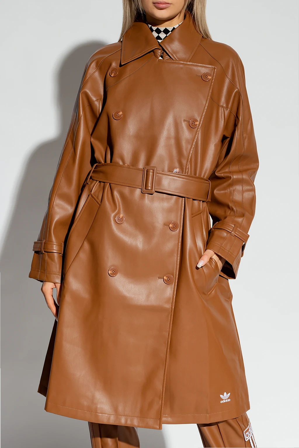 Brown trench coat from ADIDAS Originals. Crafted from vegan leather with a double-breasted silhouette, this style features button fastenings, a waist-cinching buckle belt, white logo embroidery, two frontal pockets, long sleeves and a single back vent.
