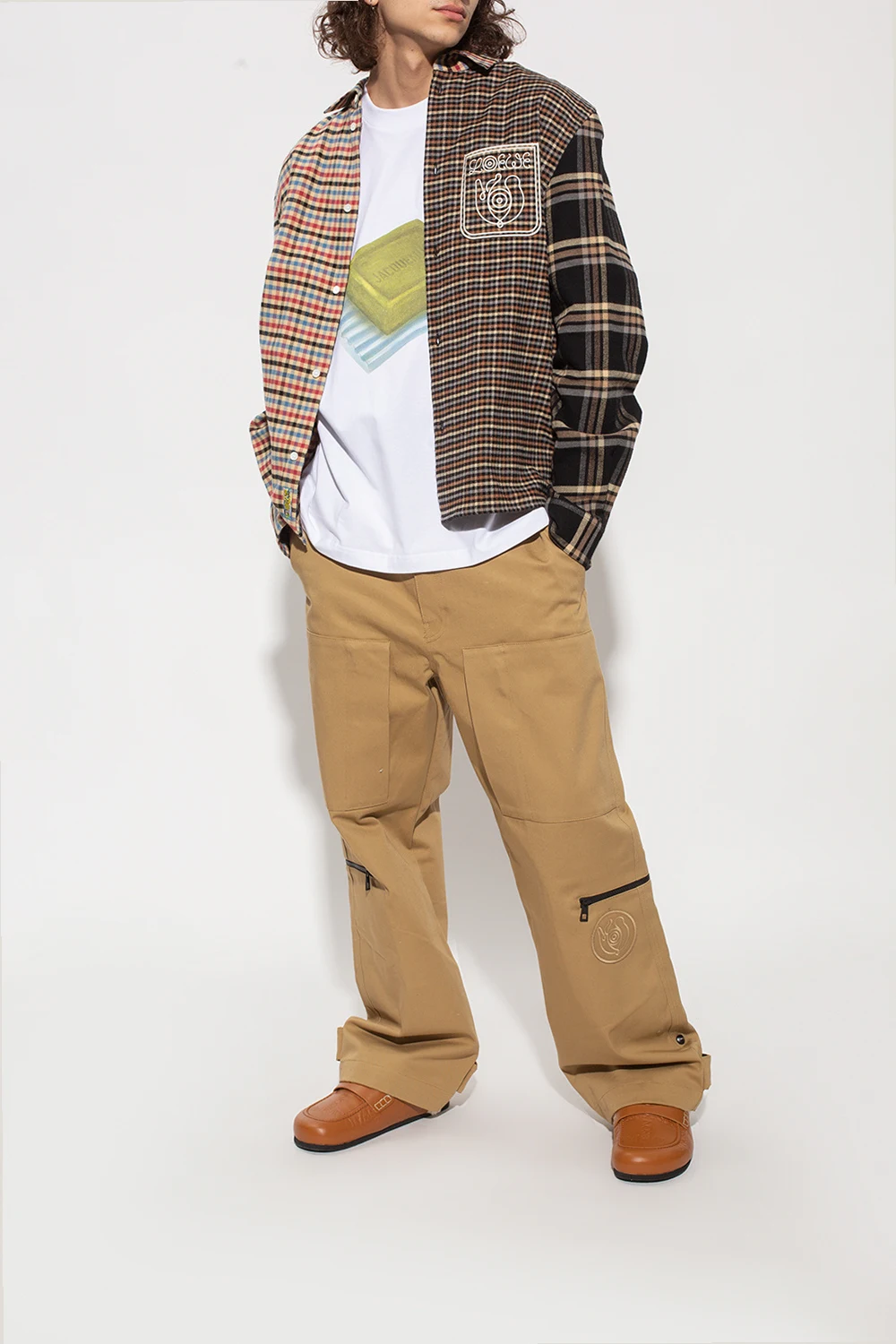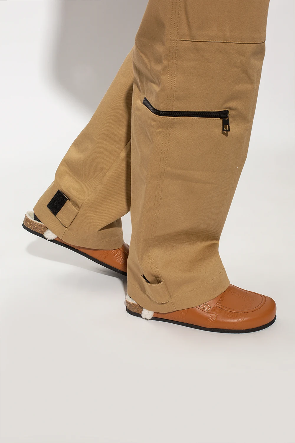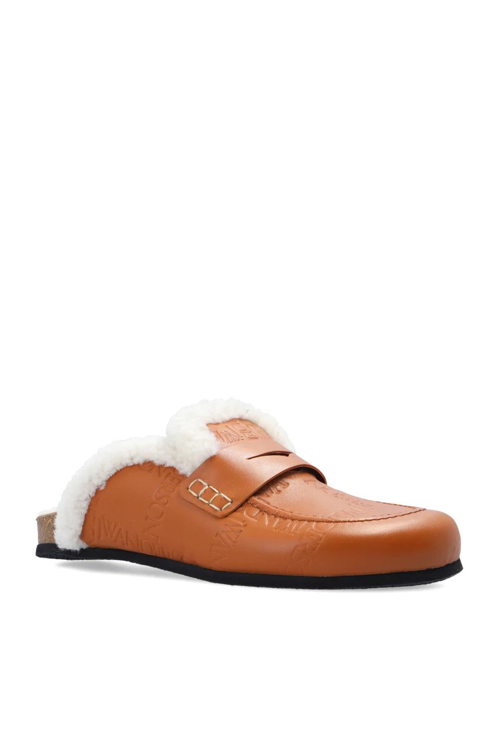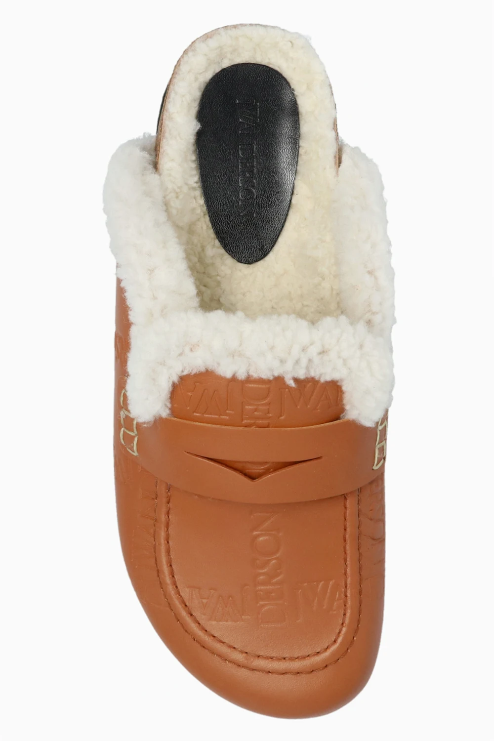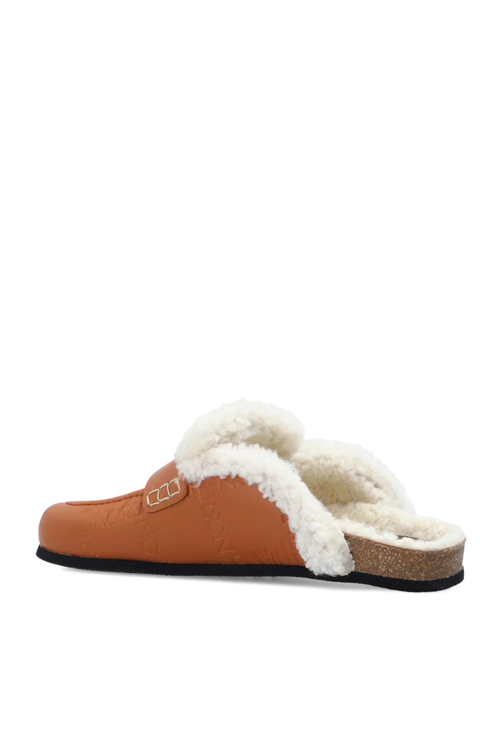 Brown slides from JW Anderson. Crafted from leather, this model features an embossed logo, a black rubber sole and white shearling insole.