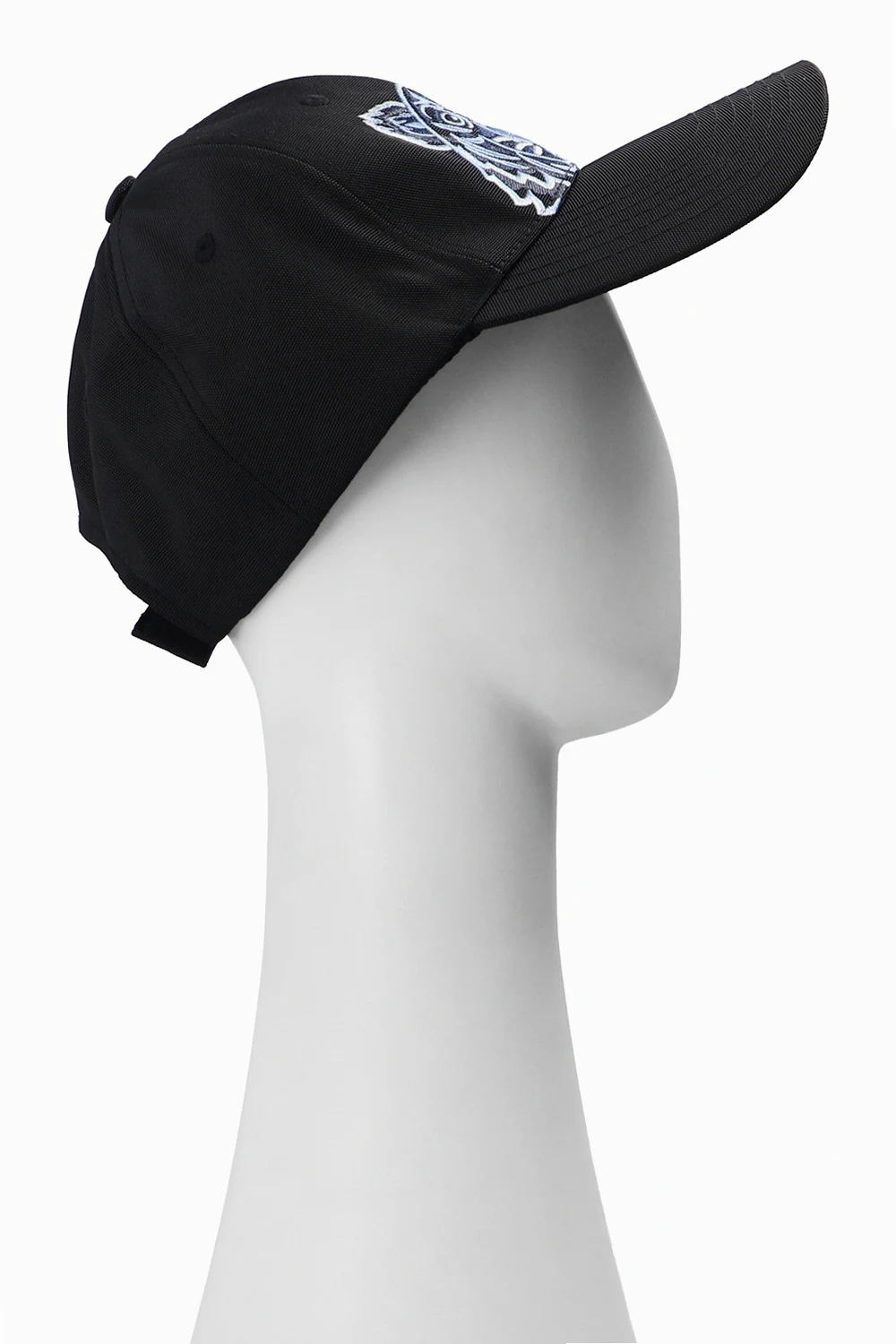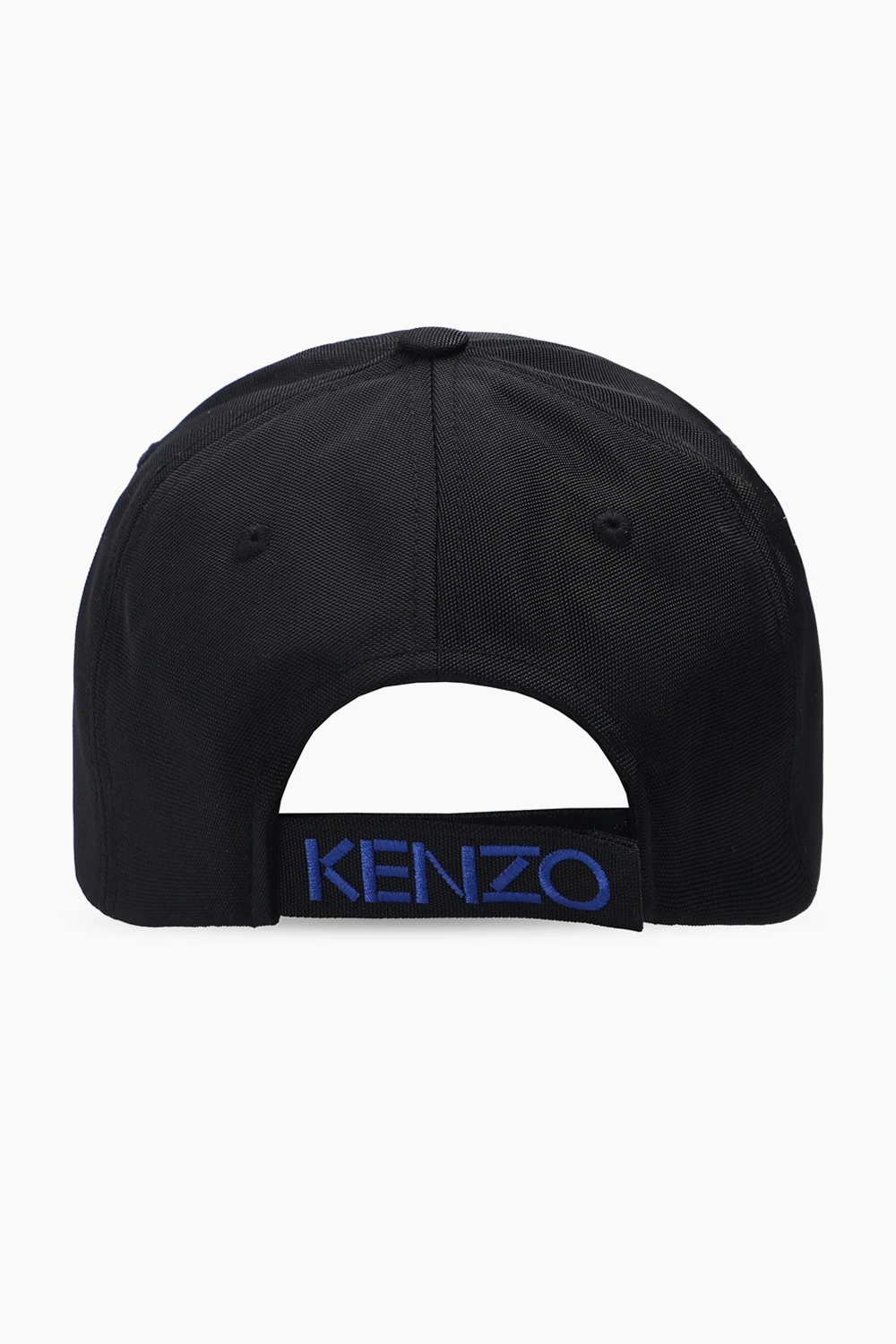 Black baseball cap from Kenzo. This design features a velcro strap at the back and an embroidered logo pattern in blue and white.