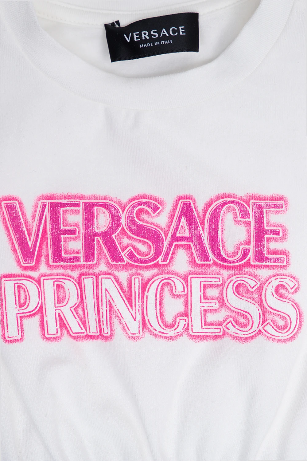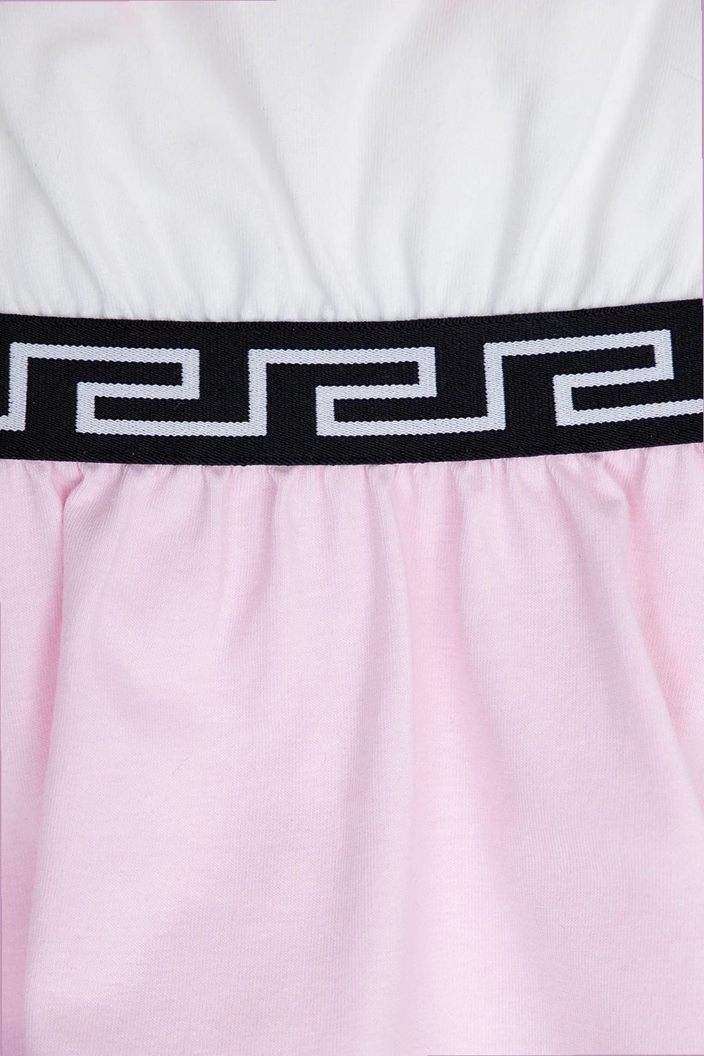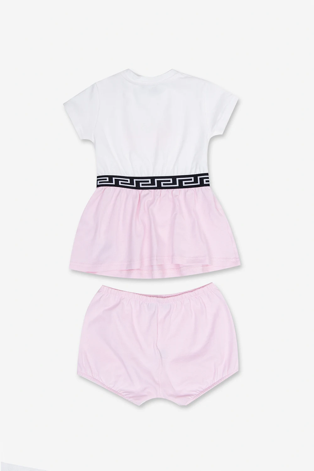 White and pink baby apparel set from Versace Kids. Made of cotton, it includes a dress featuring a black elastic waistband with a gold-tone Greca border, a logo print on the front, a round neck and short sleeves and knickers with an elasticated waistband.