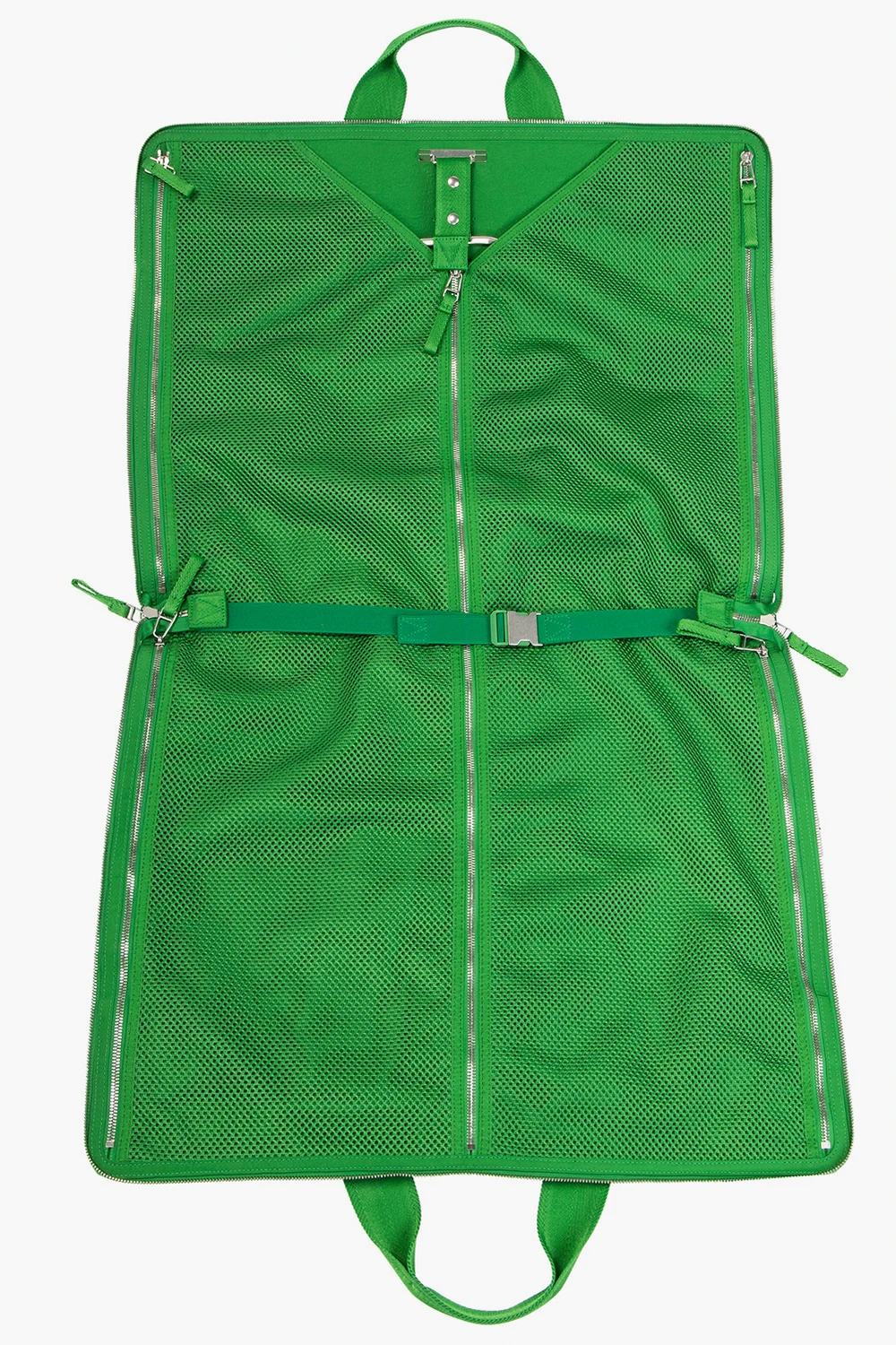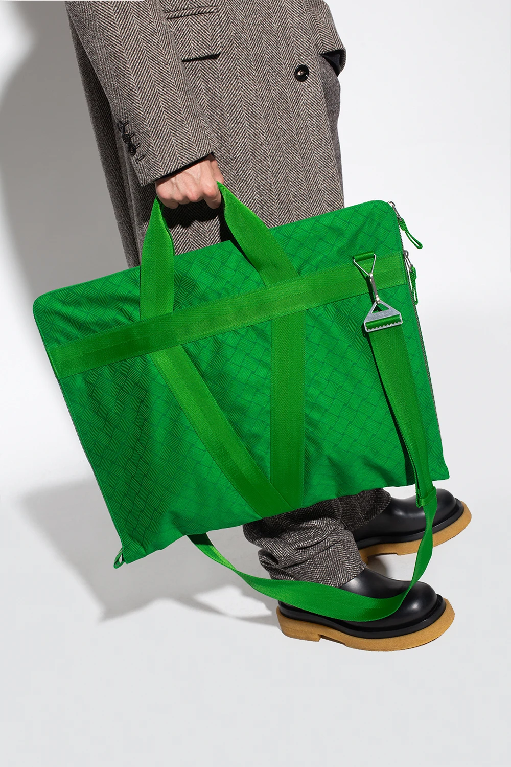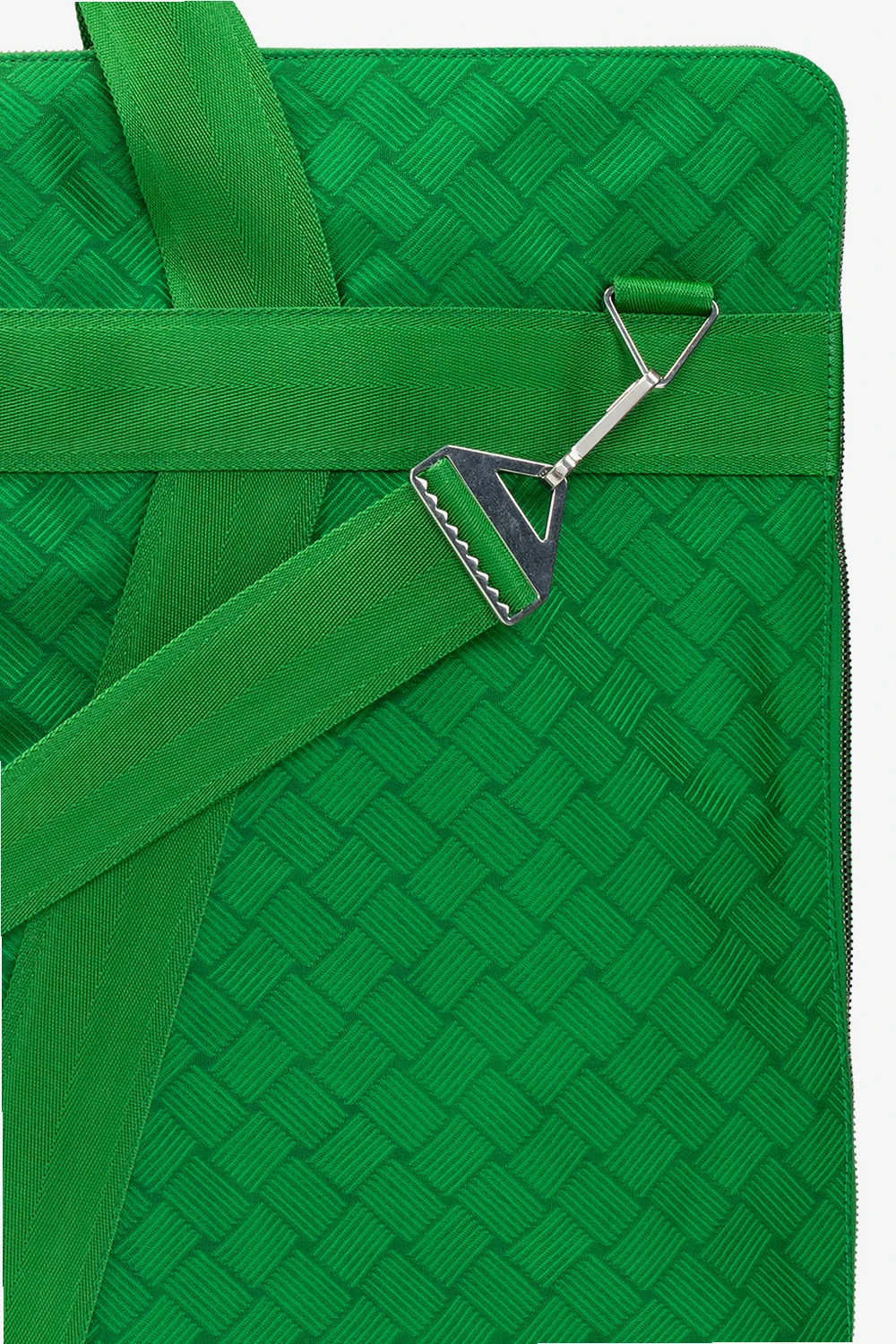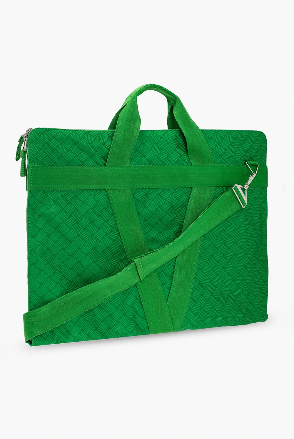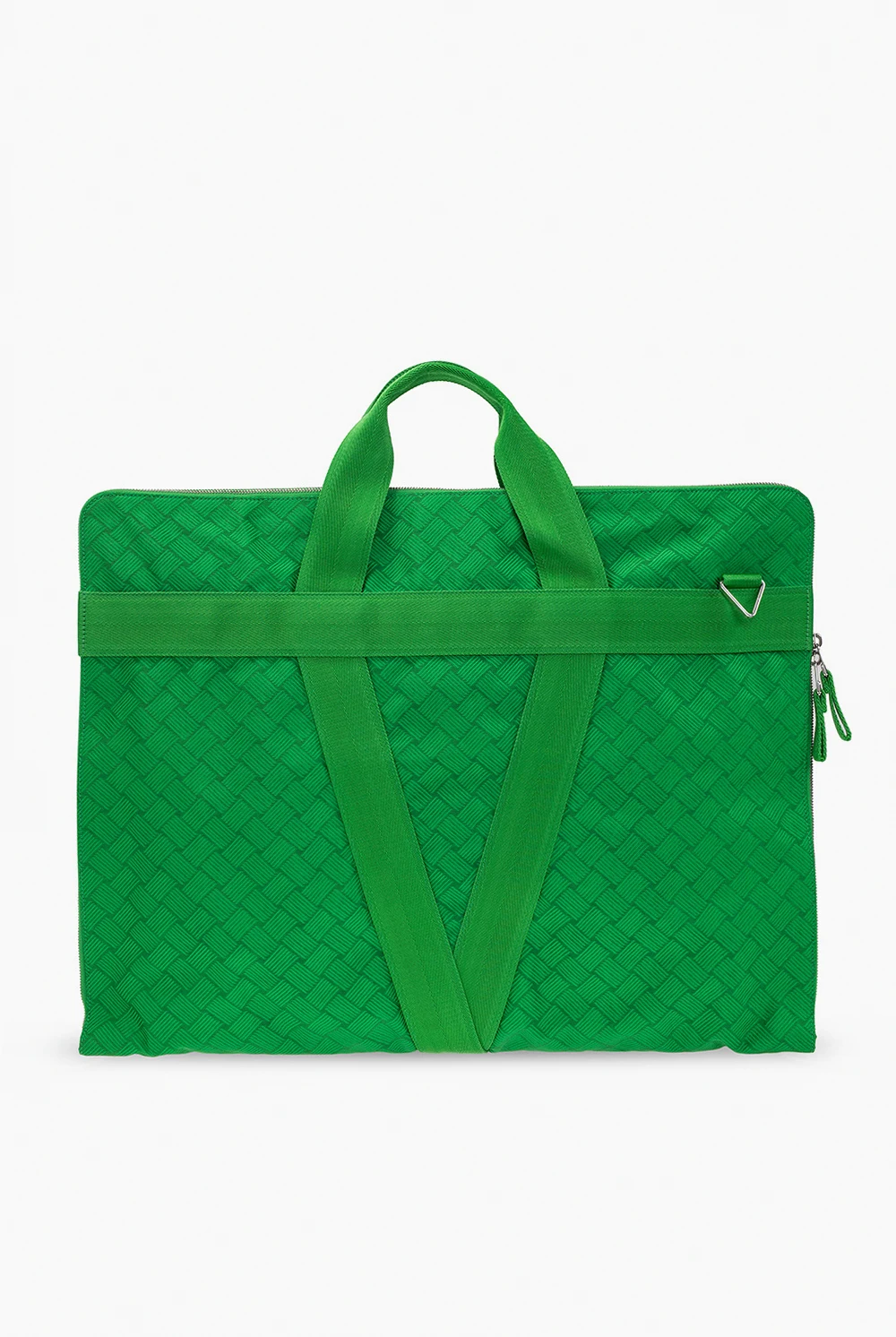 Green suit carrier from Bottega Veneta. Accentuated with the brand's iconic 'Intrecciato' weave, this item features a two-way zip fastening, two half-round handles, a detachable and adjustable strap and one internal compartment.