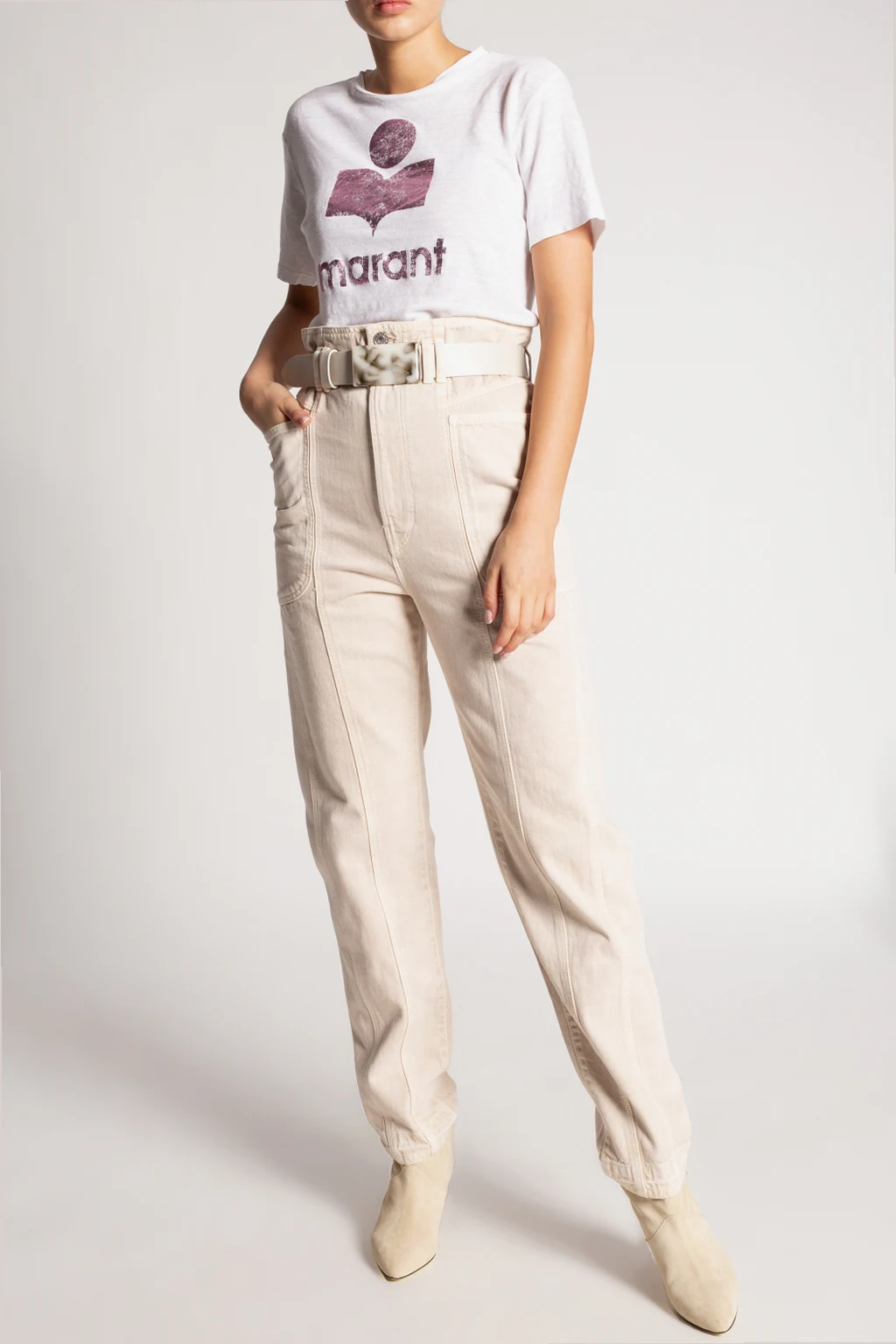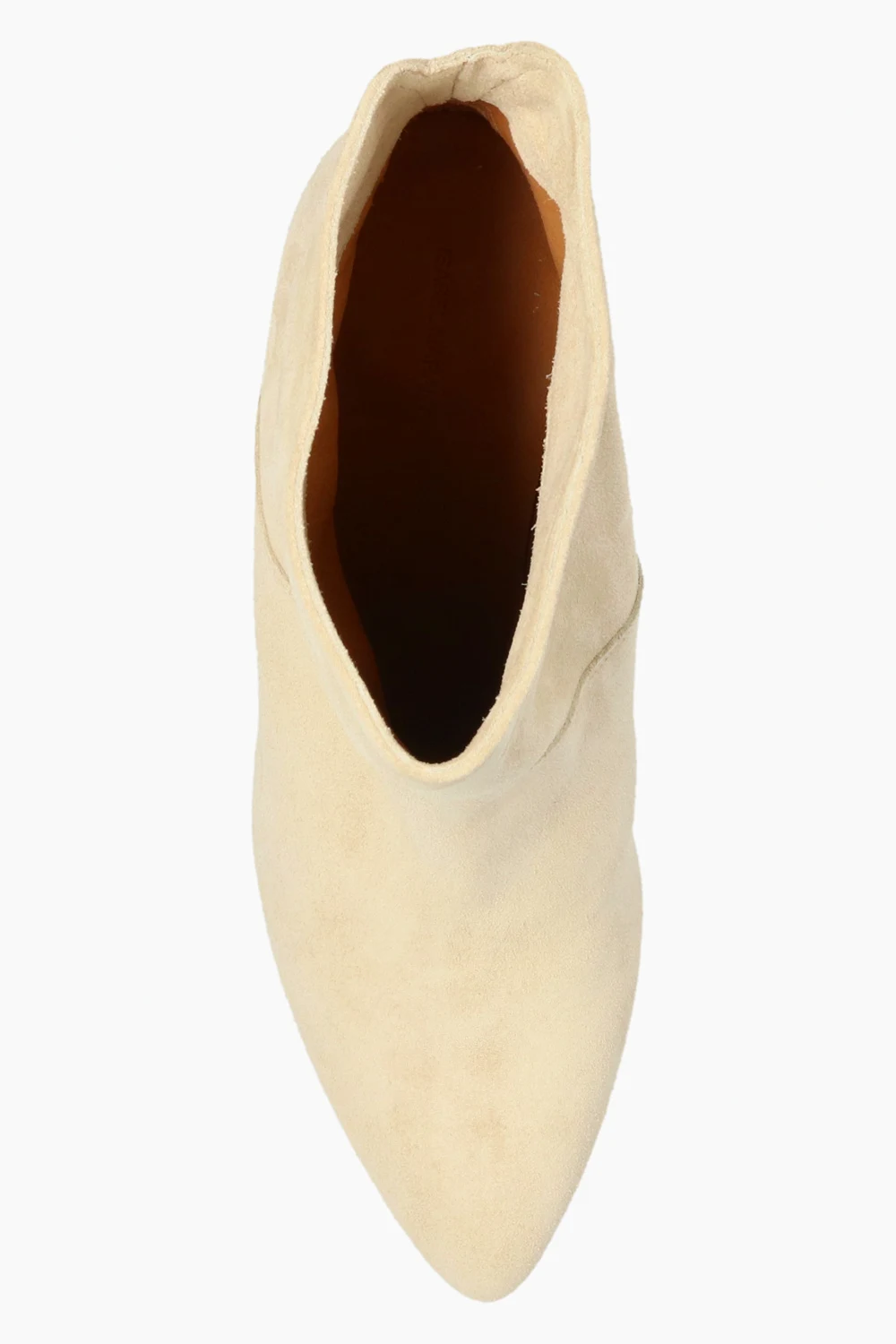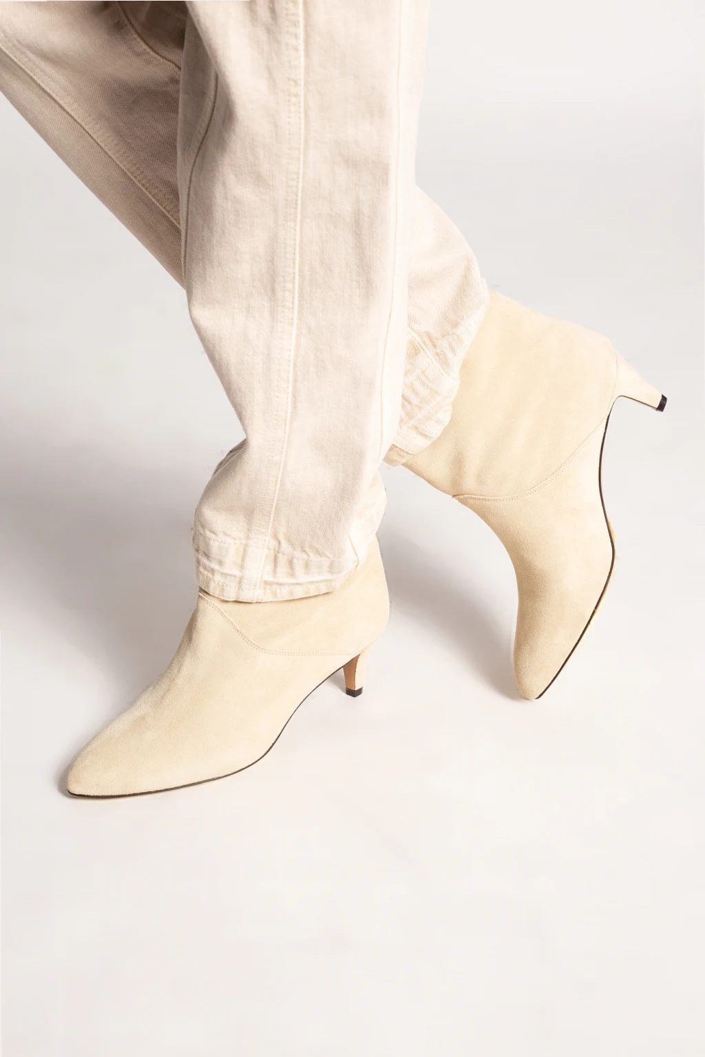 Beige ‘Defya’ heeled ankle boots from Isabel Marant. Made of suede, this pair rests on a brown leather sole.