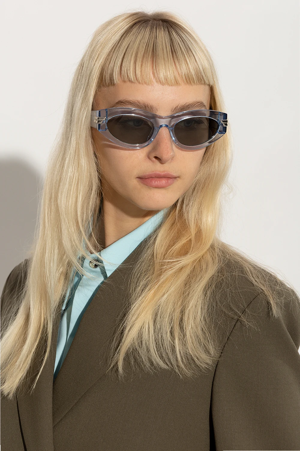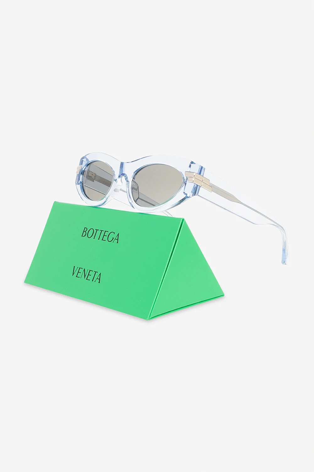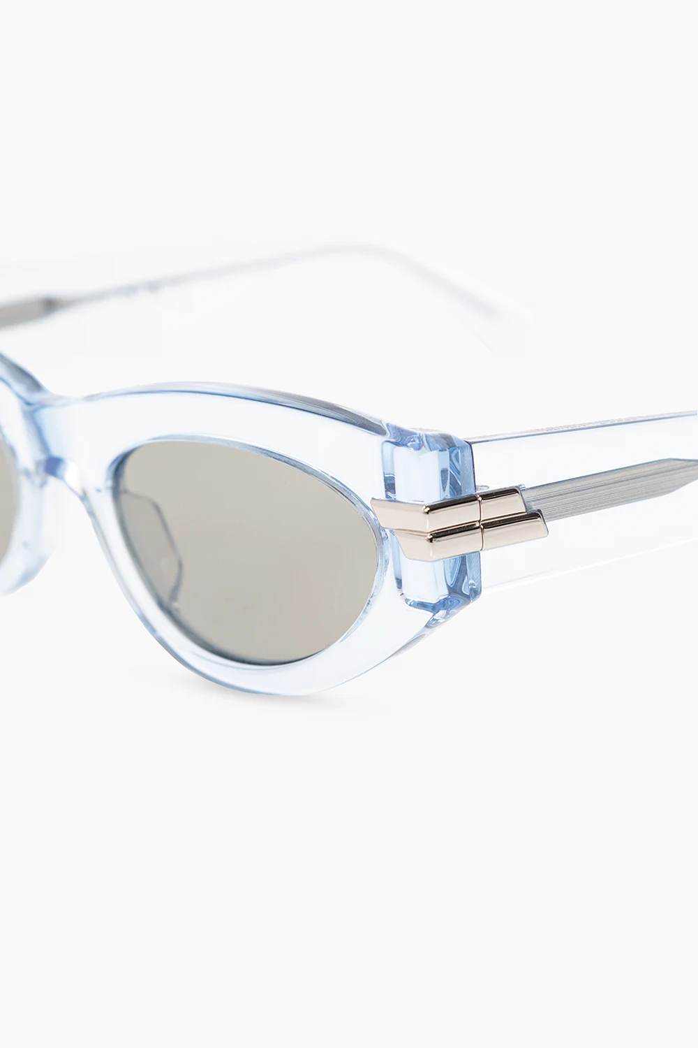 Light blue cat-eye sunglasses from Bottega Veneta. Crafted with a transparent finish, this pair features the brand's signature silver-tone application on the temples and grey lenses with 100% UV protection. Case included.