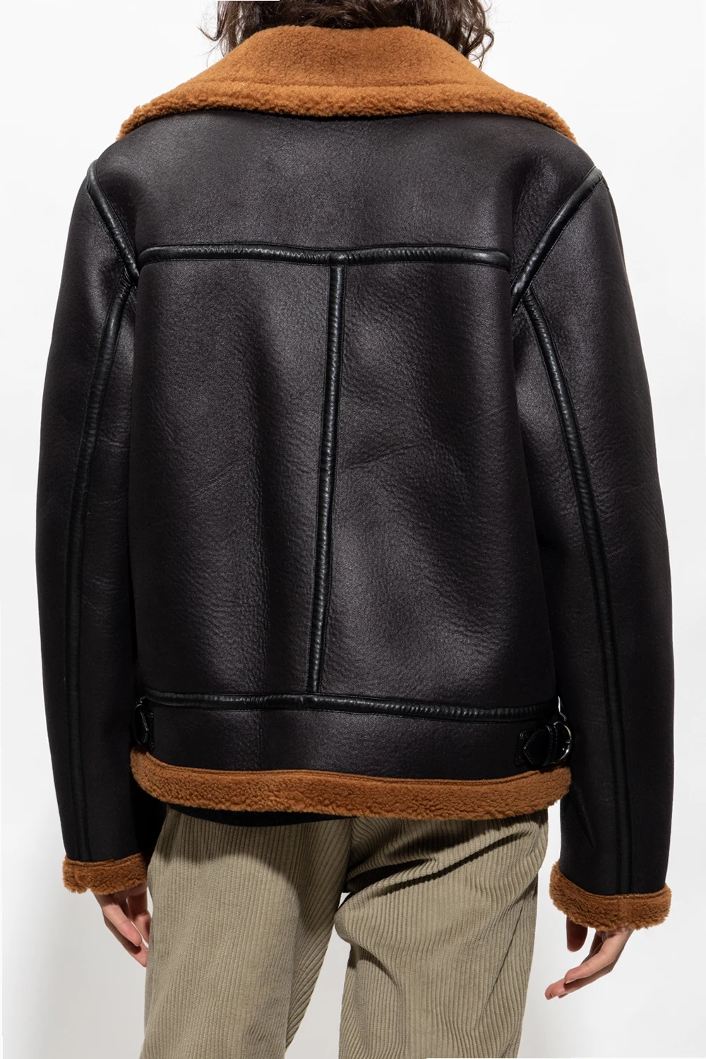 Black ‘Psagz’ coat from A.P.C. Crafted from faux leather, this style features a cropped silhouette, a zip fastening, two flapped pockets, long sleeves and brown faux shearling trims.
