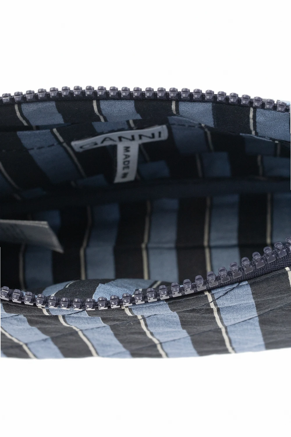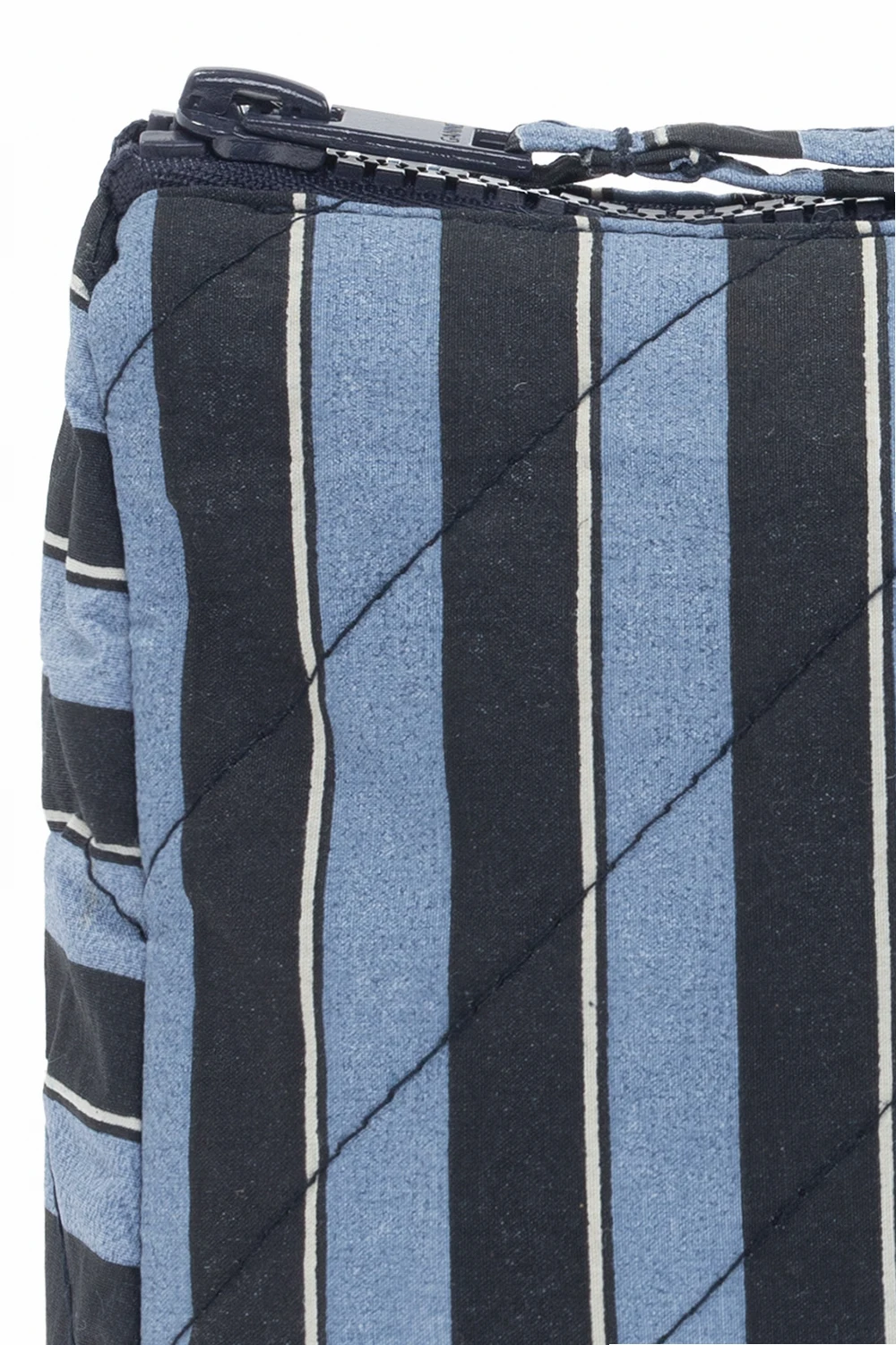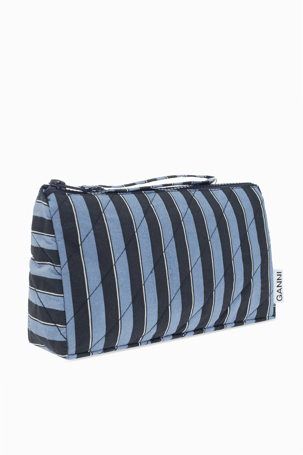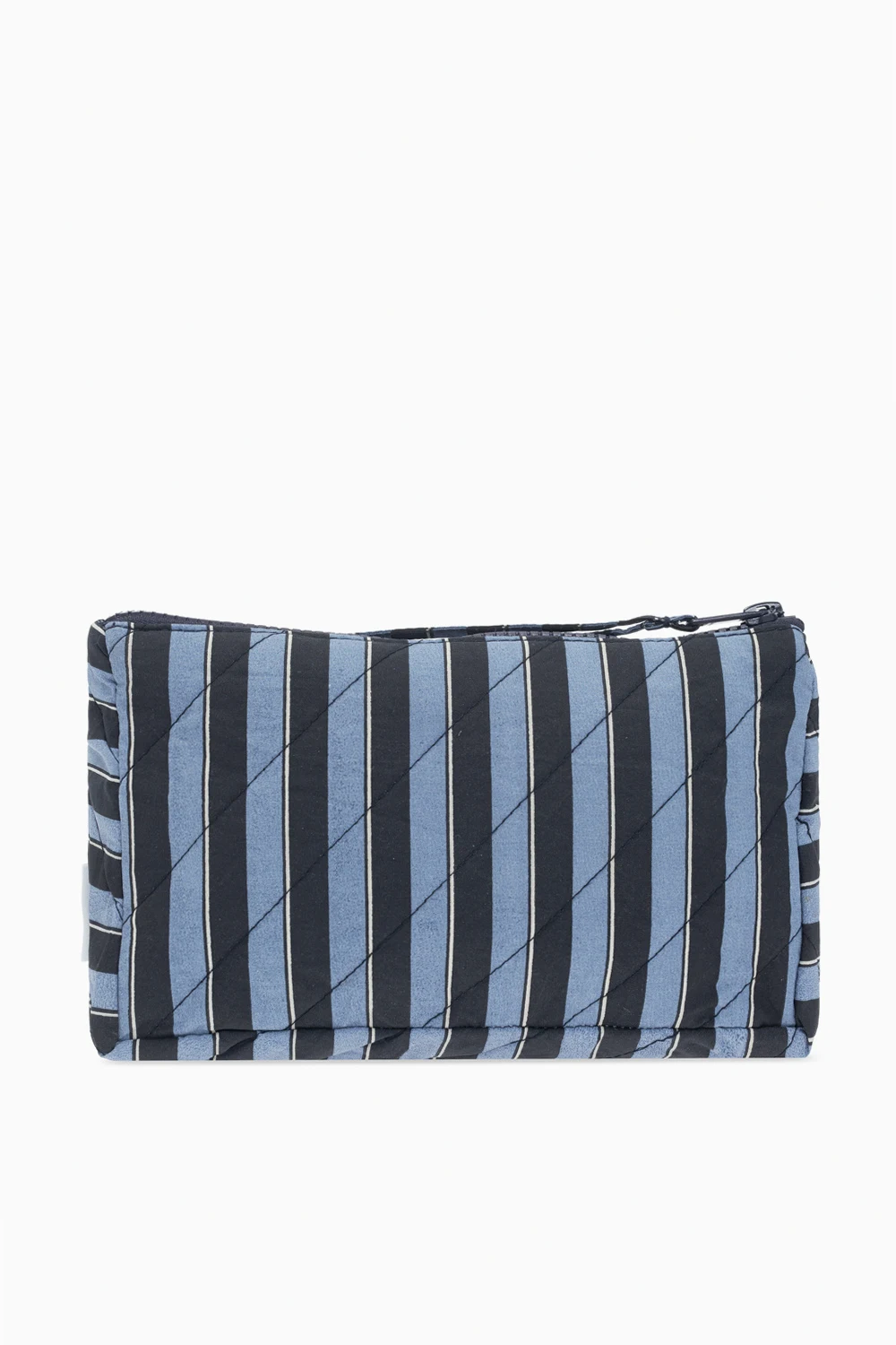 Blue, black and white wash bag from Ganni. Made of cotton, this design features a zip closure with a wrist strap, stripe pattern and one internal compartment with one slip pocket.