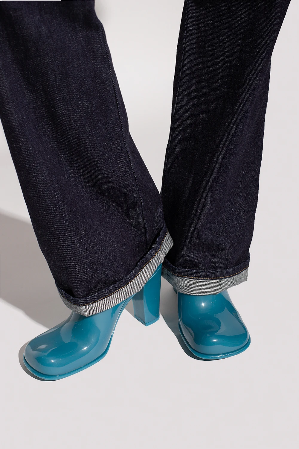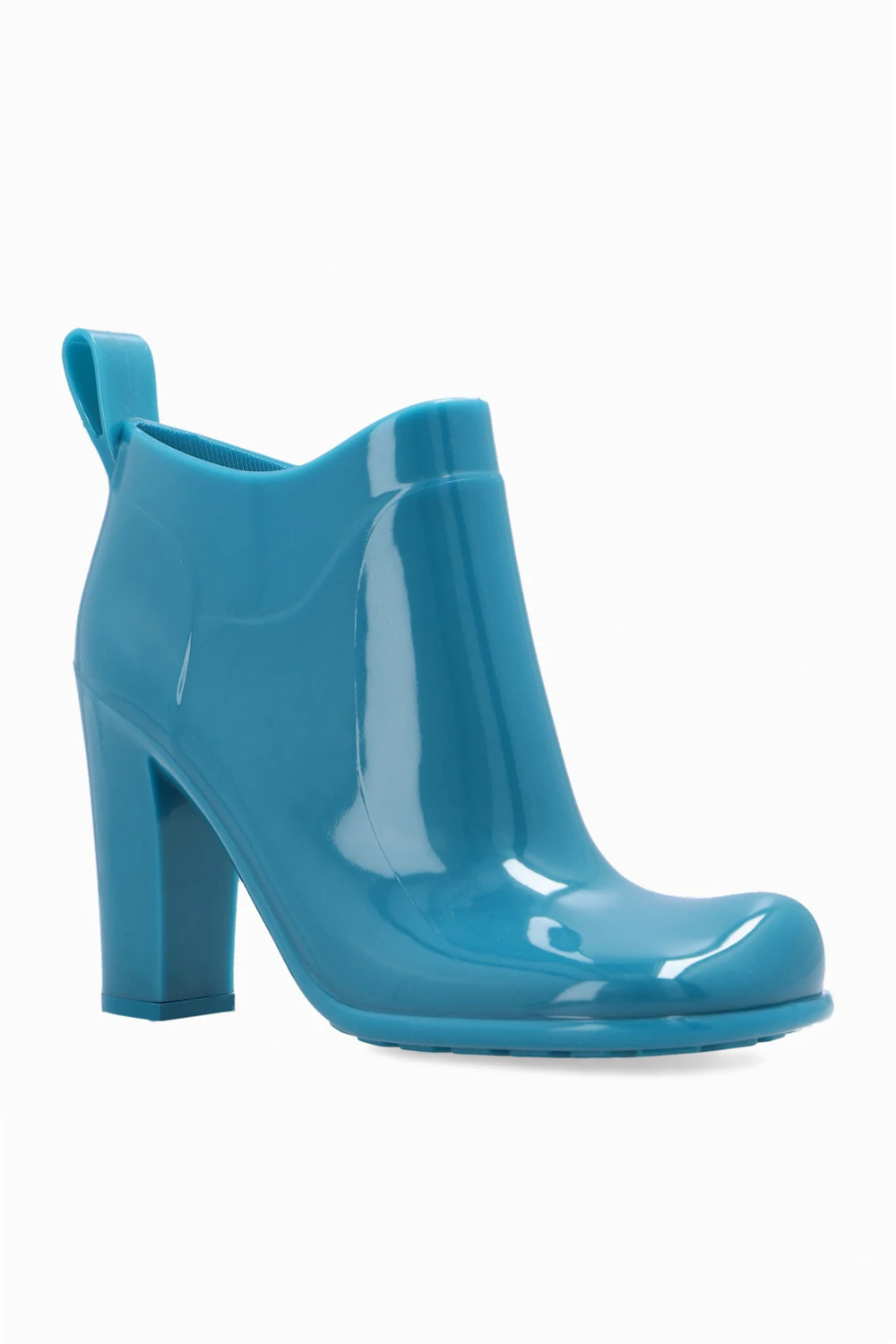 Blue ‘Shine’ rubber boots from Bottega Veneta. Resting on a blue rubber sole, this pair has a decorative toe.