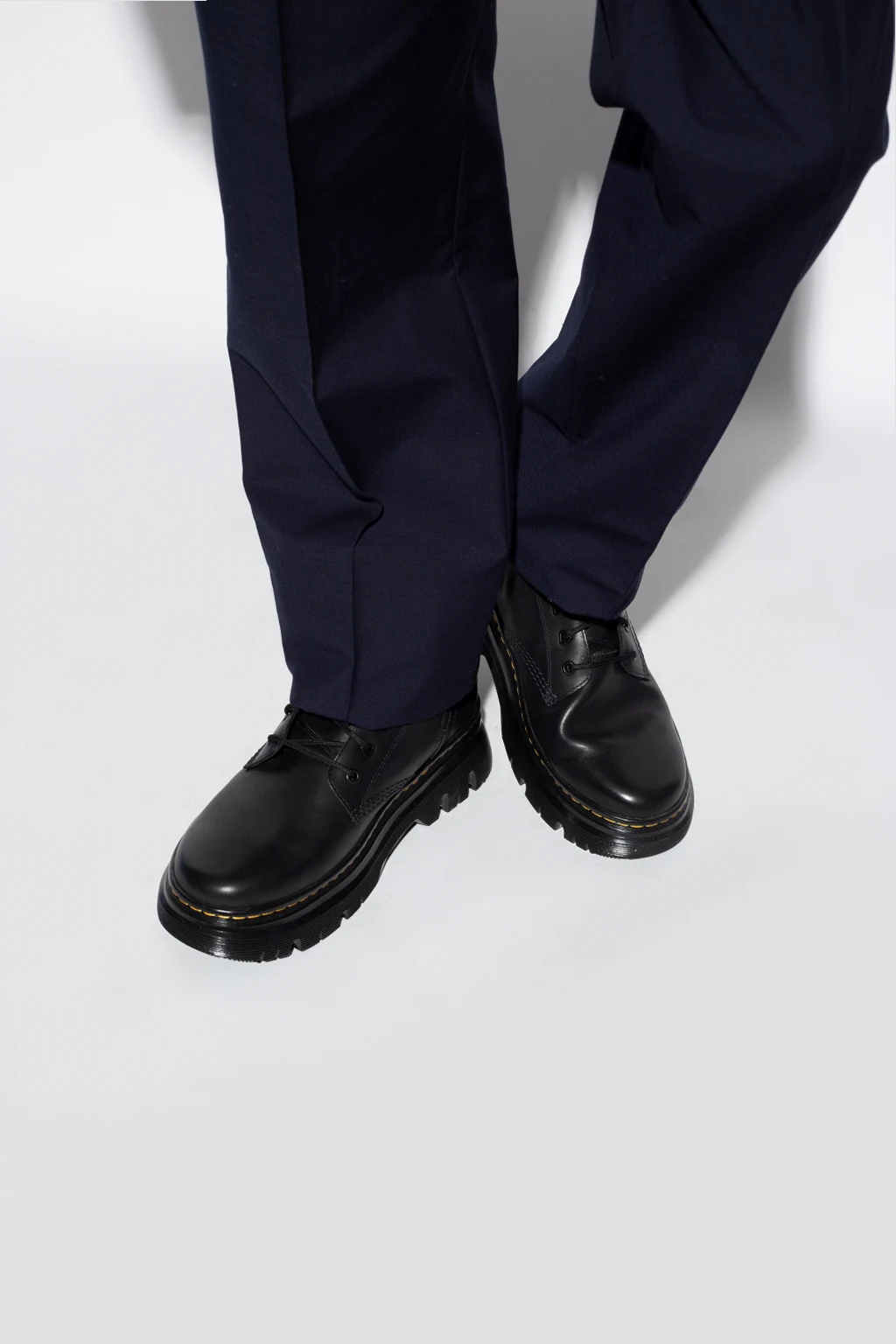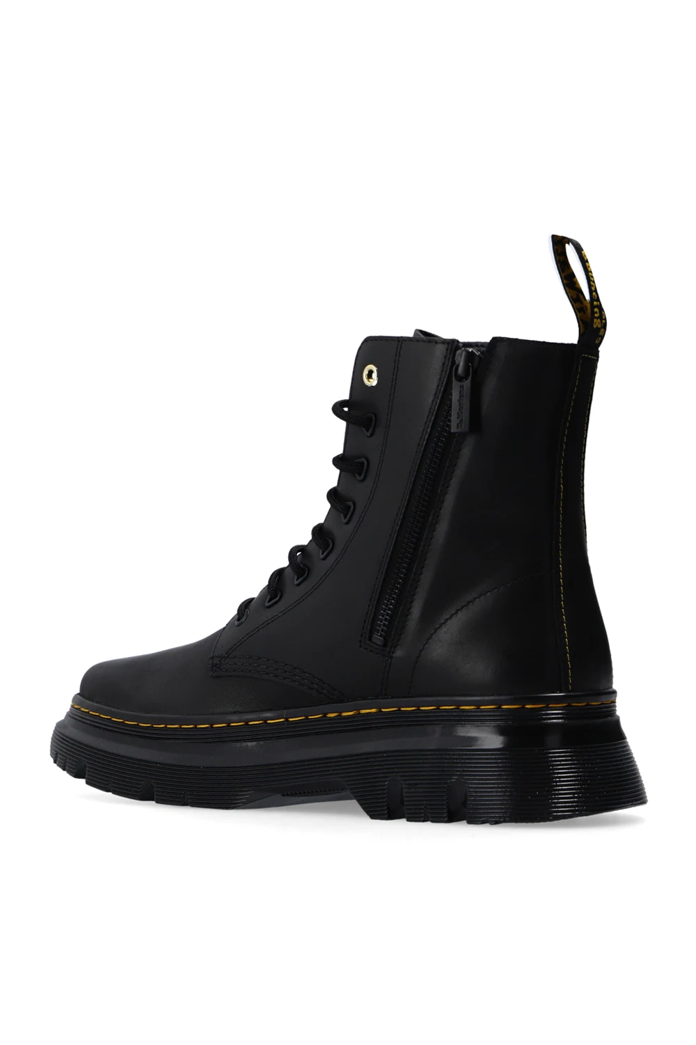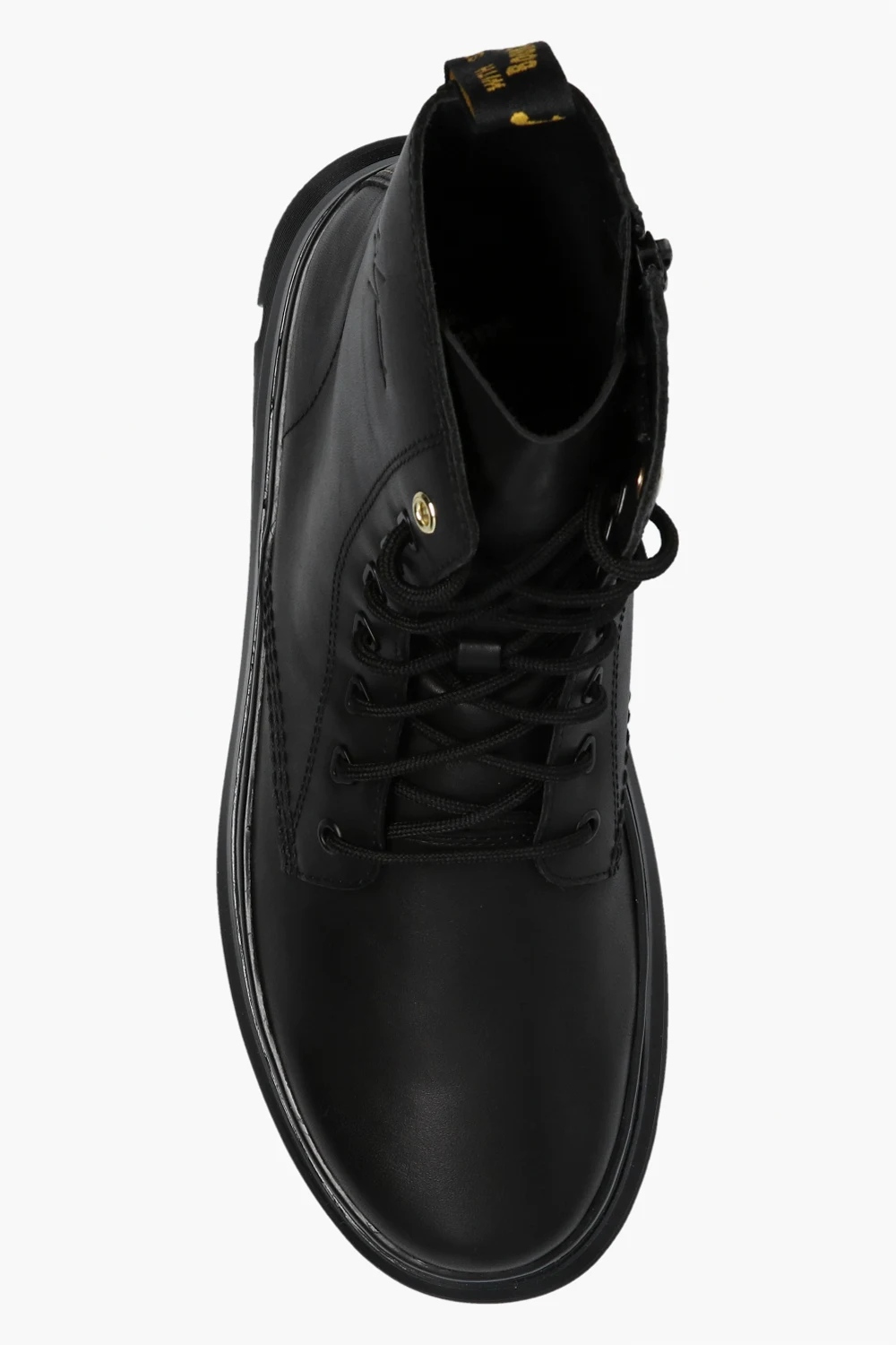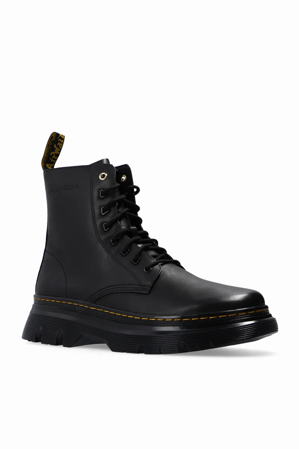 Black ankle boots from Yohji Yamamoto x Dr. Martens . Made of cow leather, this lace-up pair features a side zip, embossed logo, grosgrain strap and black rubber sole.