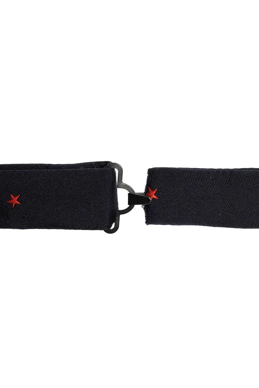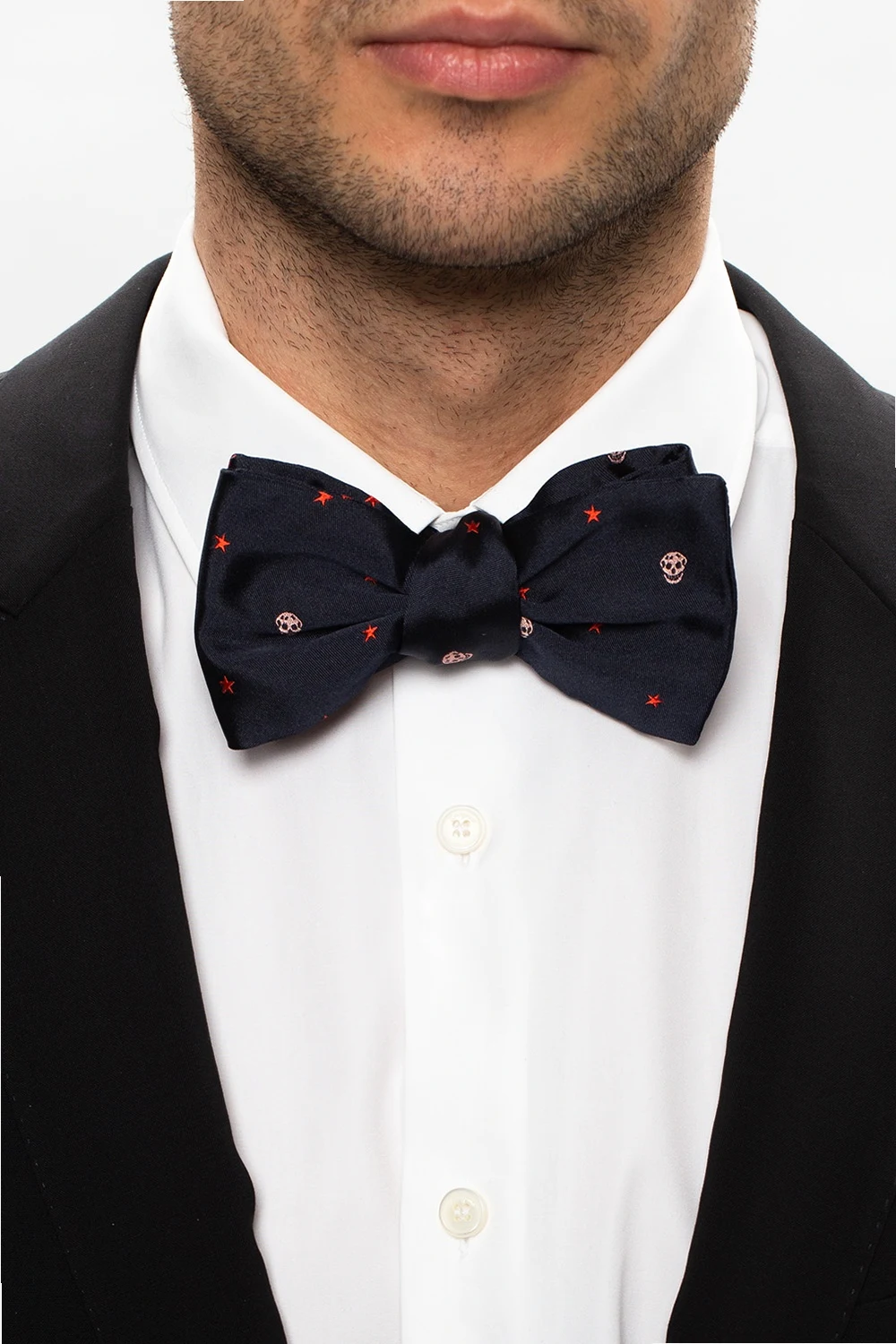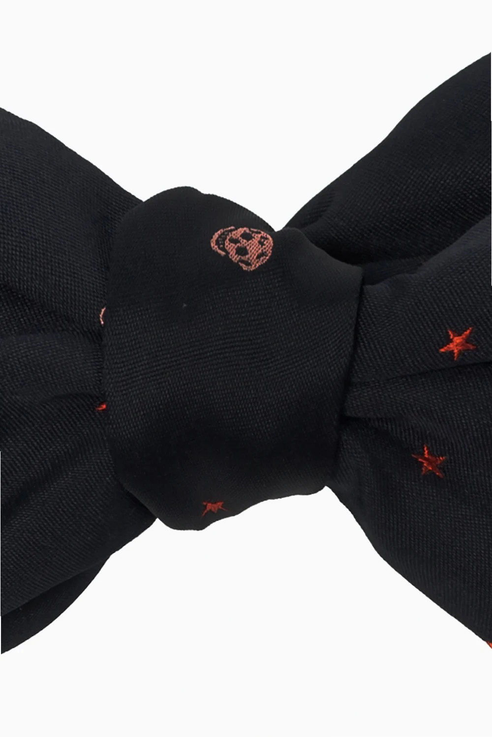 Navy blue bow tie from Alexander McQueen. Made of silk, this item showcases a pattern with the brand's signature motif of a skull. It secures with an adjustable hook closure.