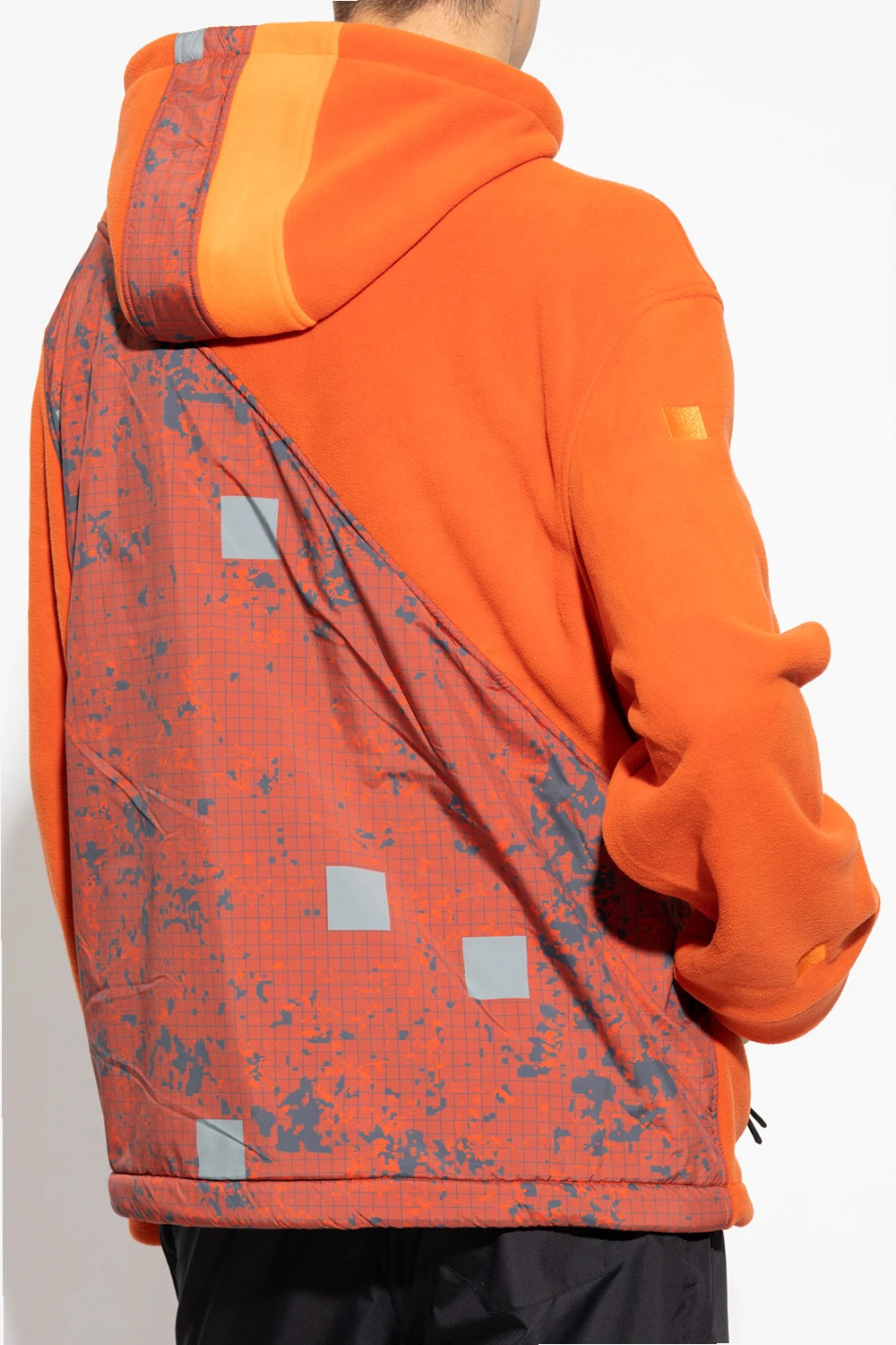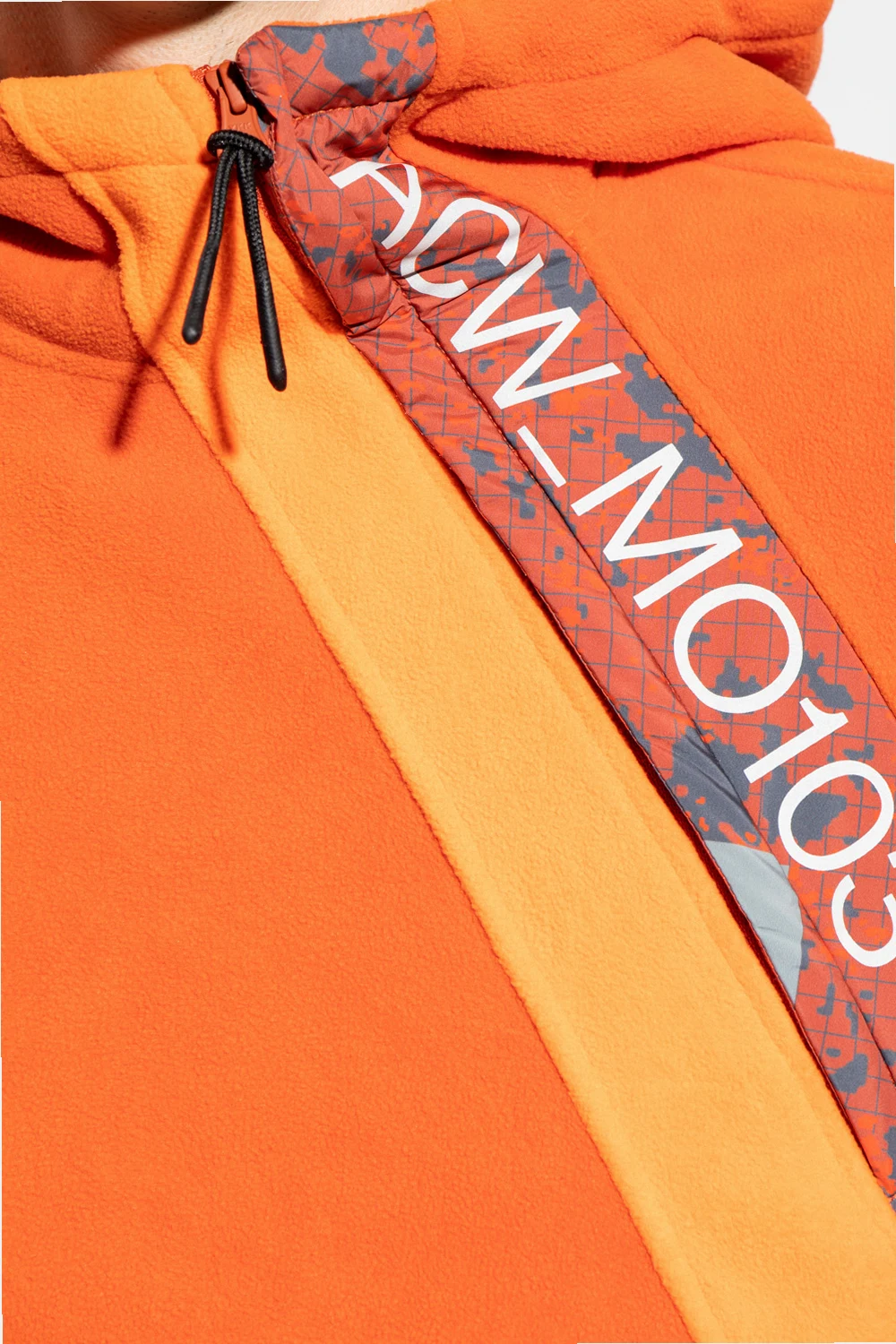 Orange fleece sweatshirt with a hood from A-COLD-WALL*. Emblazoned with a rubber logo patch, this style features a front zipper, decorative checked inserts, a reflective logo print in silver-tone, the brand's signature black patch on the shoulder and long sleeves with velcro adjusters.