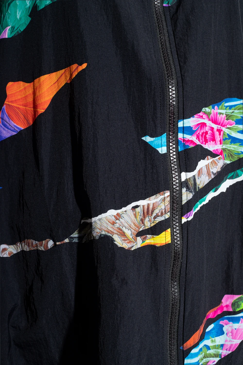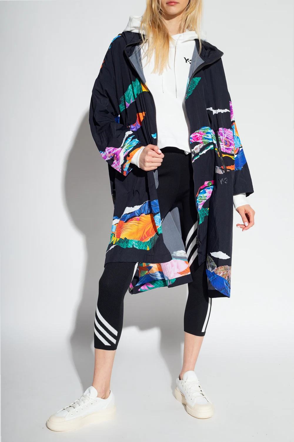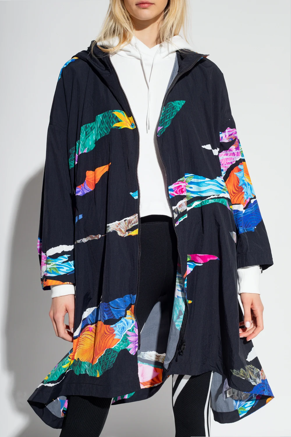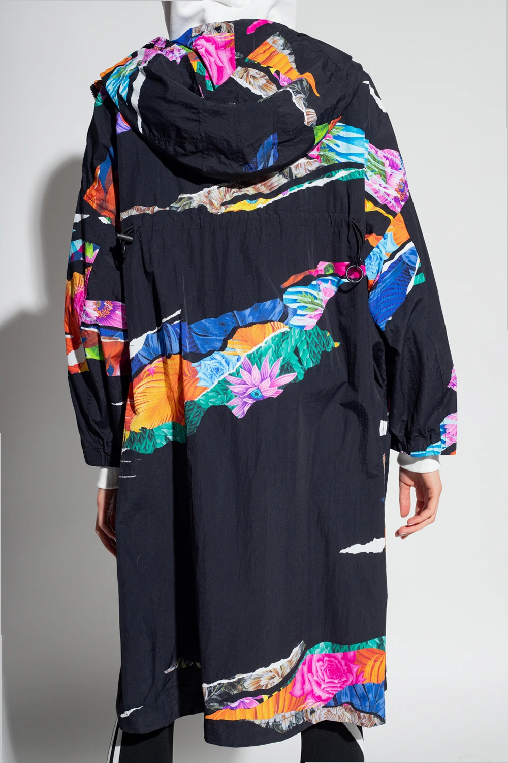 Black hooded oversize coat from Y-3 Yohji Yamamoto. Fastened with a two-way zip, this design features a multicolored printed floral pattern, two zip pockets, drawstrings at the back and ribbed cuffs.