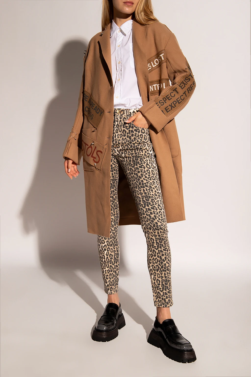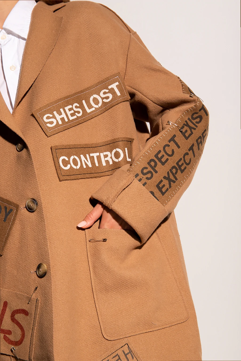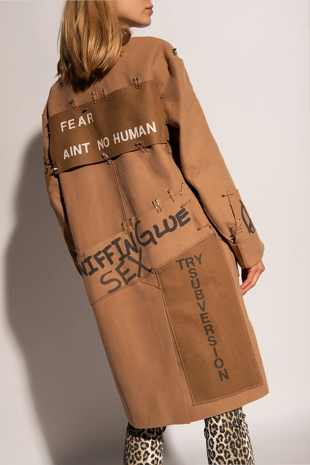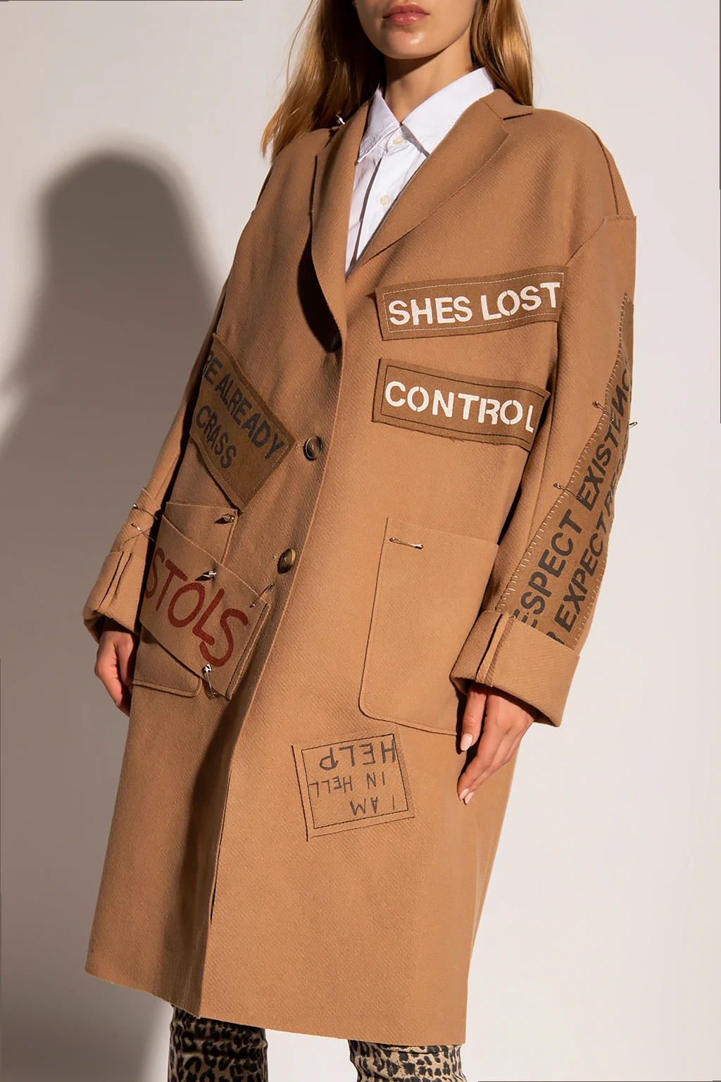 Beige coat with notch lapels from R13. Made of wool, this garment features button fastenings, printed and appliquéd patch, two front pockets, long sleeves and a single rear vent.
