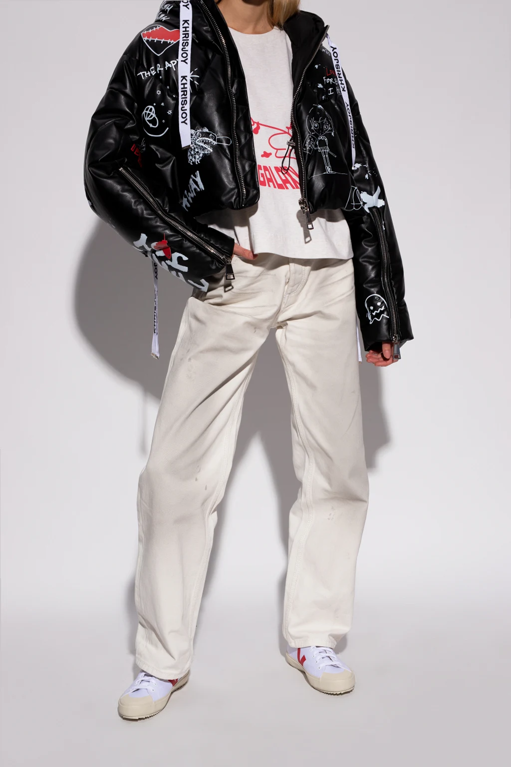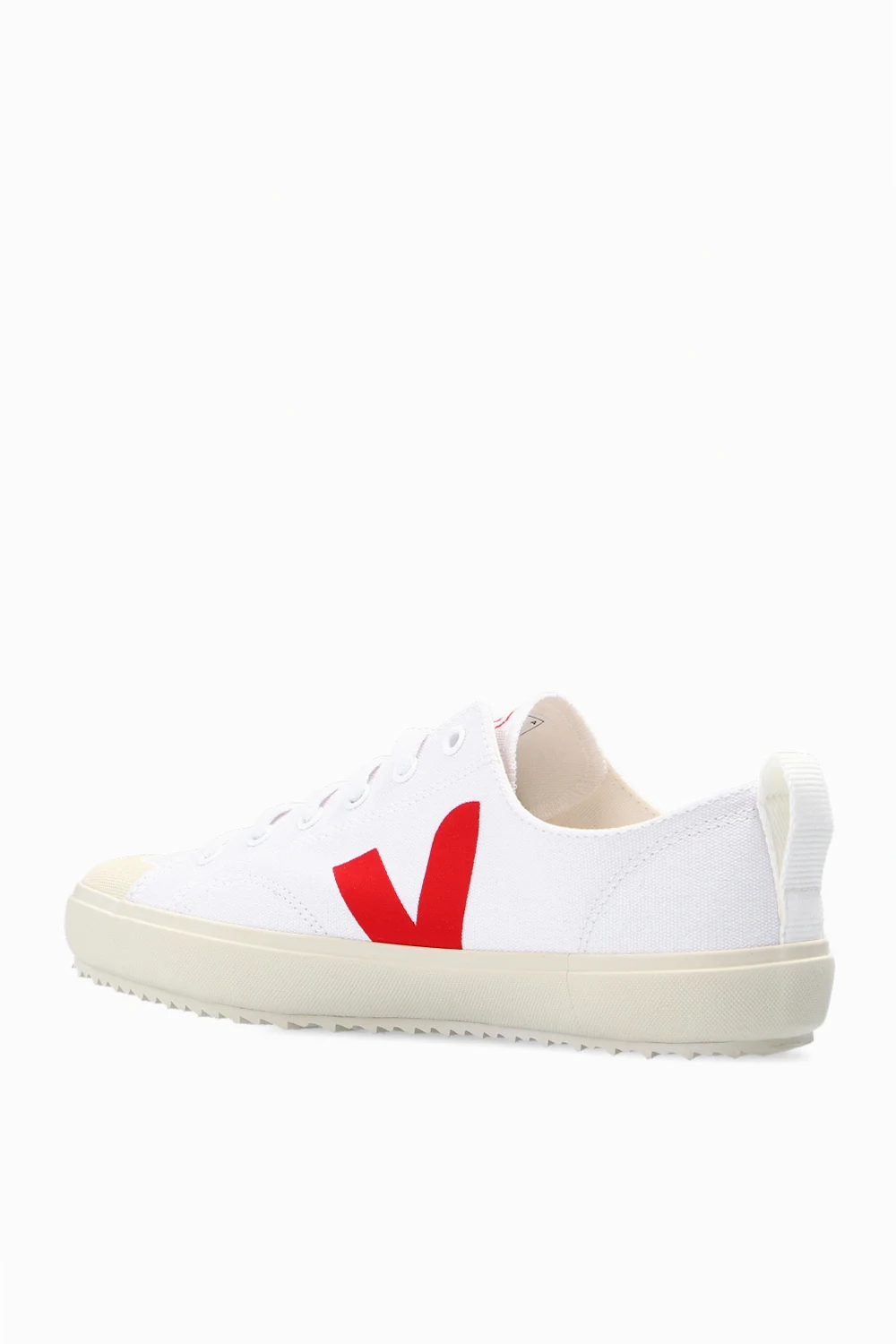 White ‘Nova’ sneakers from Veja. Crafted from canvas, this lace-up pair is decorated with a red logo print. The insole is produced from wild rubber, sugar cane, Amazon rubber, organic cotton and recycled EVA. It is set on a cream rubber sole made from organic and recycled materials.