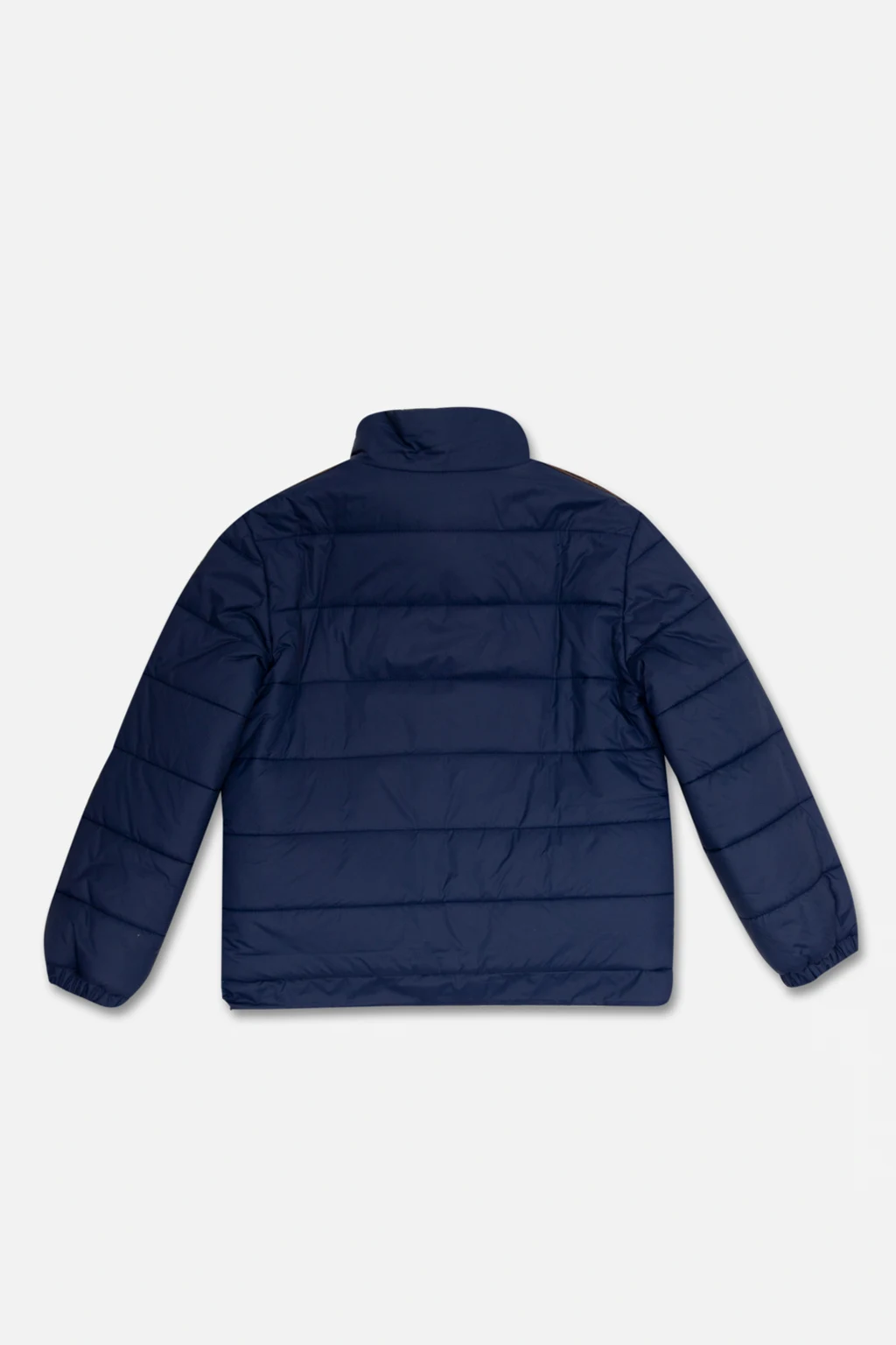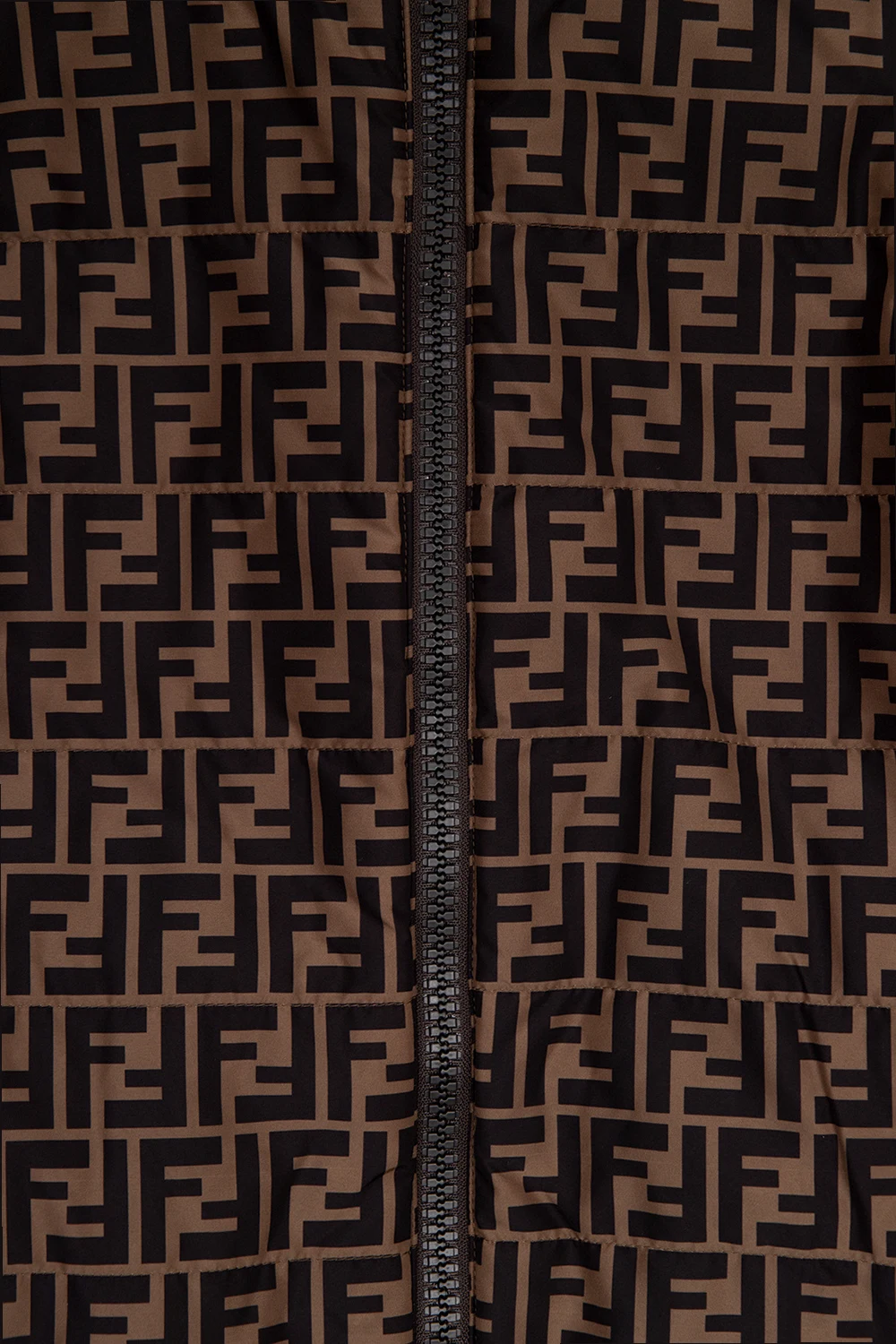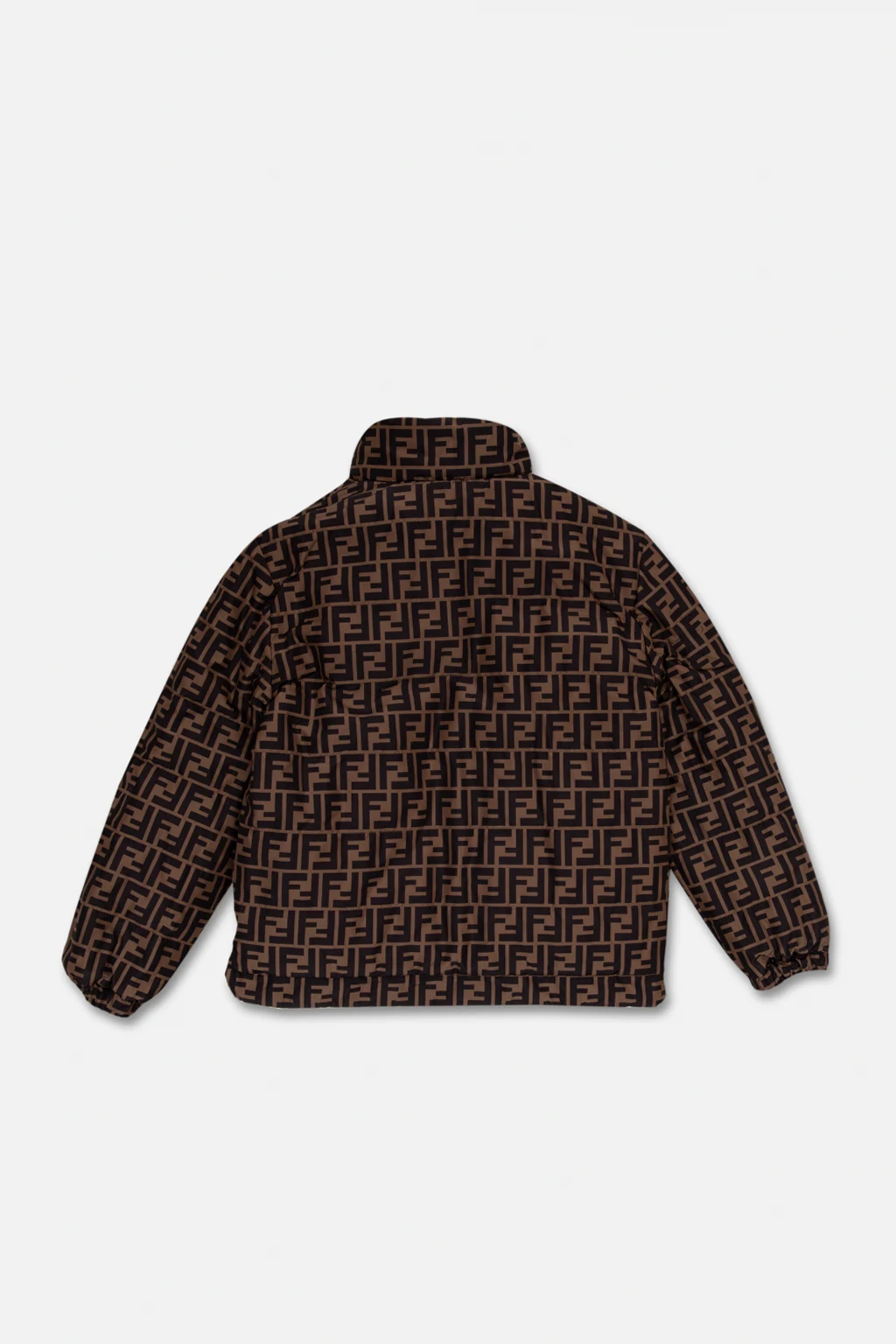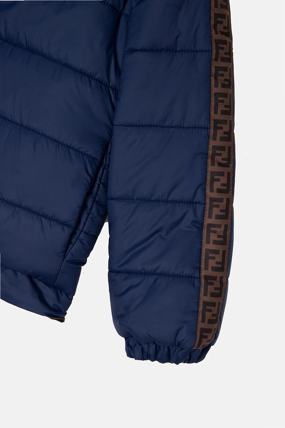 Navy quilted reversible jacket from Fendi Kids. Fastened with a zip, this garment is complete with two slip pockets, drawstring hem, long sleeves with ribbed cuffs and lining decorated with a monogram pattern.