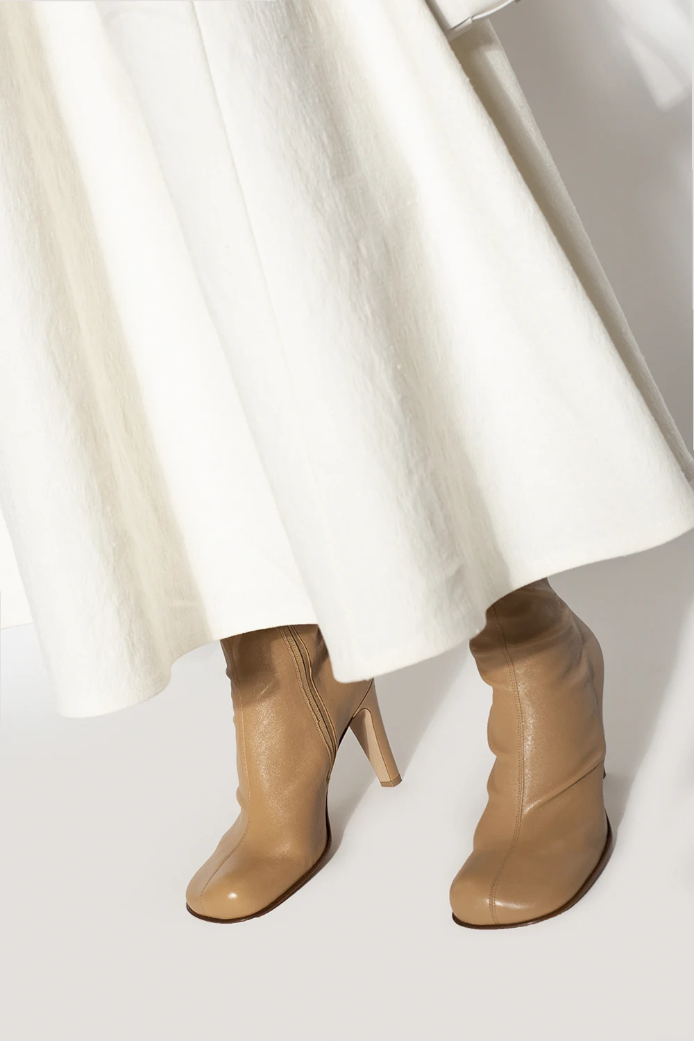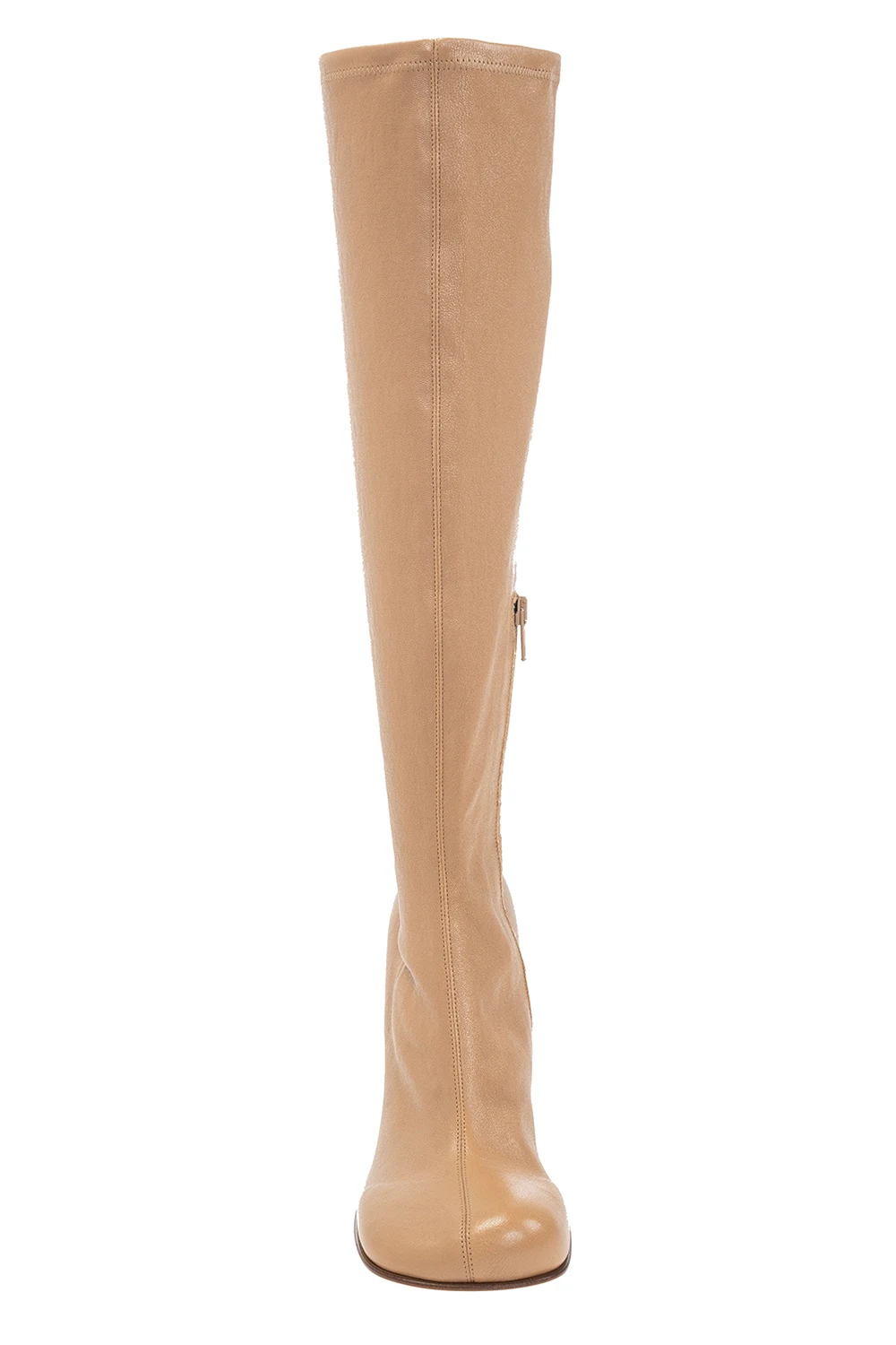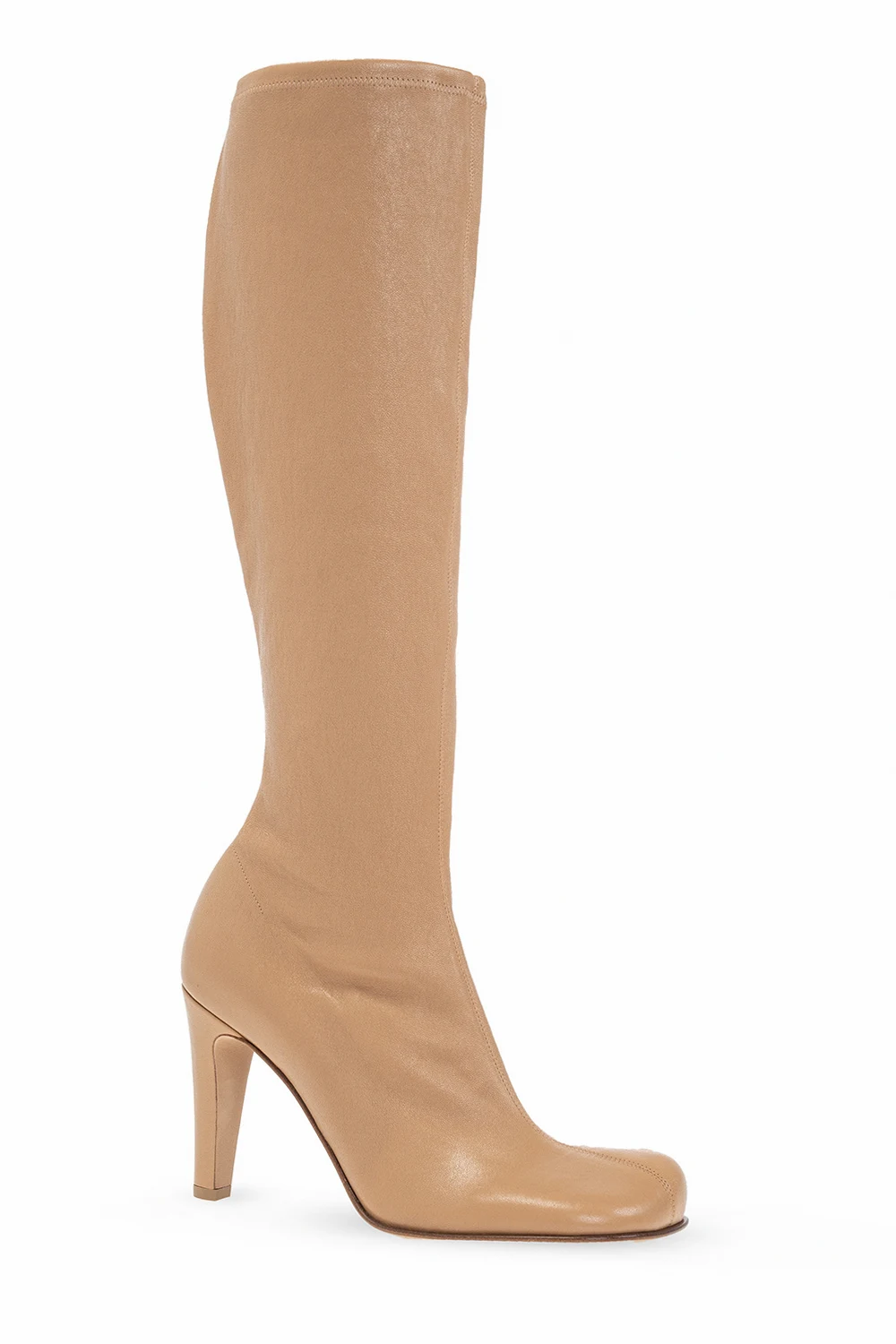 Beige ‘Bloc’ heeled knee-high boots from Bottega Veneta. Crafted from lamb leather, this model sits on a beige leather sole and features a side zip closure.